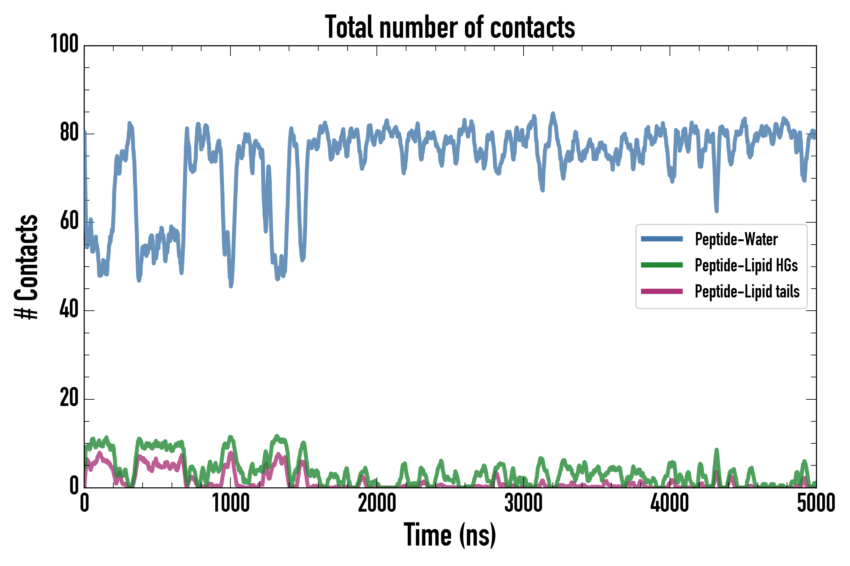 Number of contacts between each residue of the peptide backbone and the different lipid types, averaged over the last microsecond and using a cut-off of 0.6 nm.