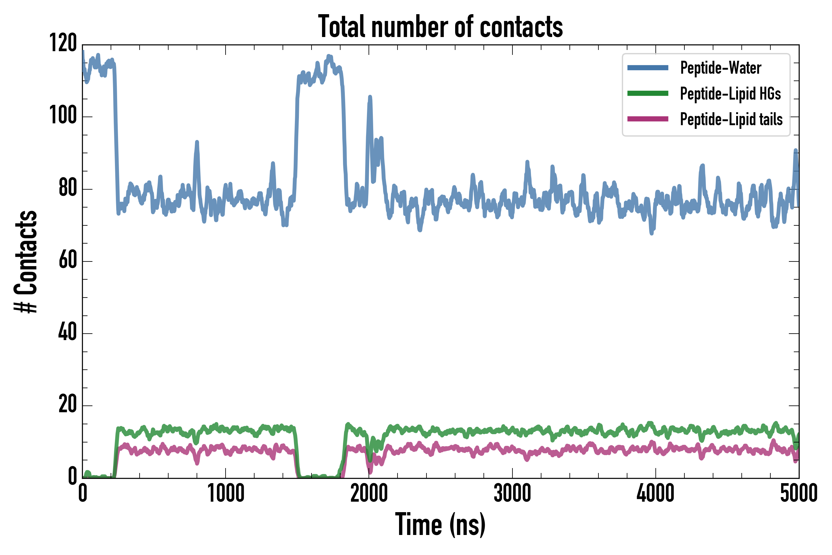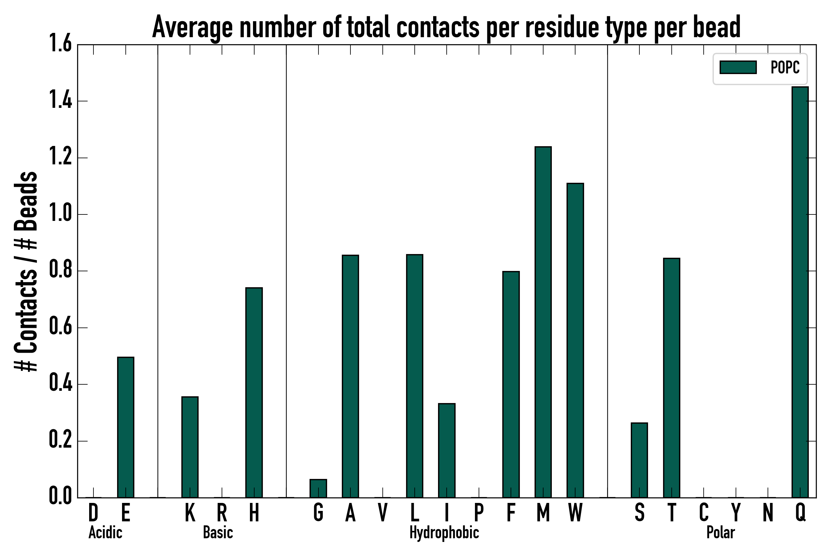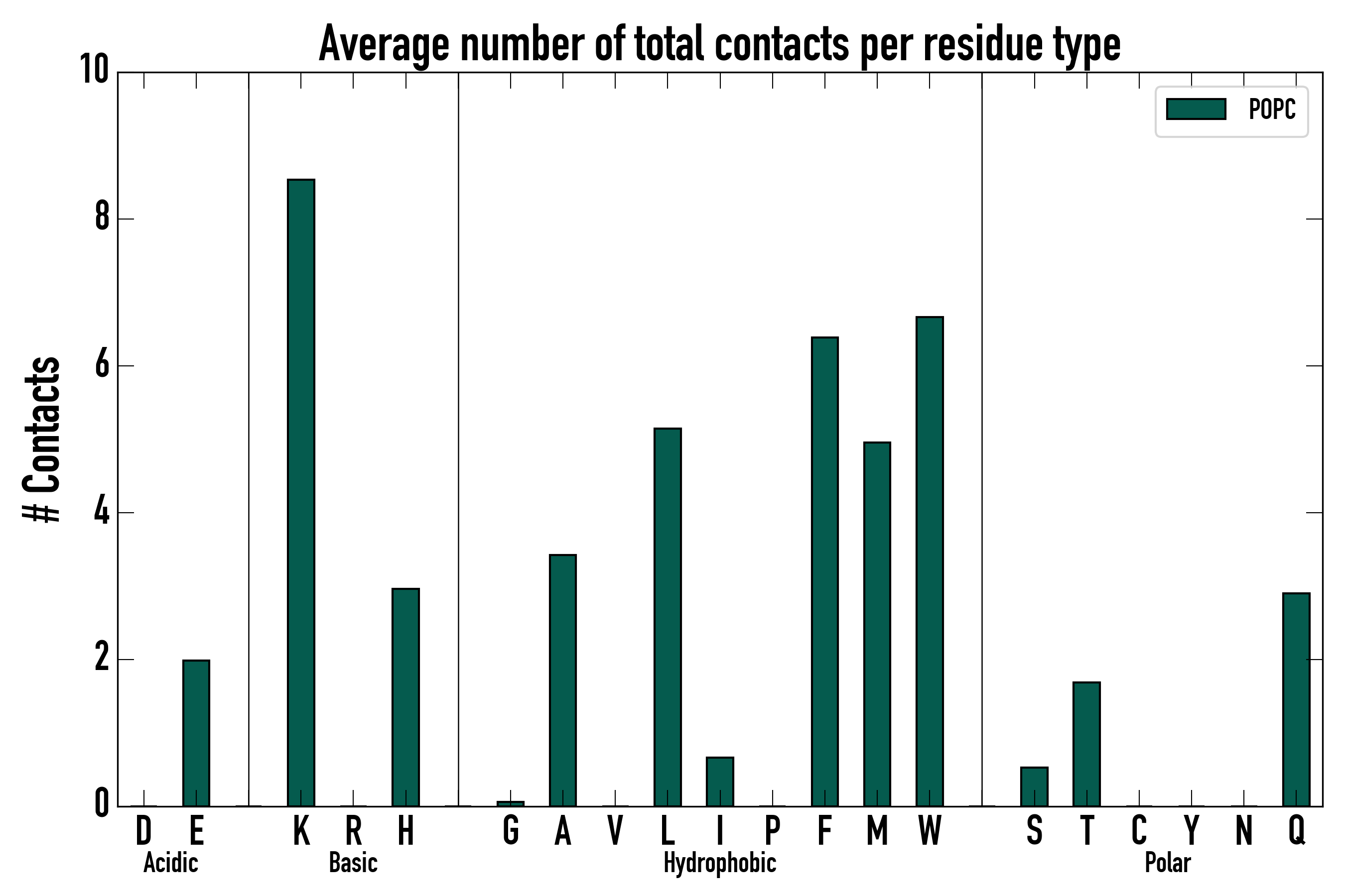 Number of contacts between each residue of the peptide backbone and the different lipid types, averaged over the last microsecond and using a cut-off of 0.6 nm.