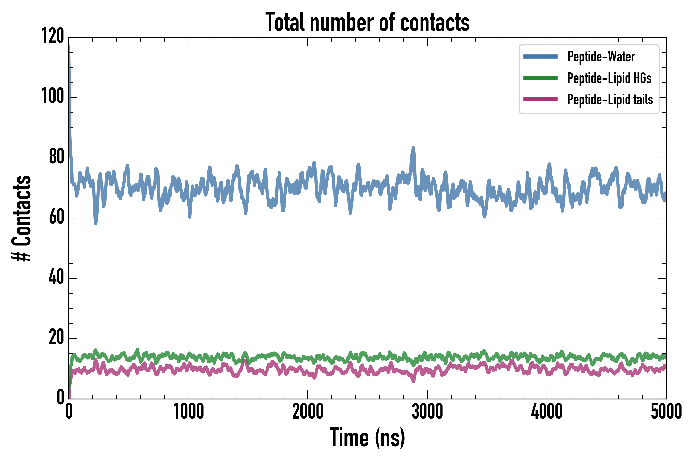 Number of contacts between each residue of the peptide backbone and the different lipid types, averaged over the last microsecond and using a cut-off of 0.6 nm.