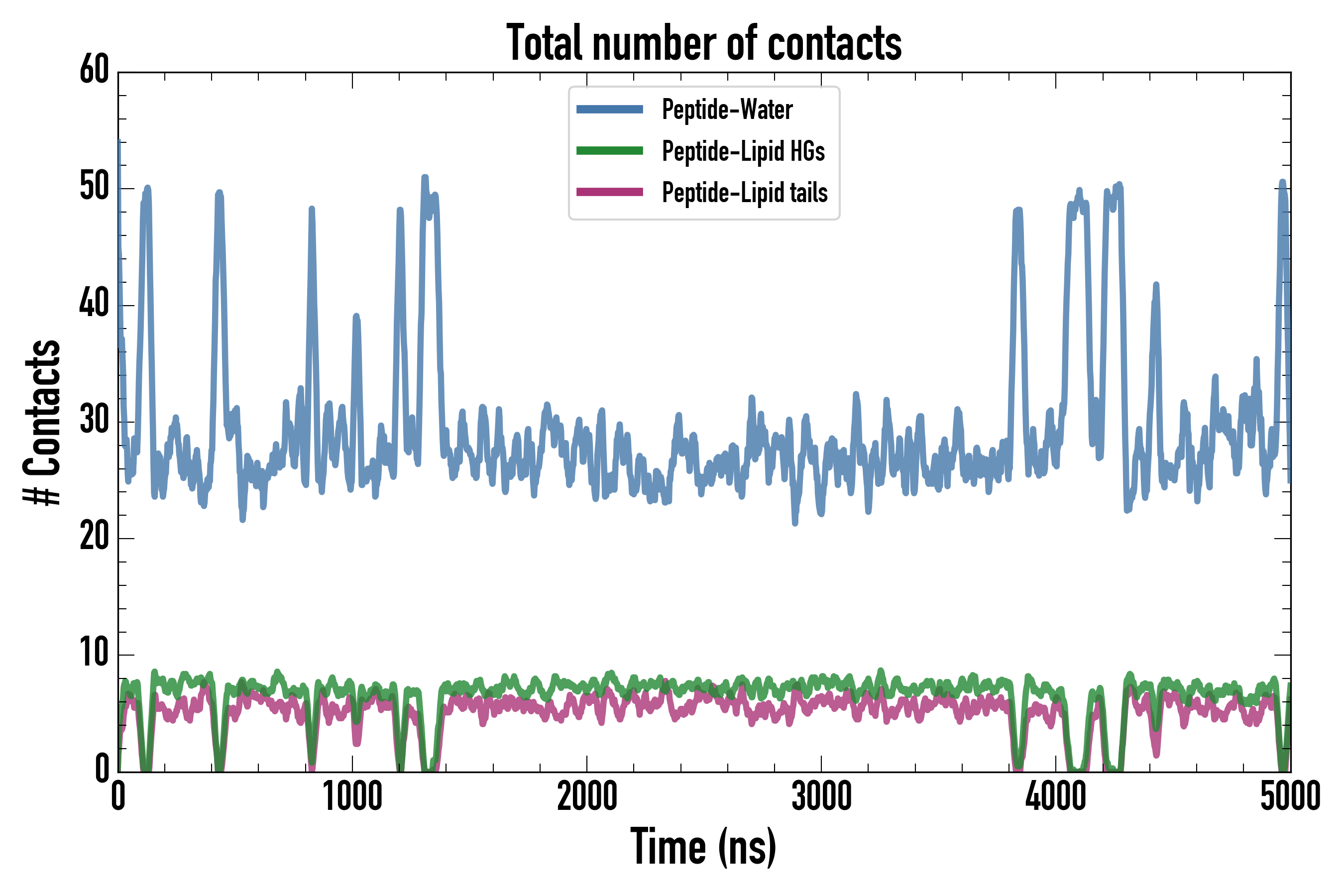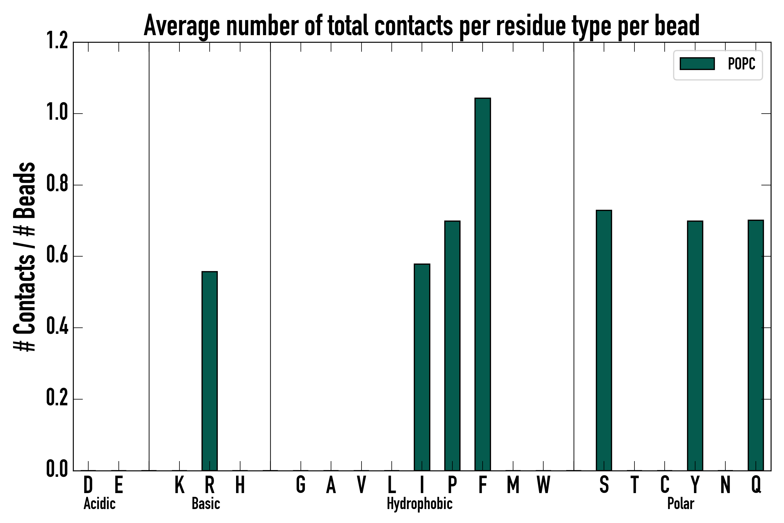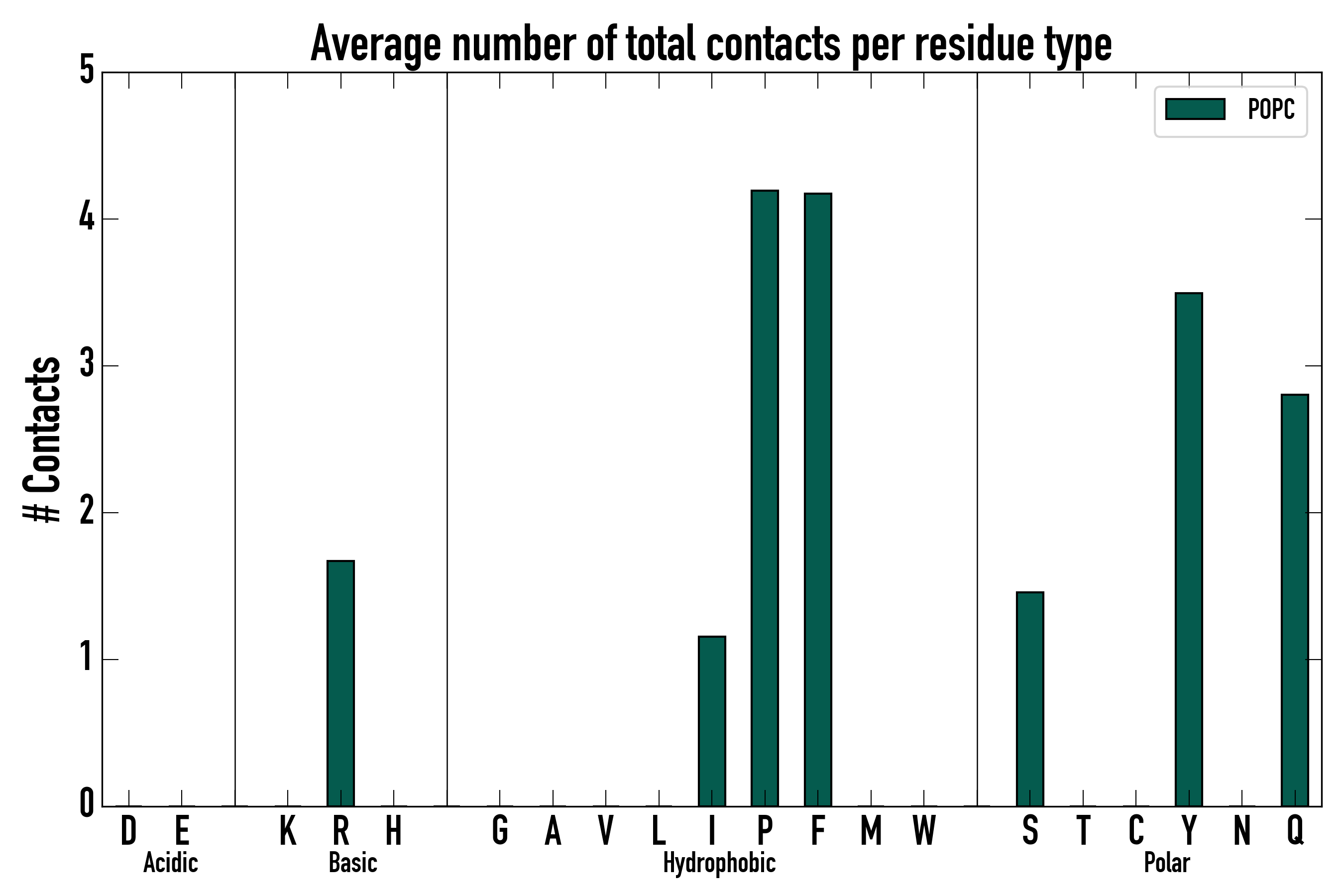 Number of contacts between each residue of the peptide backbone and the different lipid types, averaged over the last microsecond and using a cut-off of 0.6 nm.