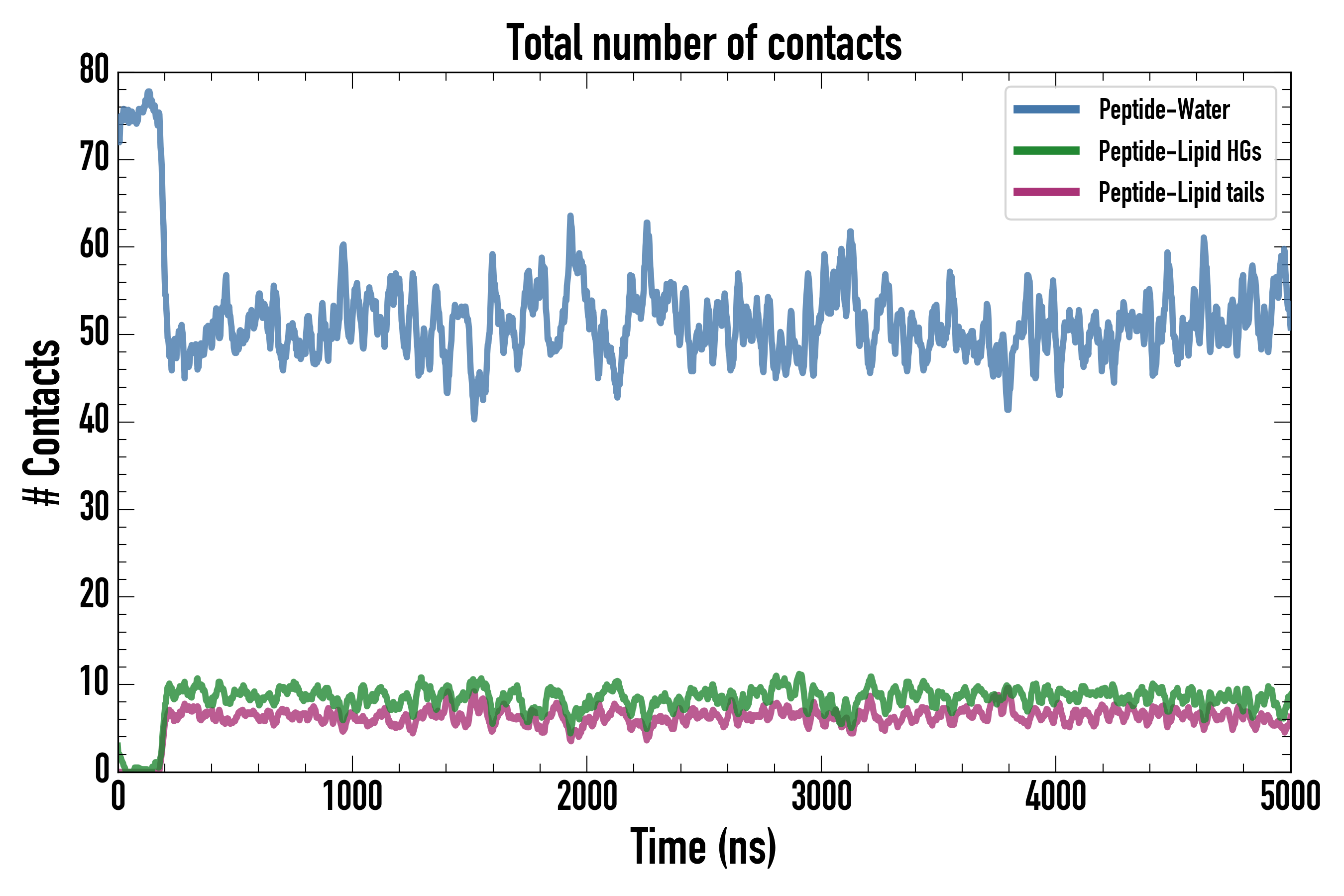 Number of contacts between each residue of the peptide backbone and the different lipid types, averaged over the last microsecond and using a cut-off of 0.6 nm.