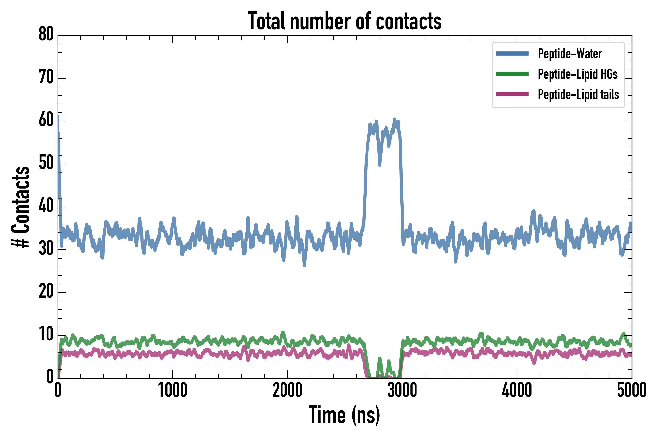 Number of contacts between each residue of the peptide backbone and the different lipid types, averaged over the last microsecond and using a cut-off of 0.6 nm.