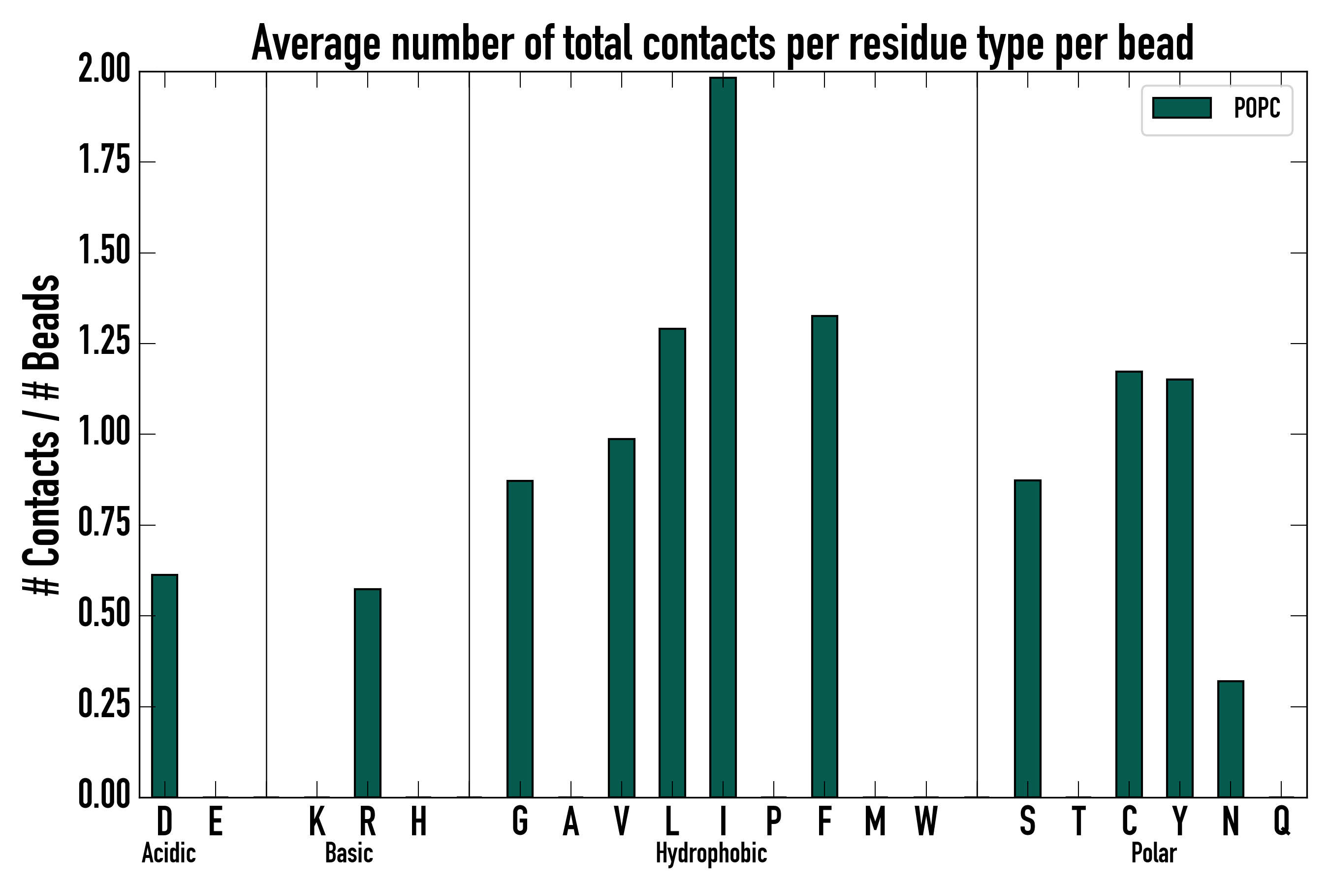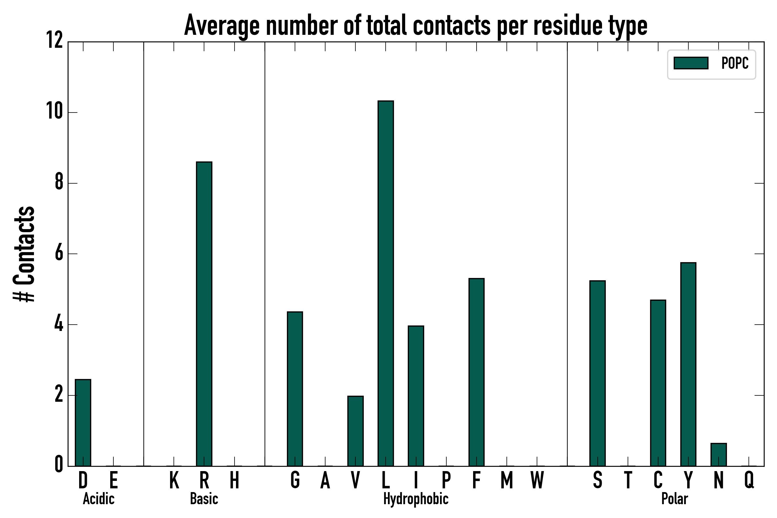 Number of contacts between each residue of the peptide backbone and the different lipid types, averaged over the last microsecond and using a cut-off of 0.6 nm.