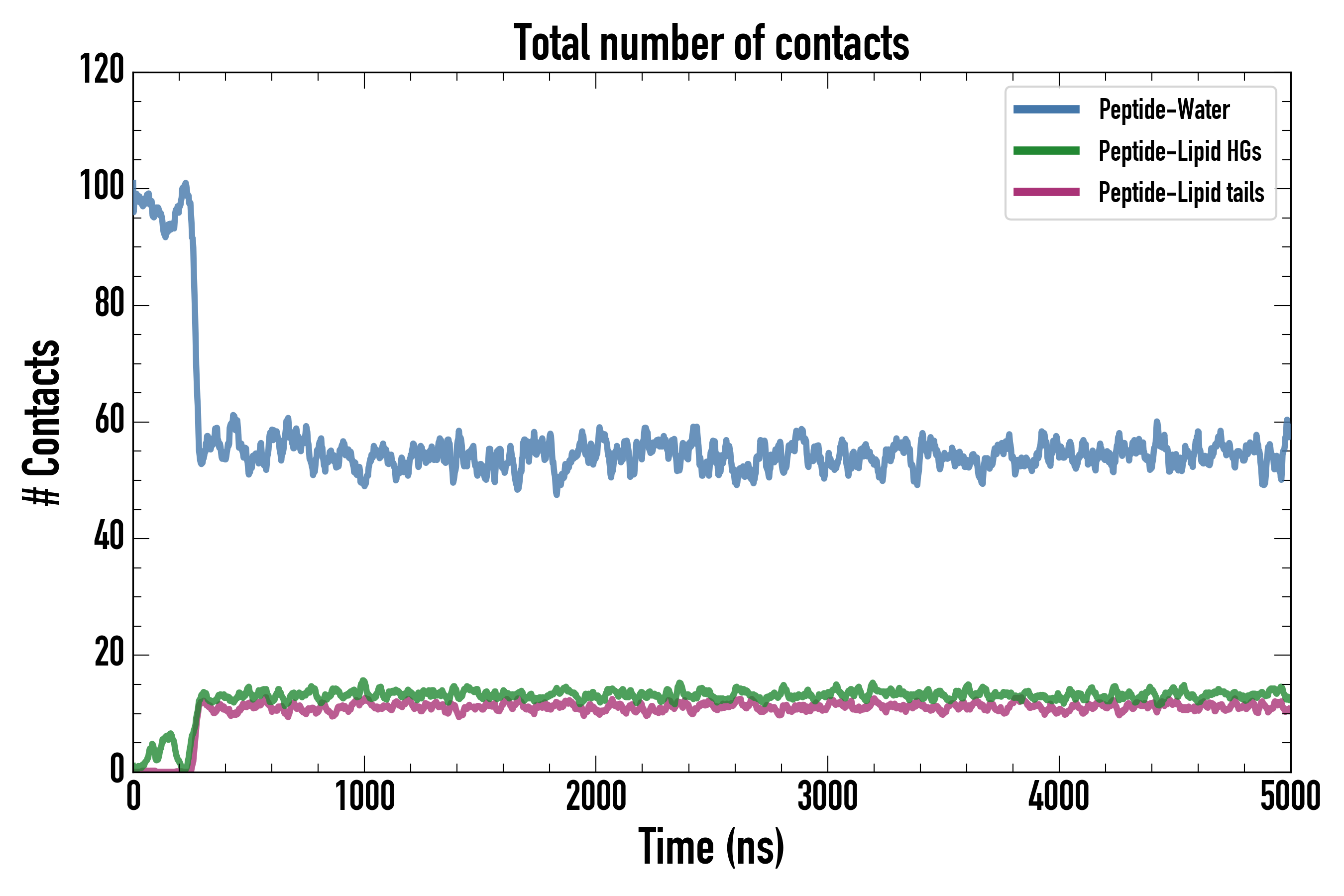 Number of contacts between each residue of the peptide backbone and the different lipid types, averaged over the last microsecond and using a cut-off of 0.6 nm.