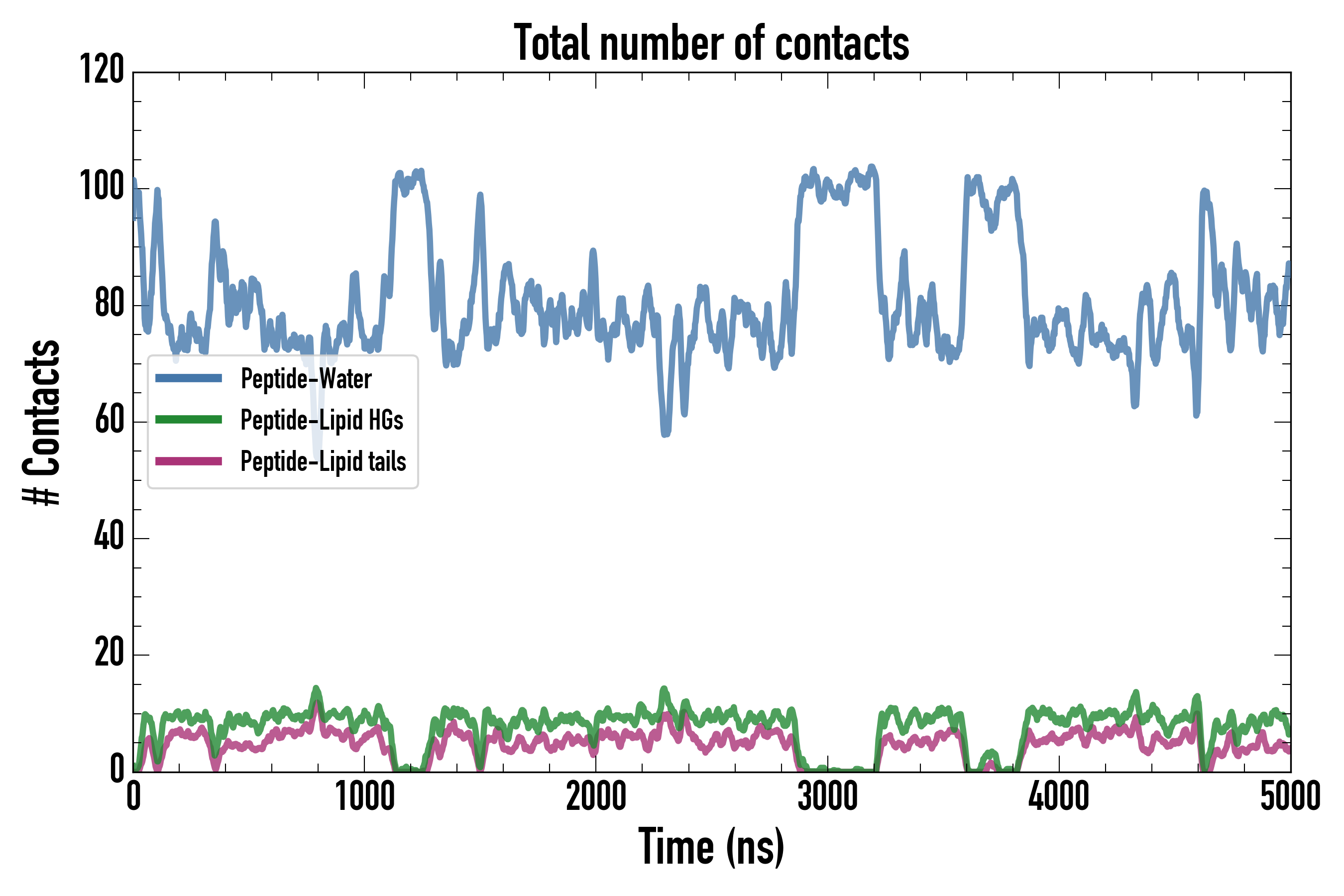 Number of contacts between each residue of the peptide backbone and the different lipid types, averaged over the last microsecond and using a cut-off of 0.6 nm.