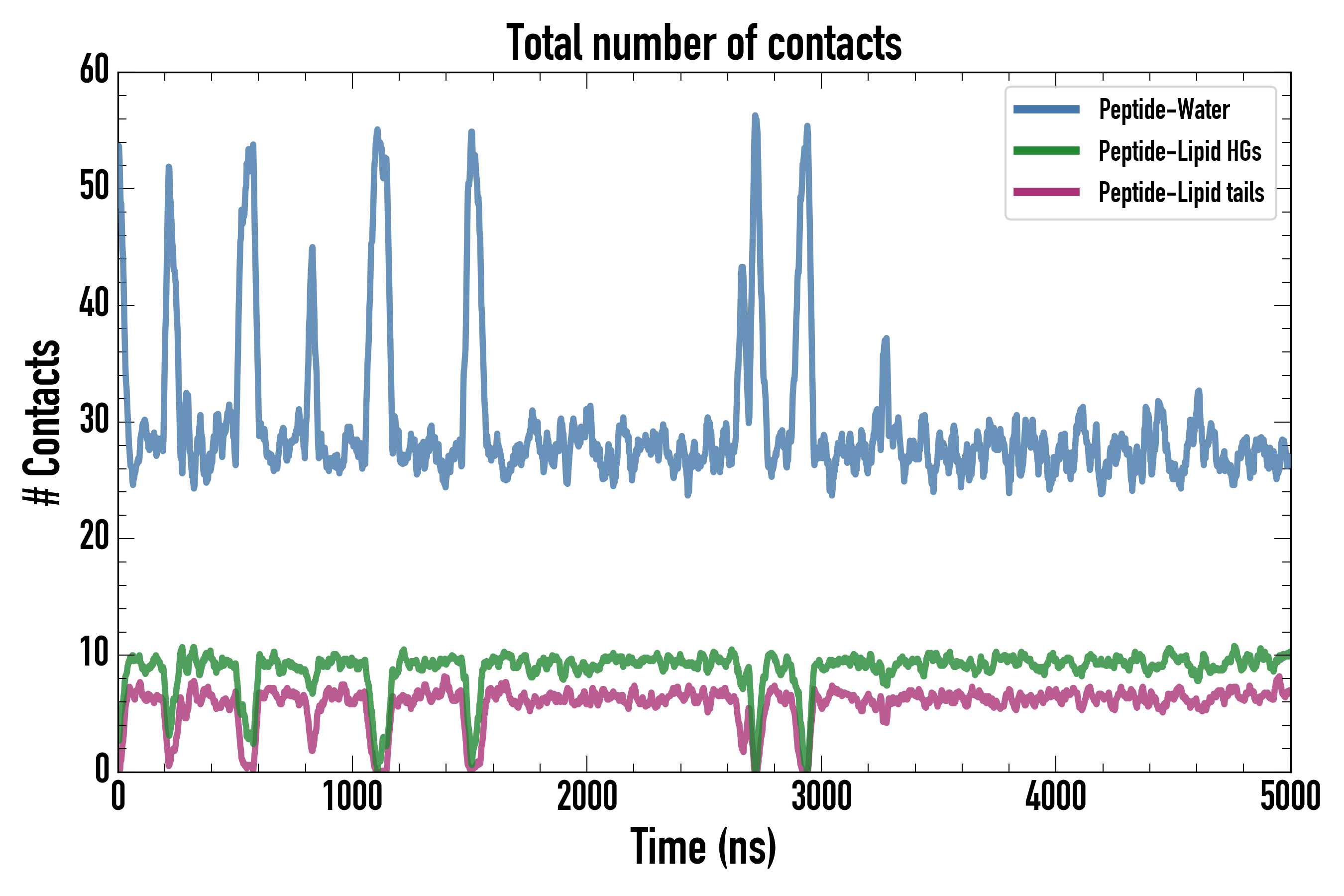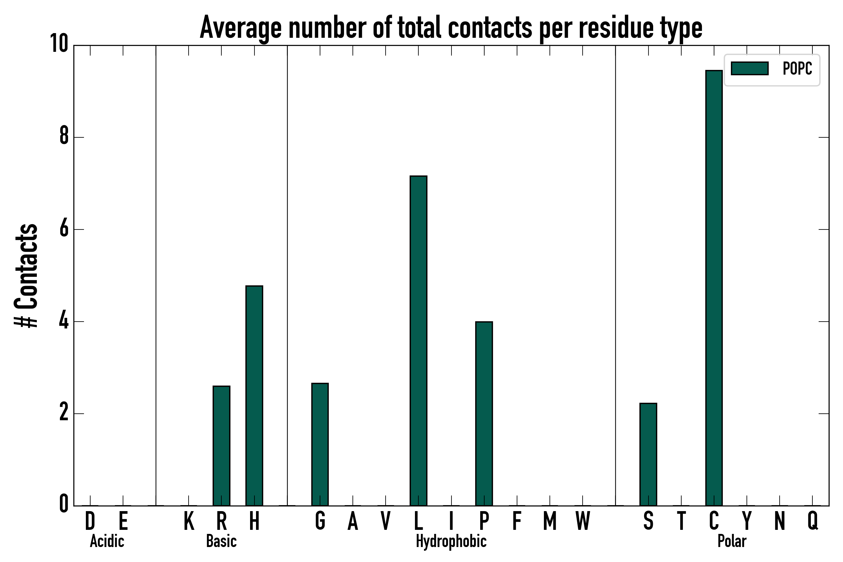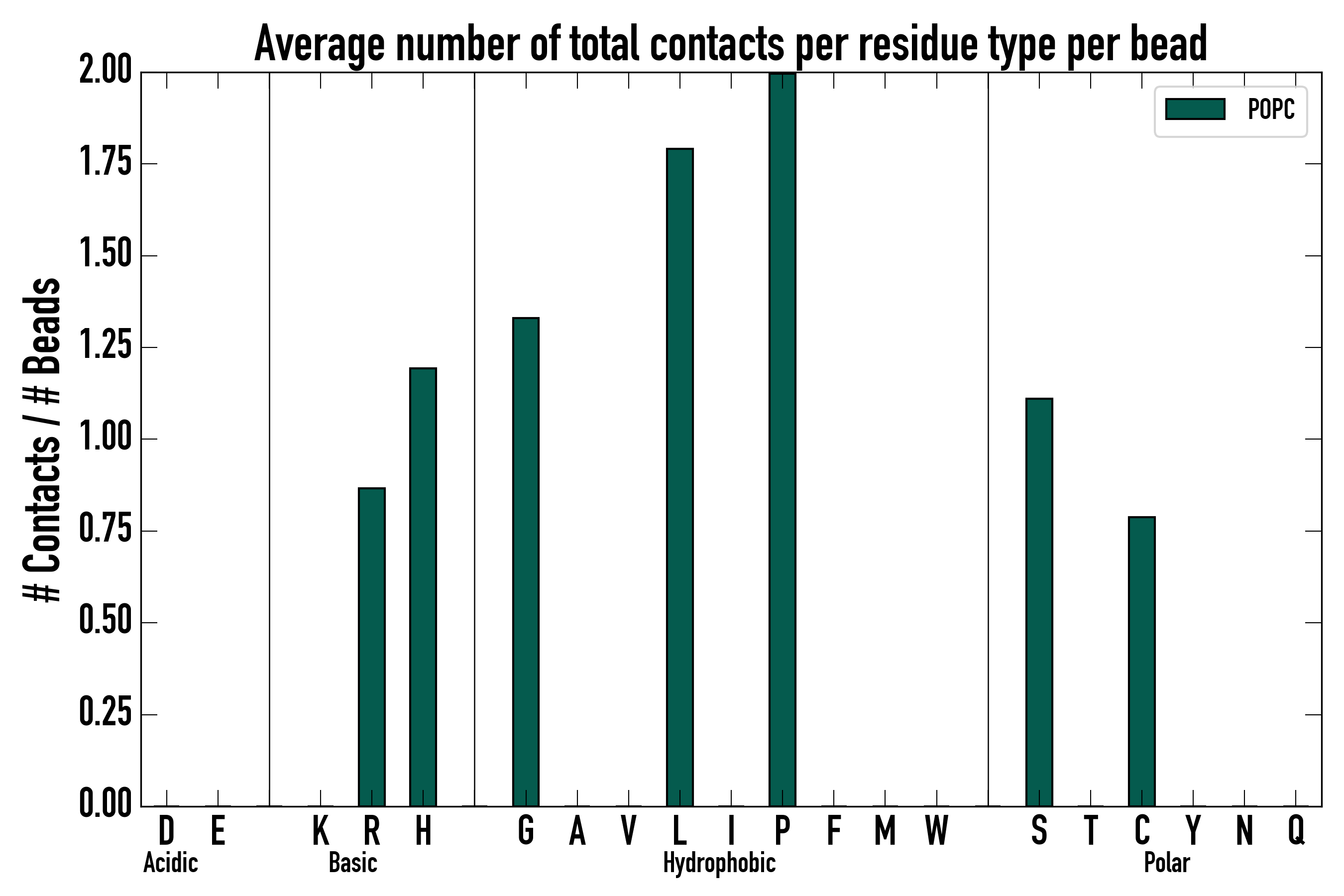 Number of contacts between each residue of the peptide backbone and the different lipid types, averaged over the last microsecond and using a cut-off of 0.6 nm.