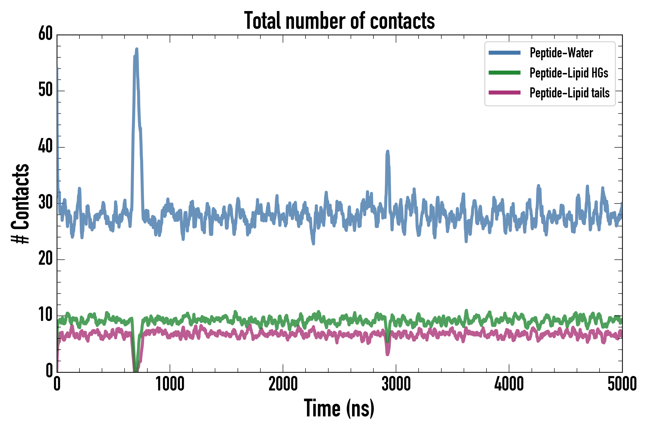 Number of contacts between each residue of the peptide backbone and the different lipid types, averaged over the last microsecond and using a cut-off of 0.6 nm.