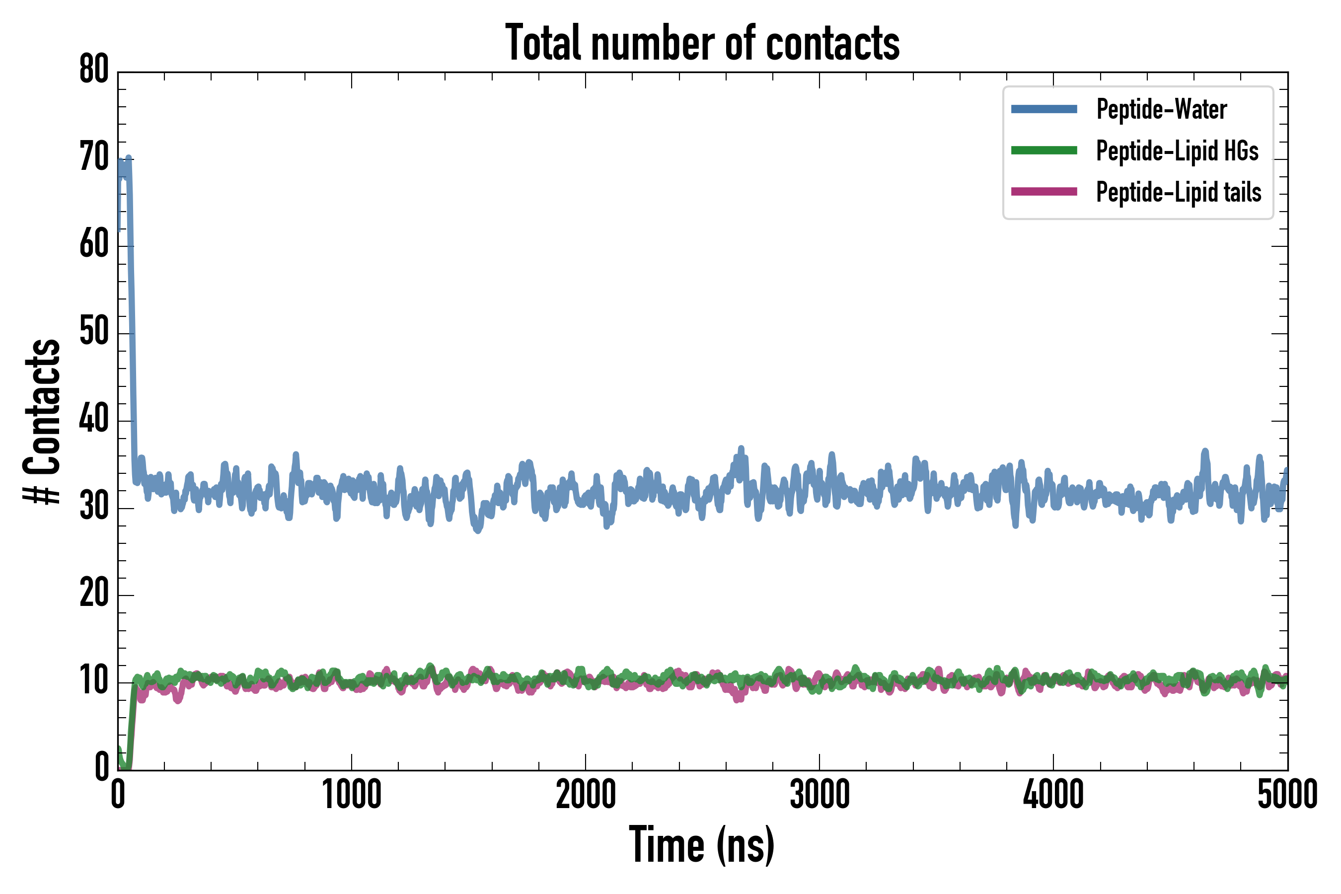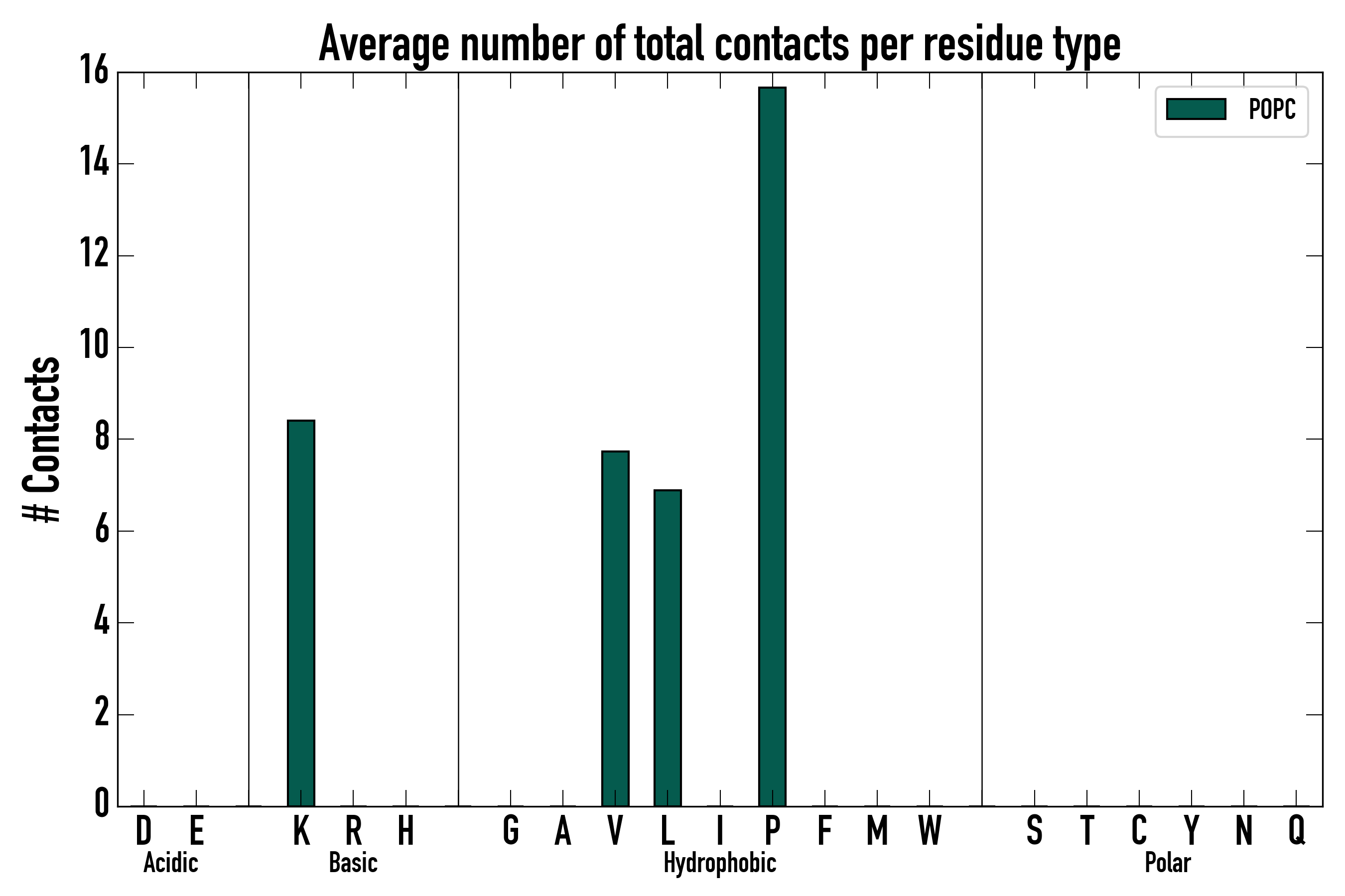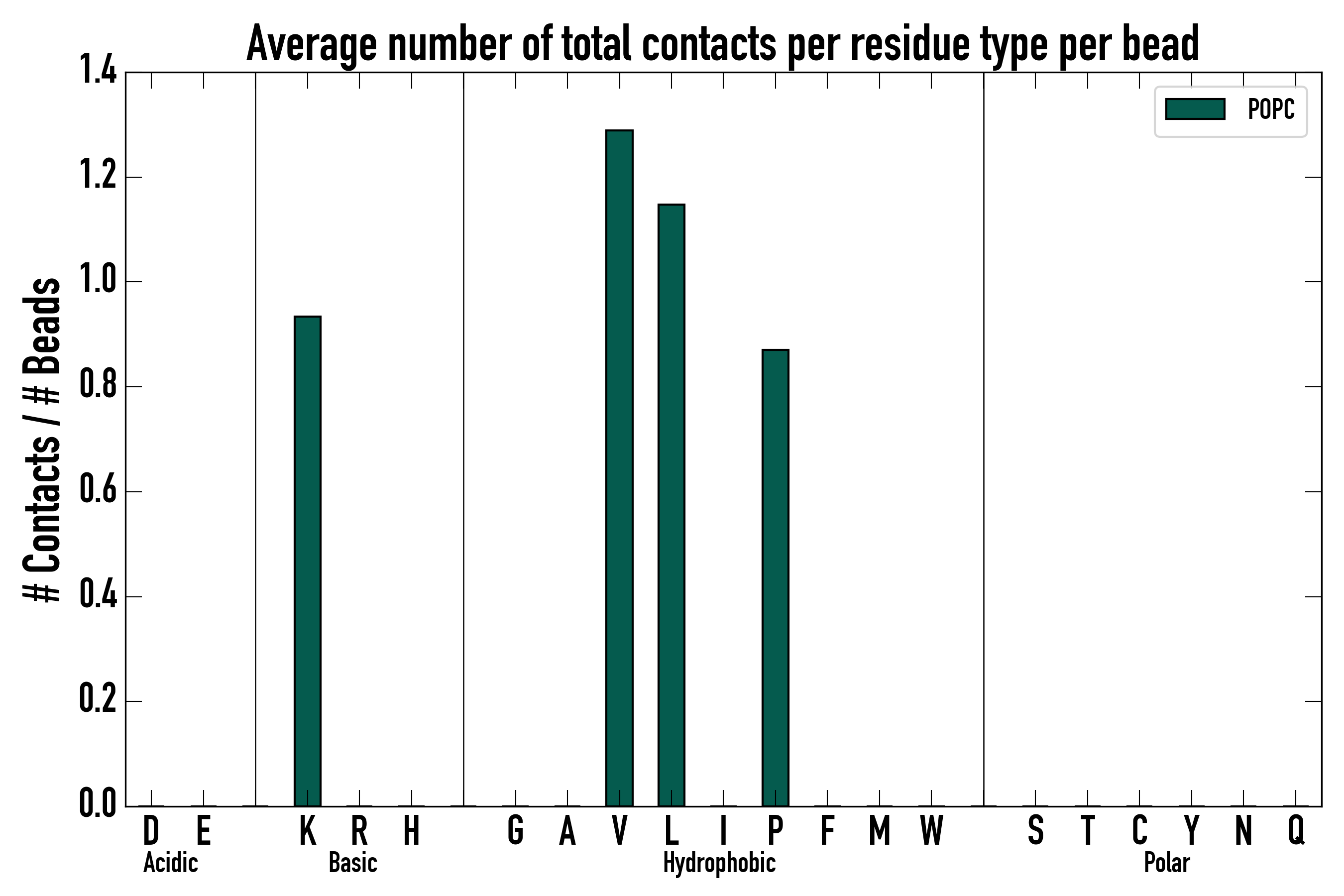 Number of contacts between each residue of the peptide backbone and the different lipid types, averaged over the last microsecond and using a cut-off of 0.6 nm.