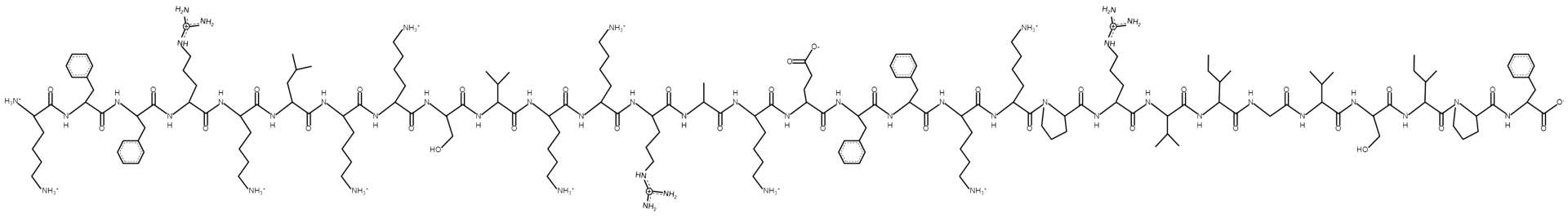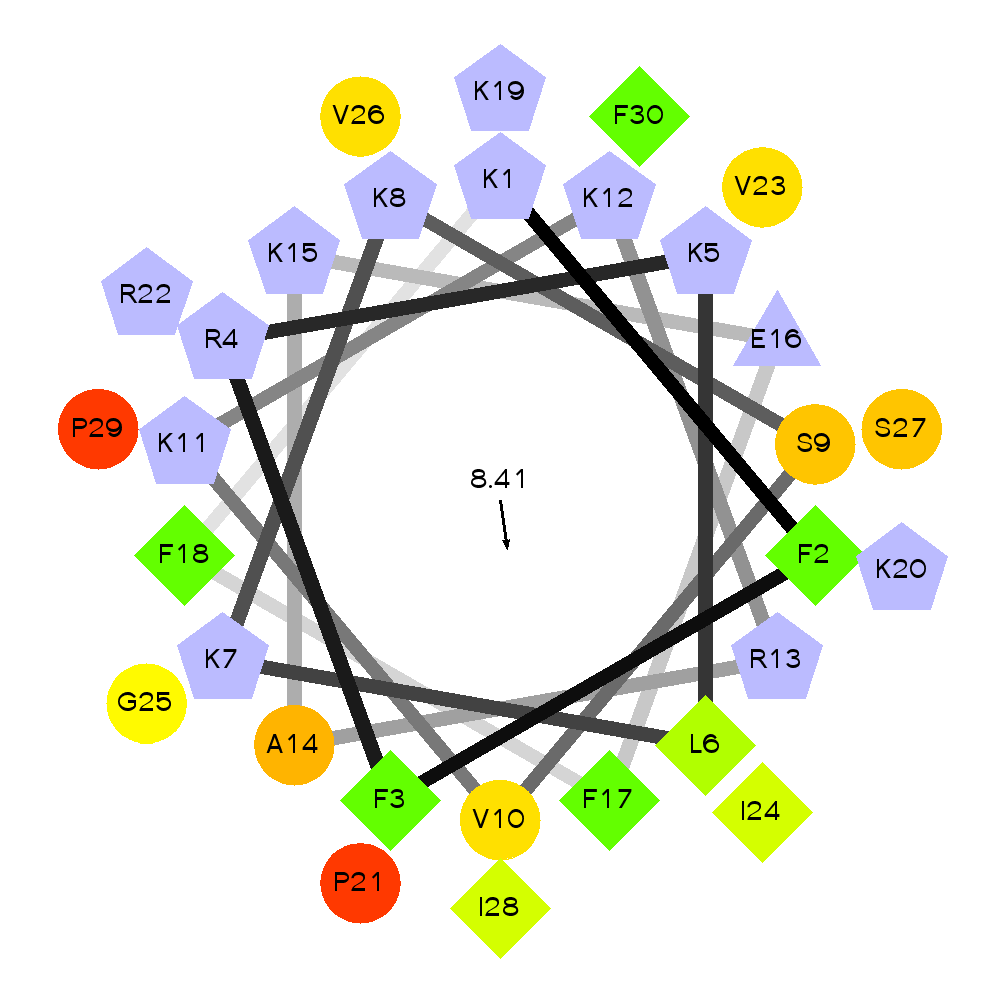 By amino acid: Basic: 12 Acidic: 1 Hydrophobic: 15 Polar: 2 Electrostatic Dipolar Moment (e nm): 14.6