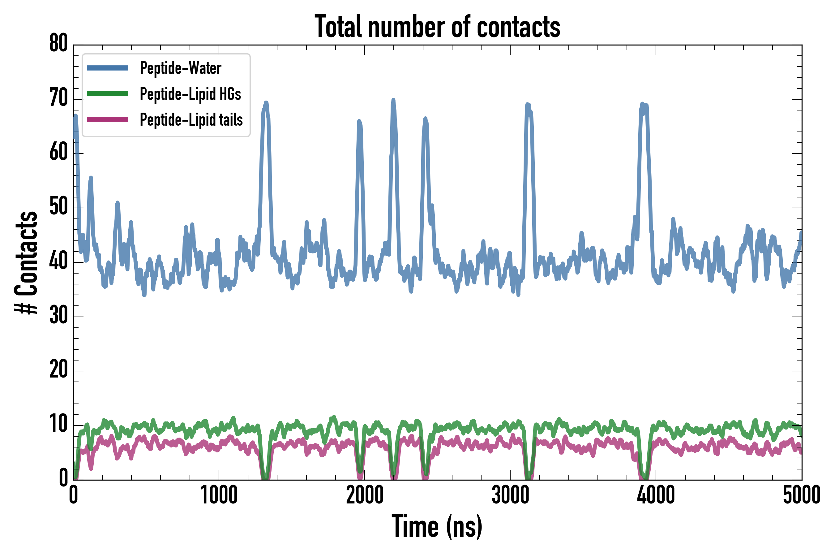 Number of contacts between each residue of the peptide backbone and the different lipid types, averaged over the last microsecond and using a cut-off of 0.6 nm.