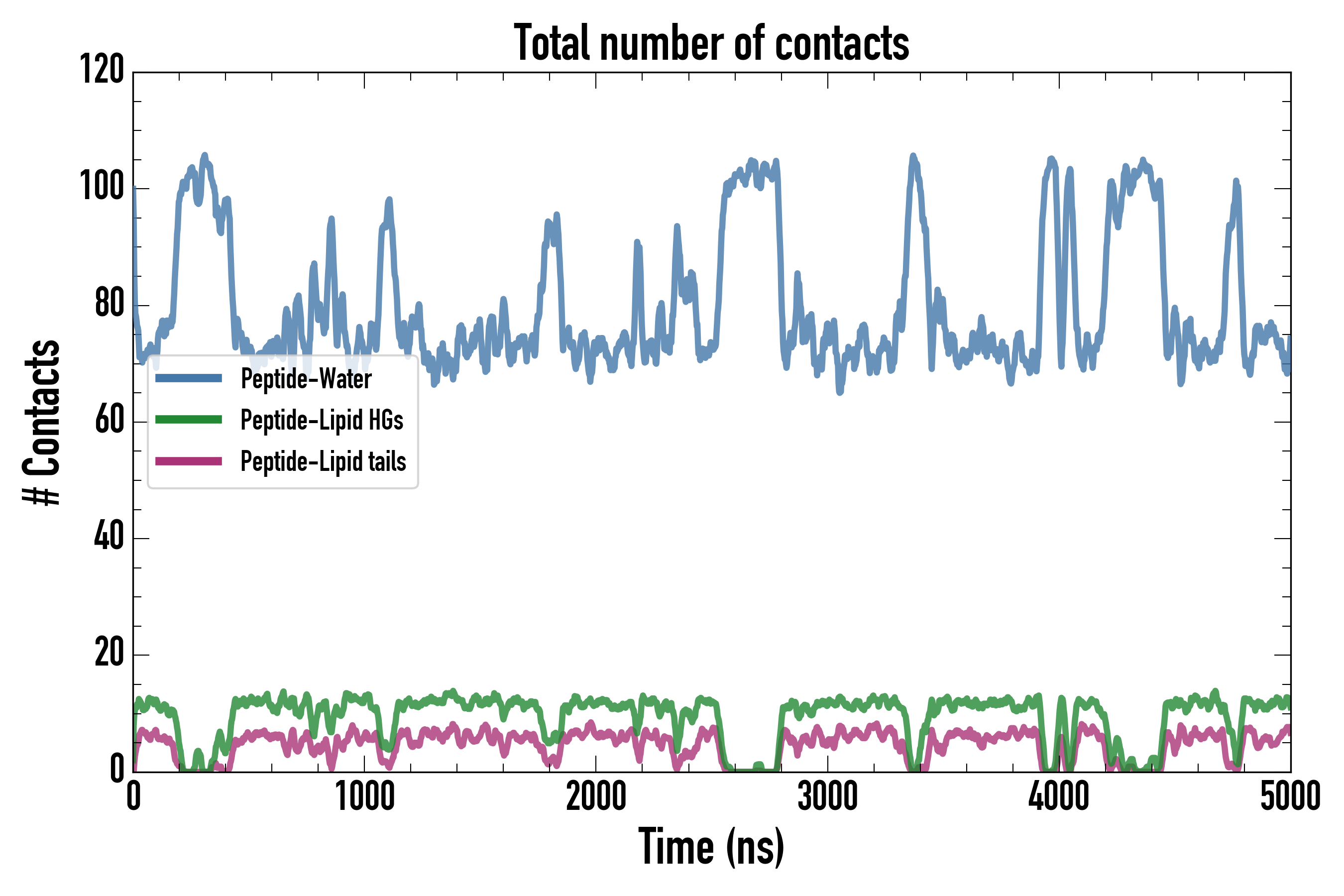 Number of contacts between each residue of the peptide backbone and the different lipid types, averaged over the last microsecond and using a cut-off of 0.6 nm.