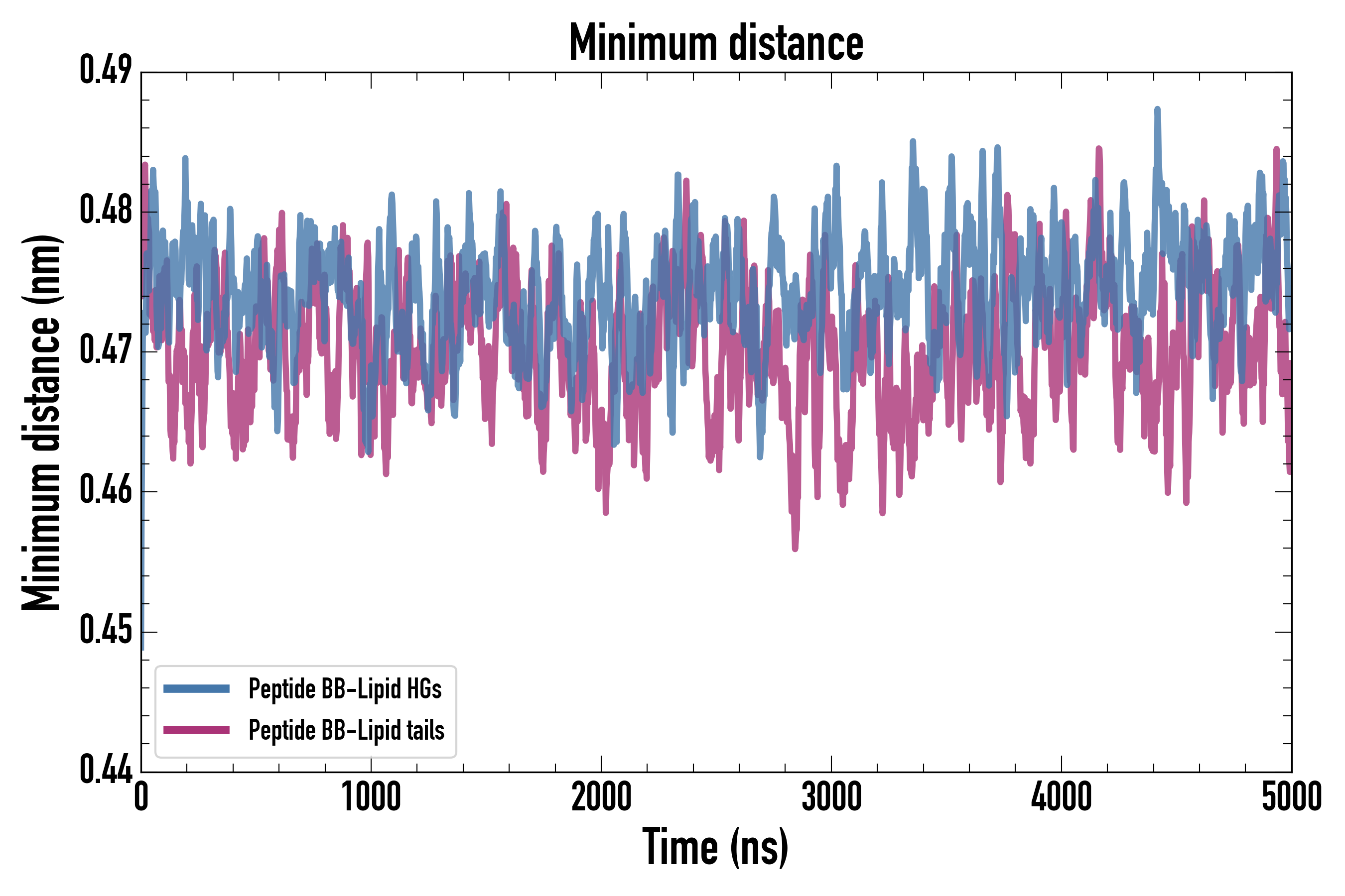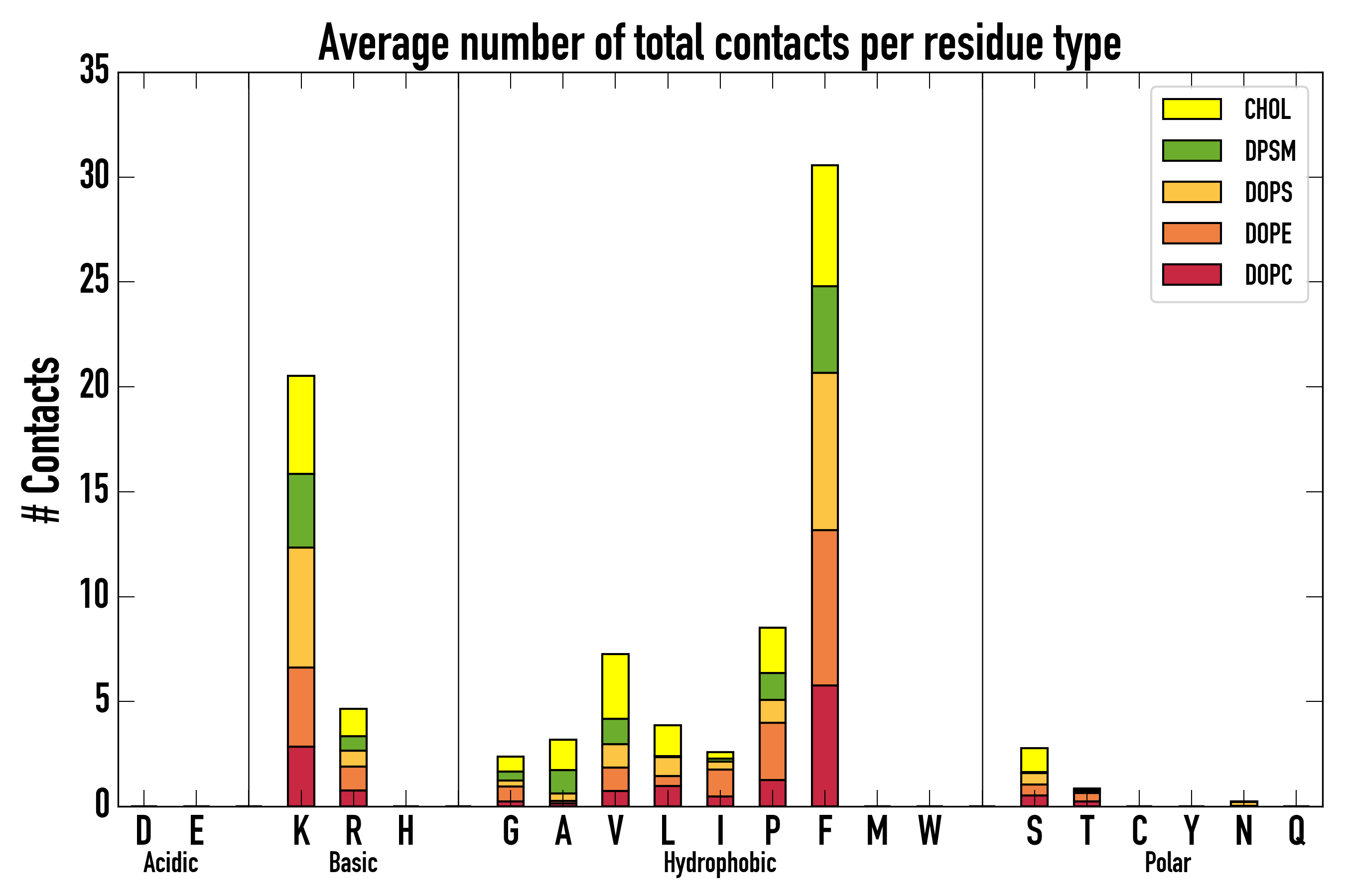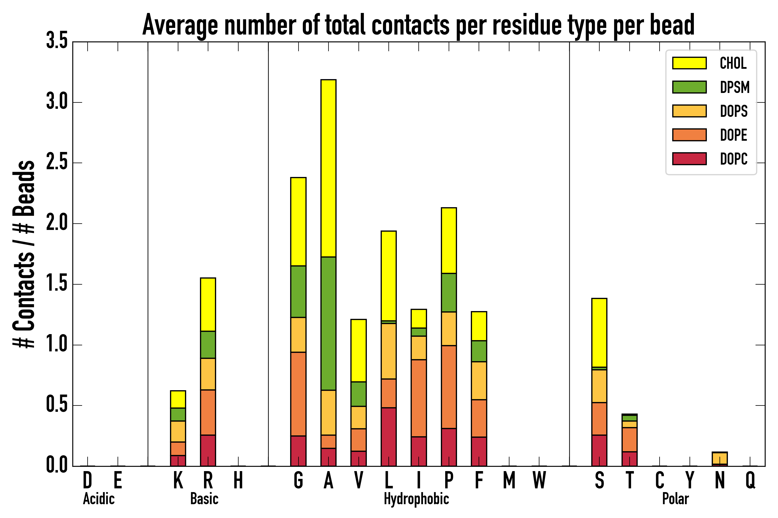 Number of contacts between each residue of the peptide backbone and the different lipid types, averaged over the last microsecond and using a cut-off of 0.6 nm.