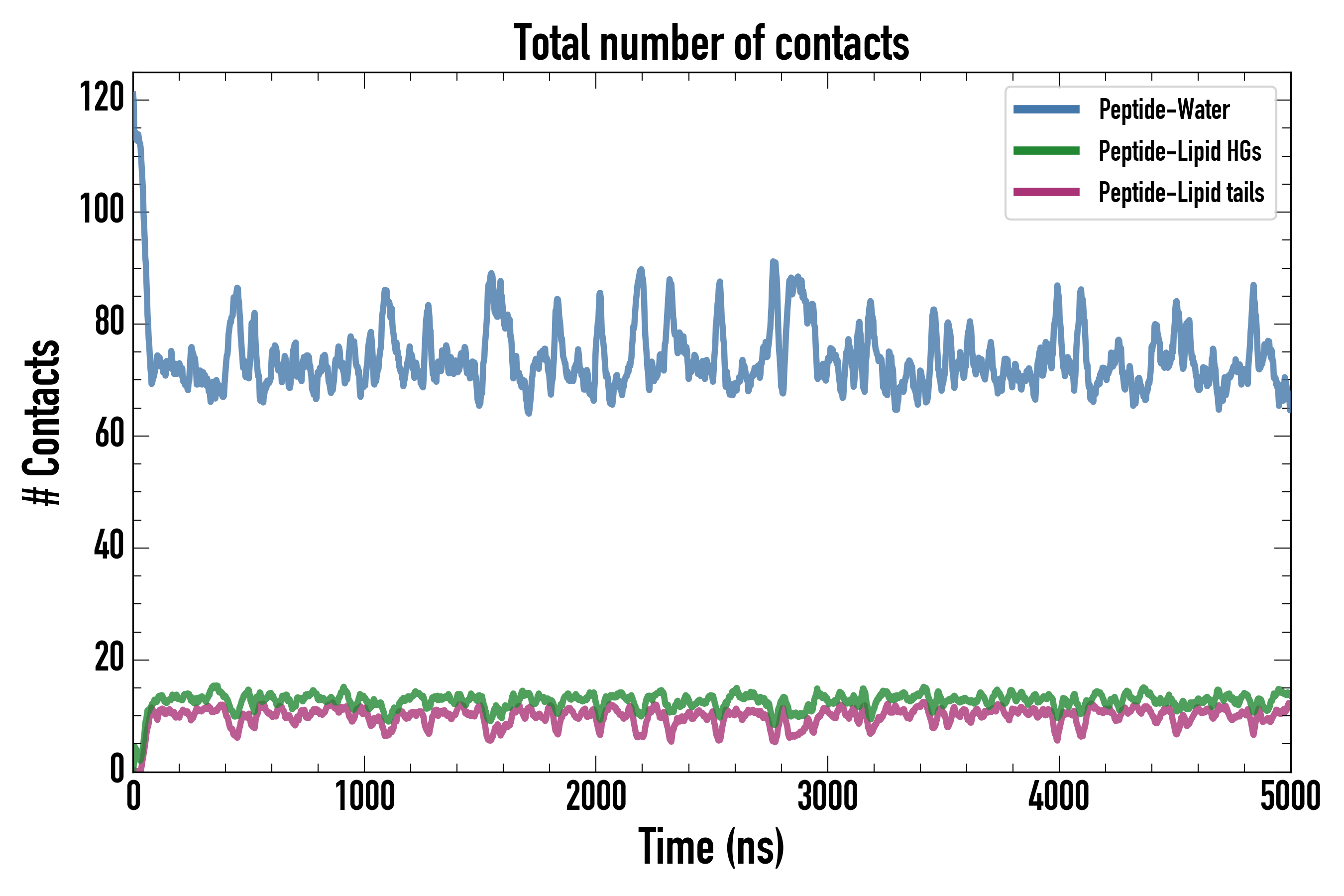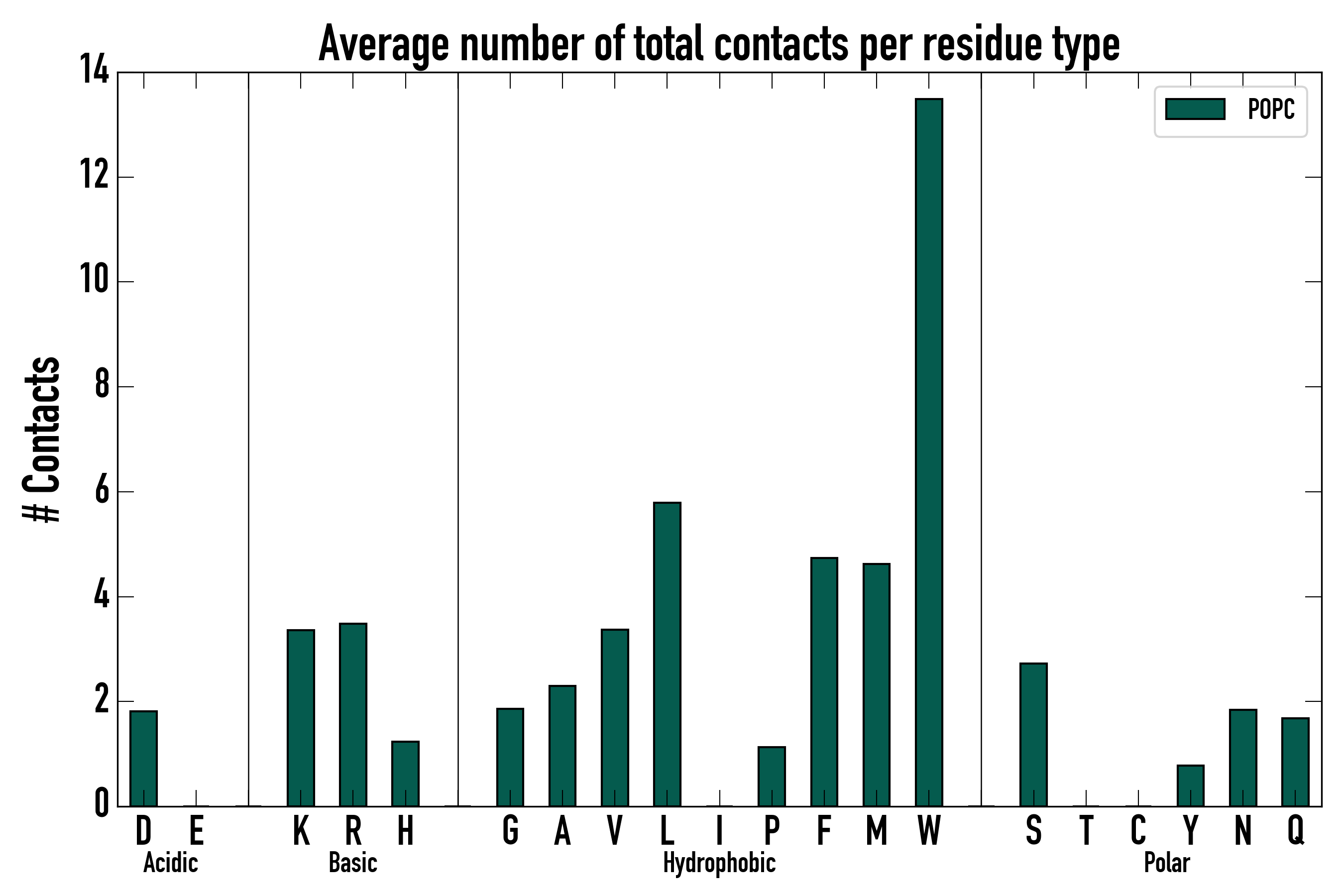Number of contacts between each residue of the peptide backbone and the different lipid types, averaged over the last microsecond and using a cut-off of 0.6 nm.