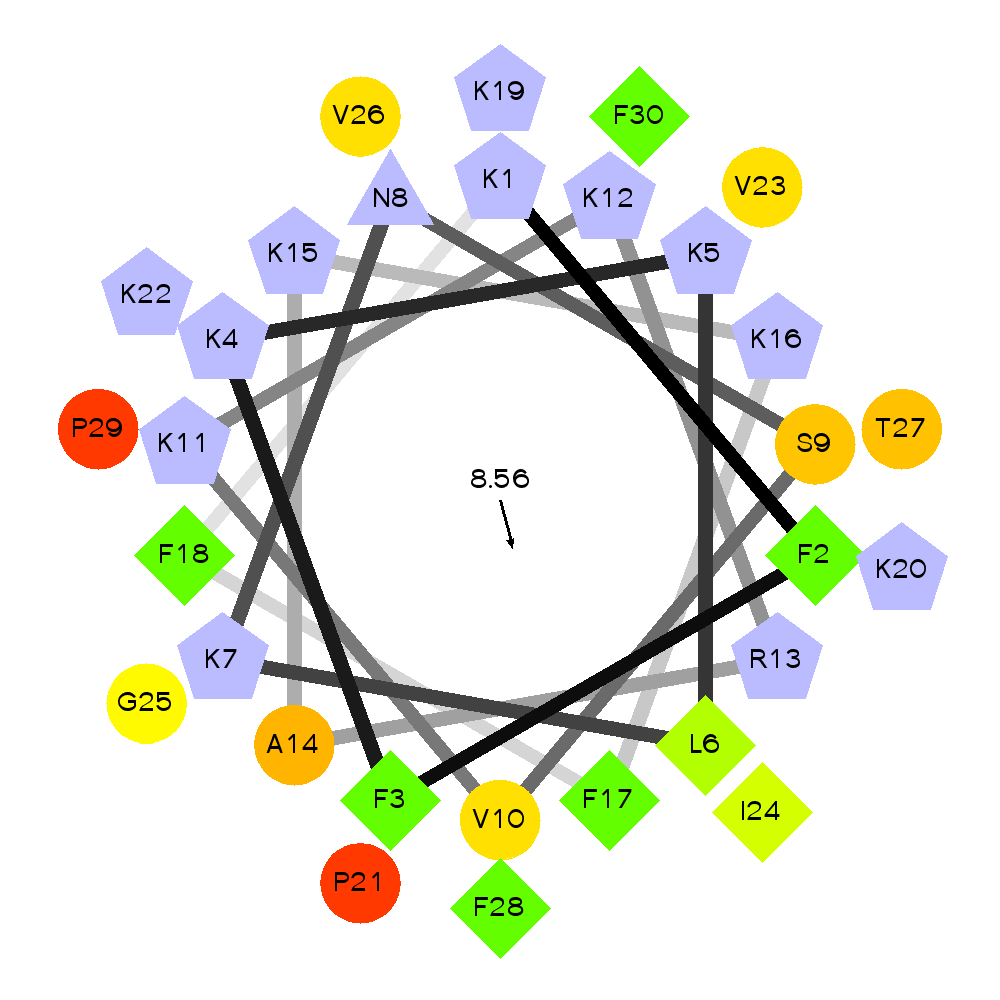 By amino acid: Basic: 12 Acidic: 0 Hydrophobic: 15 Polar: 3 Electrostatic Dipolar Moment (e nm): 13.7