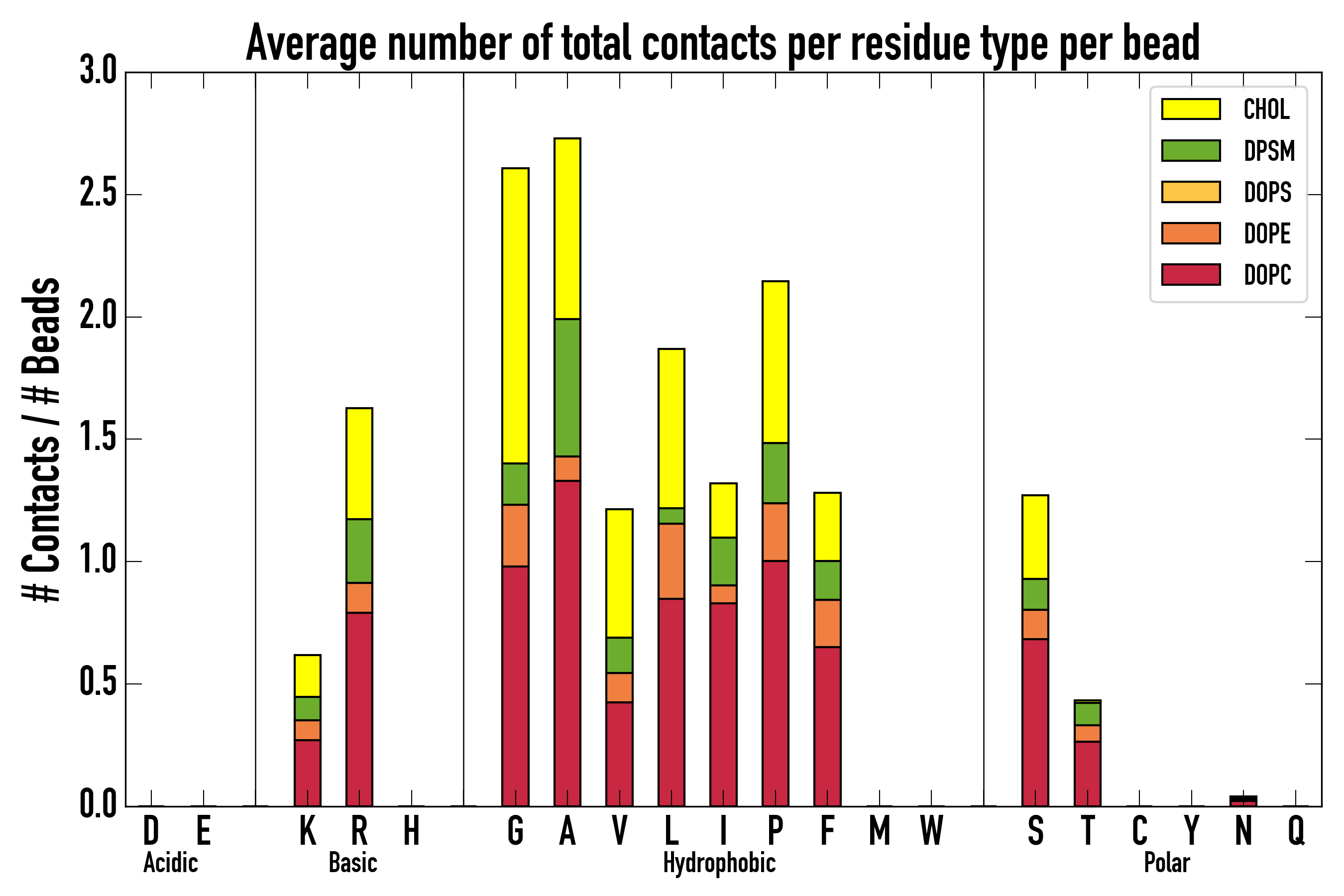 Number of contacts between each residue of the peptide backbone and the different lipid types, averaged over the last microsecond and using a cut-off of 0.6 nm.