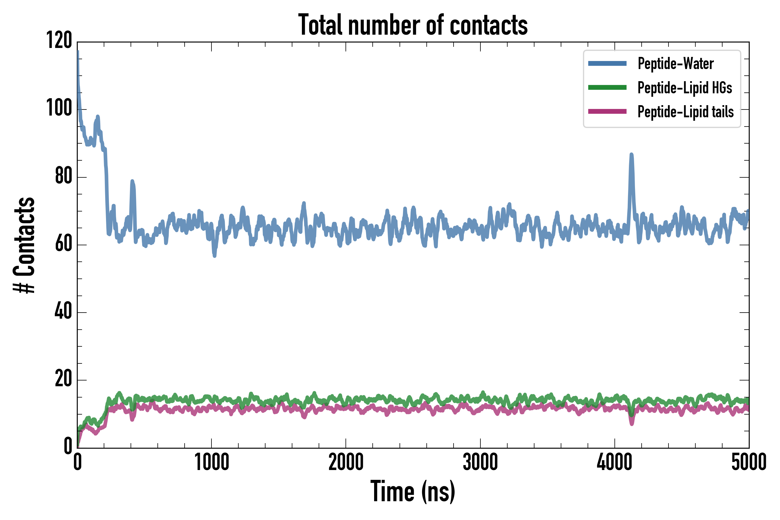 Number of contacts between each residue of the peptide backbone and the different lipid types, averaged over the last microsecond and using a cut-off of 0.6 nm.