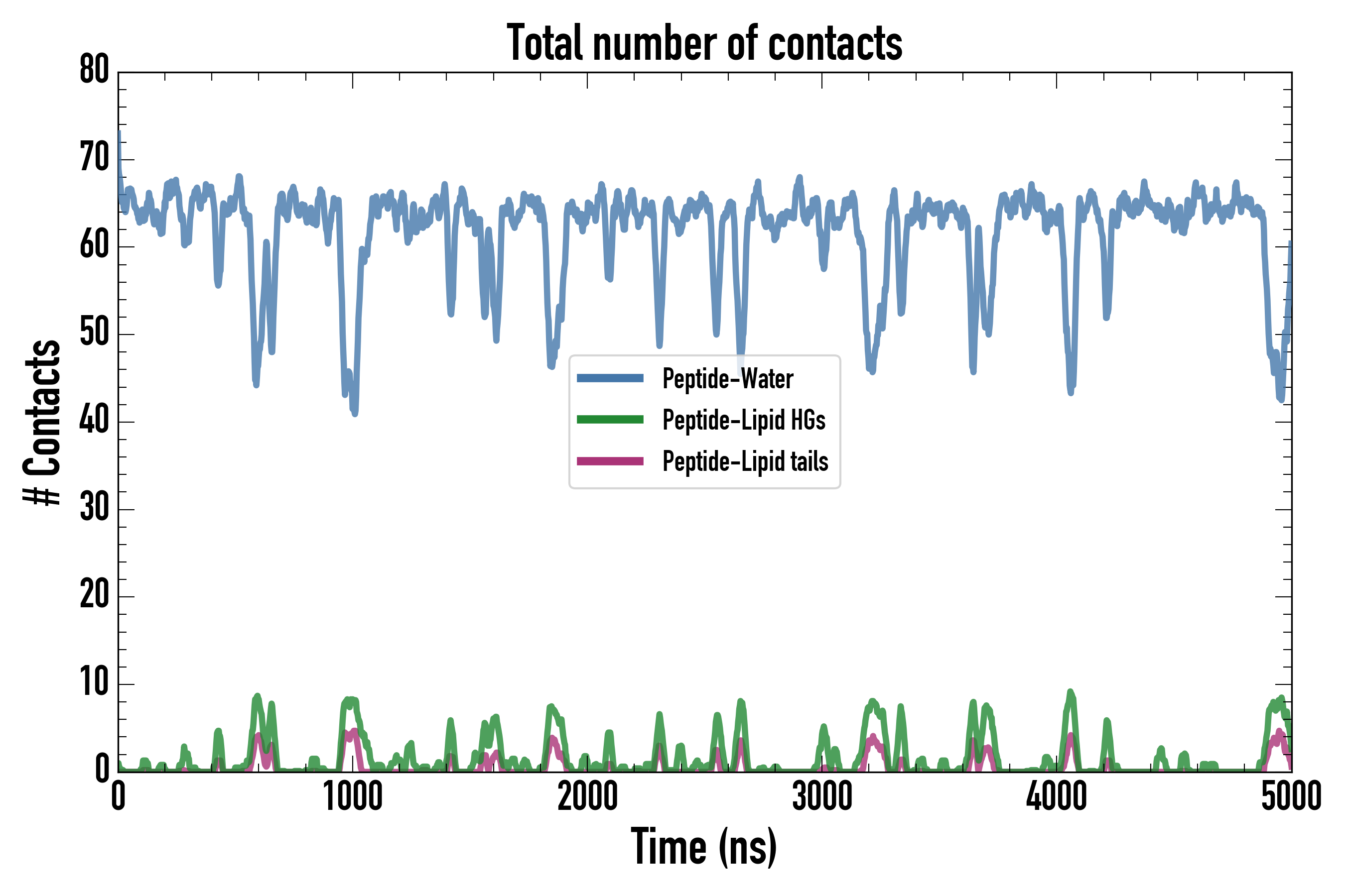 Number of contacts between each residue of the peptide backbone and the different lipid types, averaged over the last microsecond and using a cut-off of 0.6 nm.