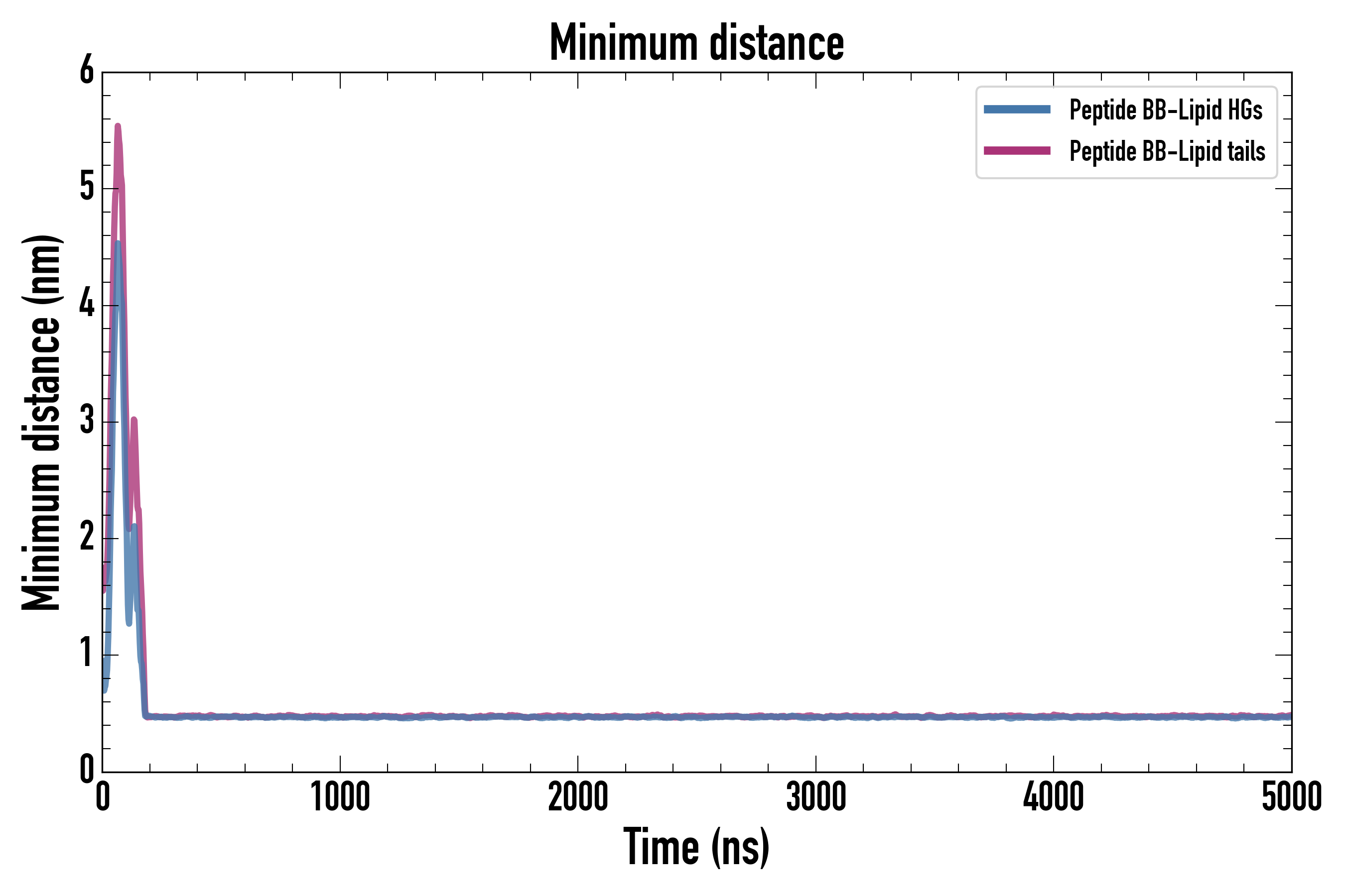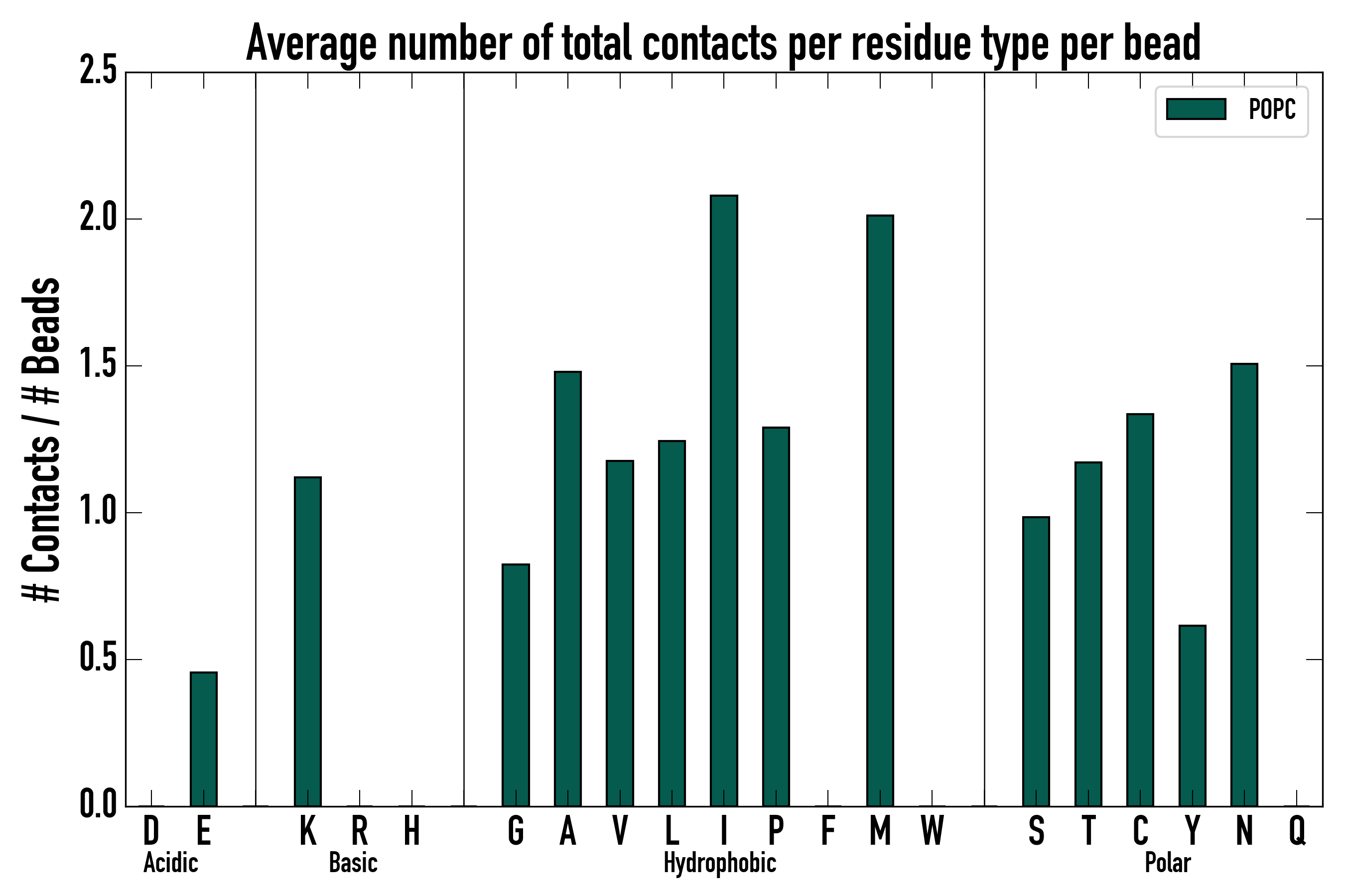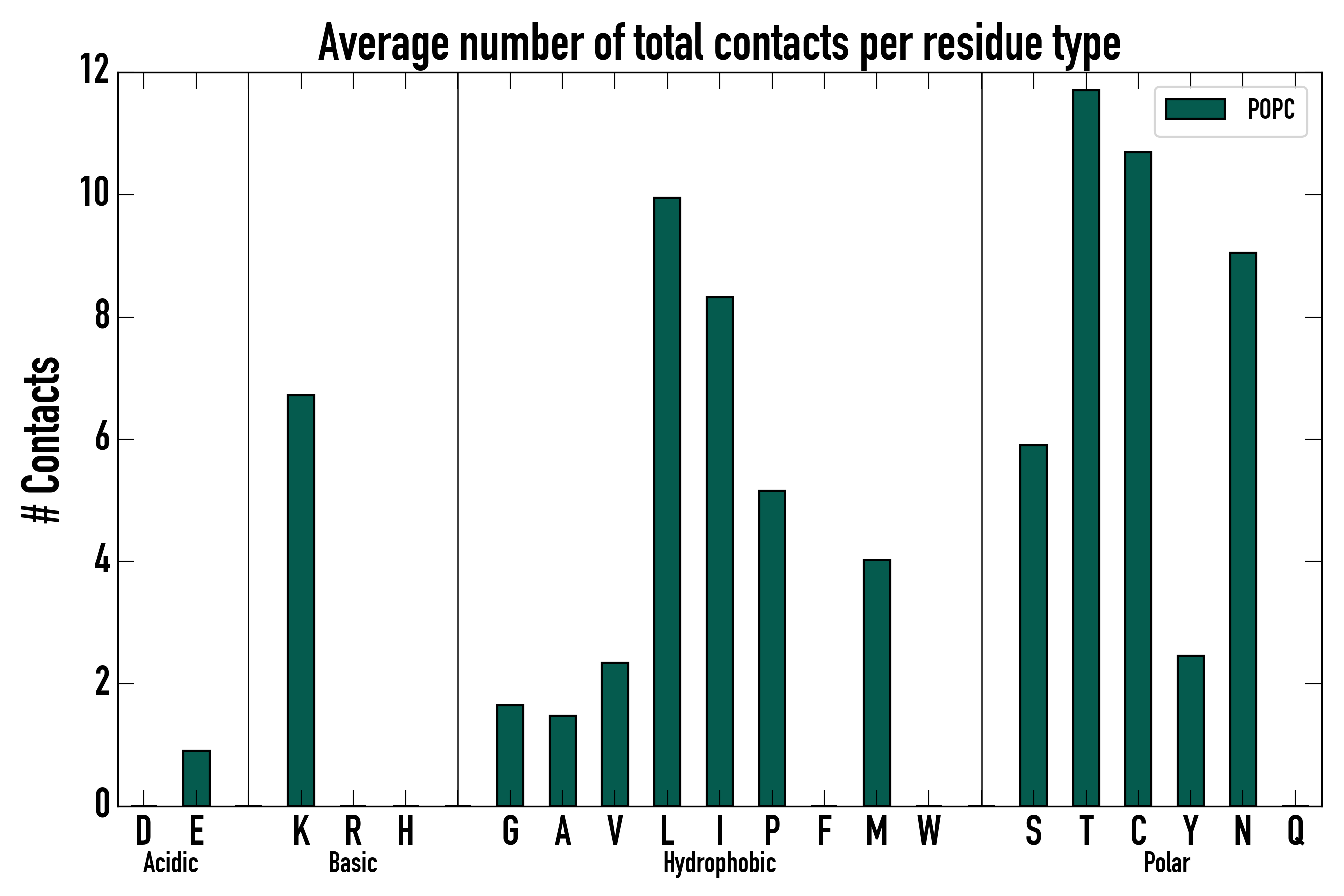Number of contacts between each residue of the peptide backbone and the different lipid types, averaged over the last microsecond and using a cut-off of 0.6 nm.