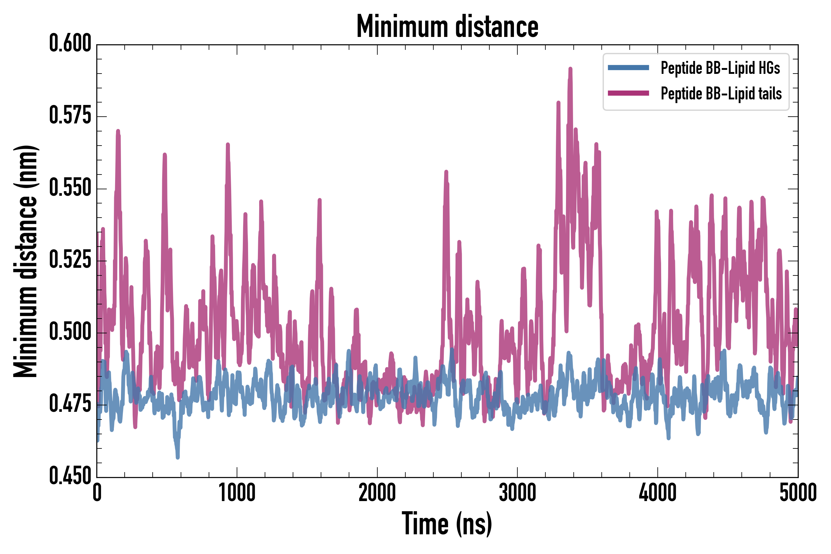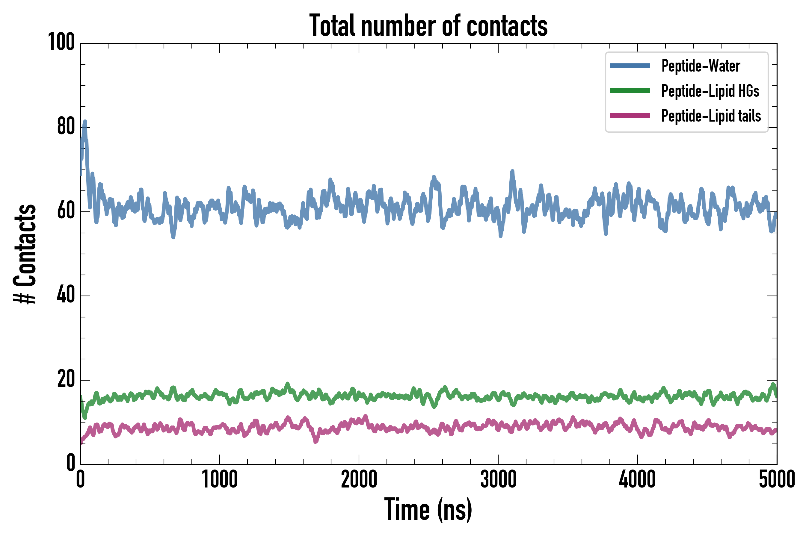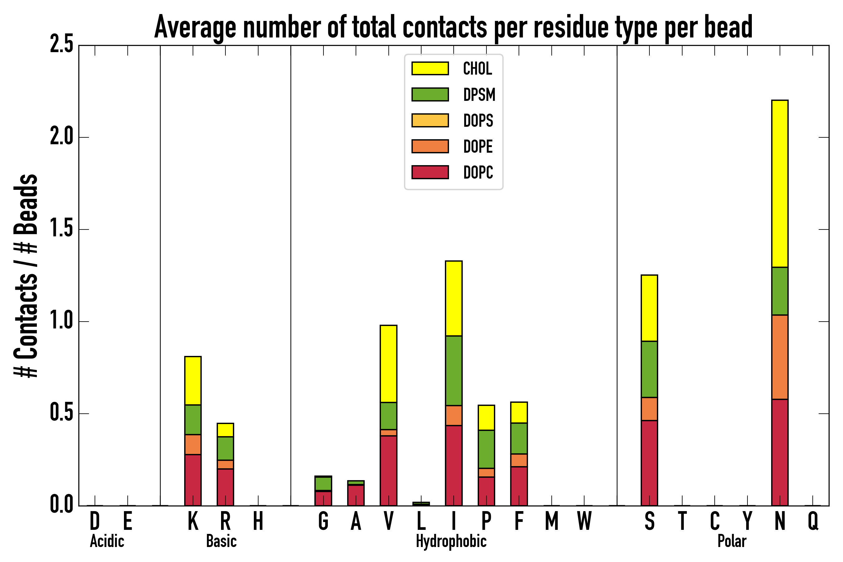 Number of contacts between each residue of the peptide backbone and the different lipid types, averaged over the last microsecond and using a cut-off of 0.6 nm.