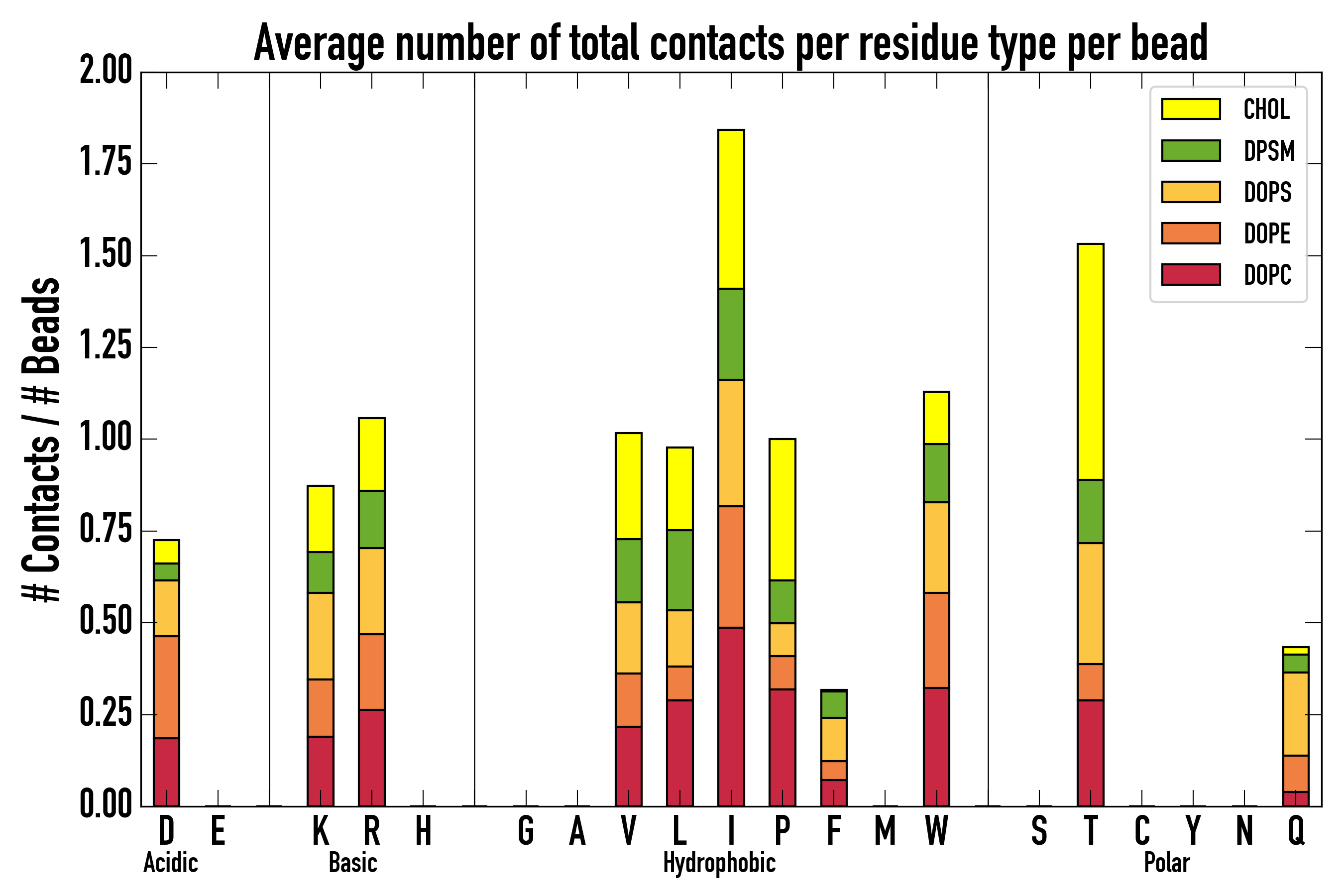 Number of contacts between each residue of the peptide backbone and the different lipid types, averaged over the last microsecond and using a cut-off of 0.6 nm.