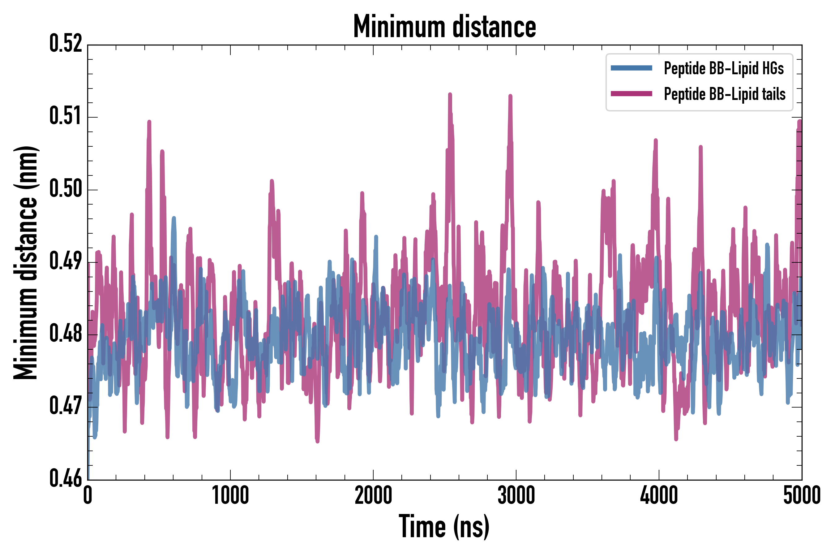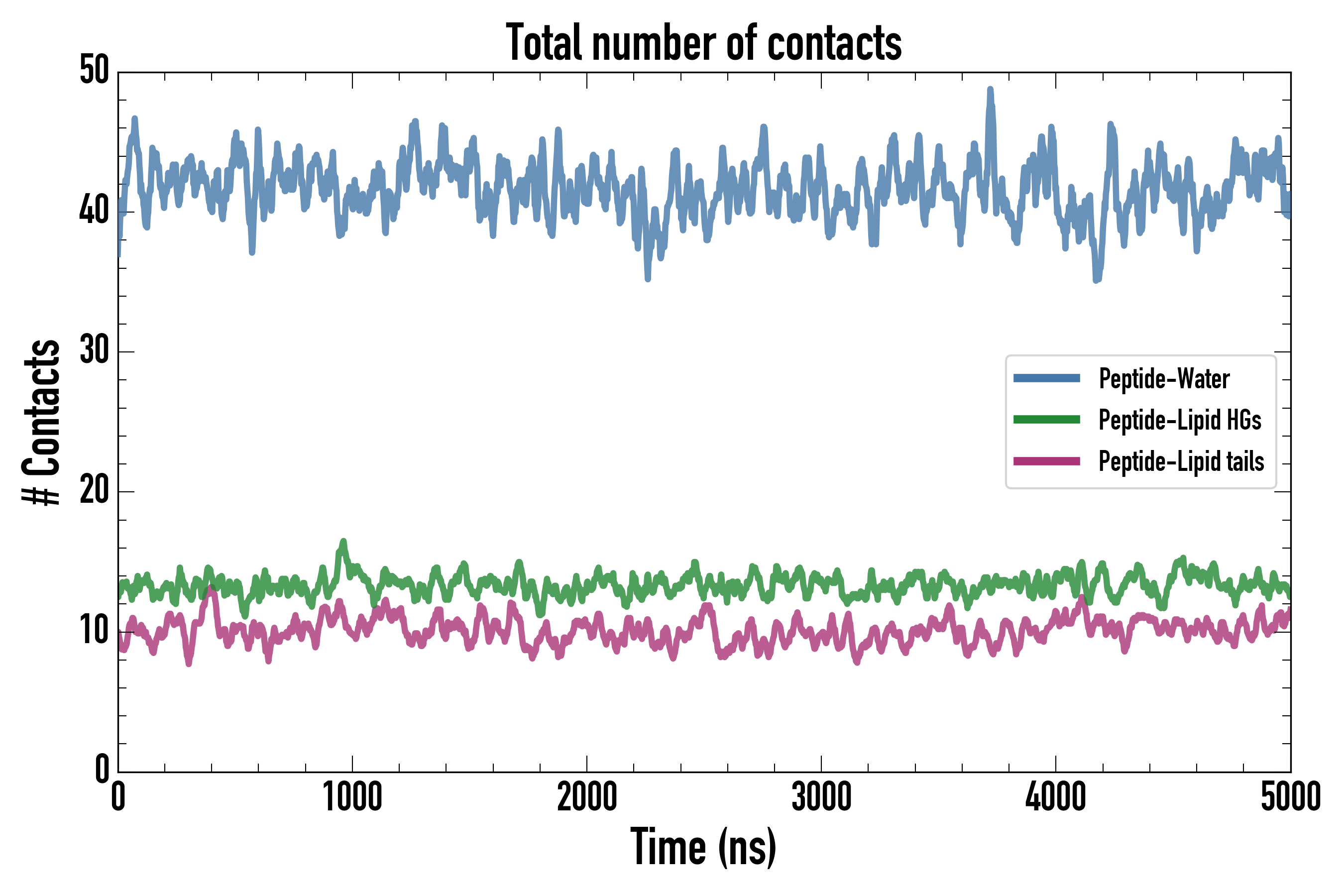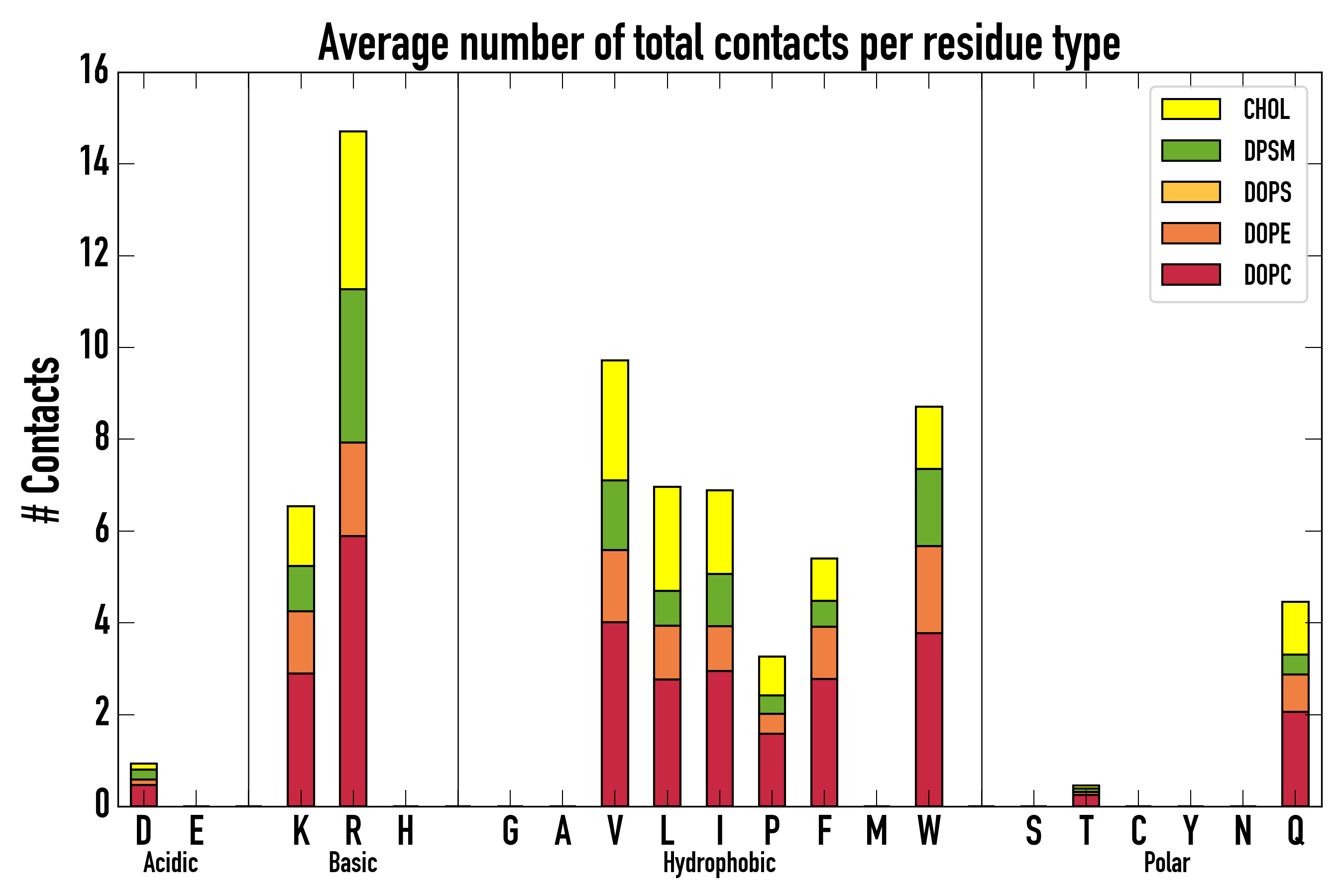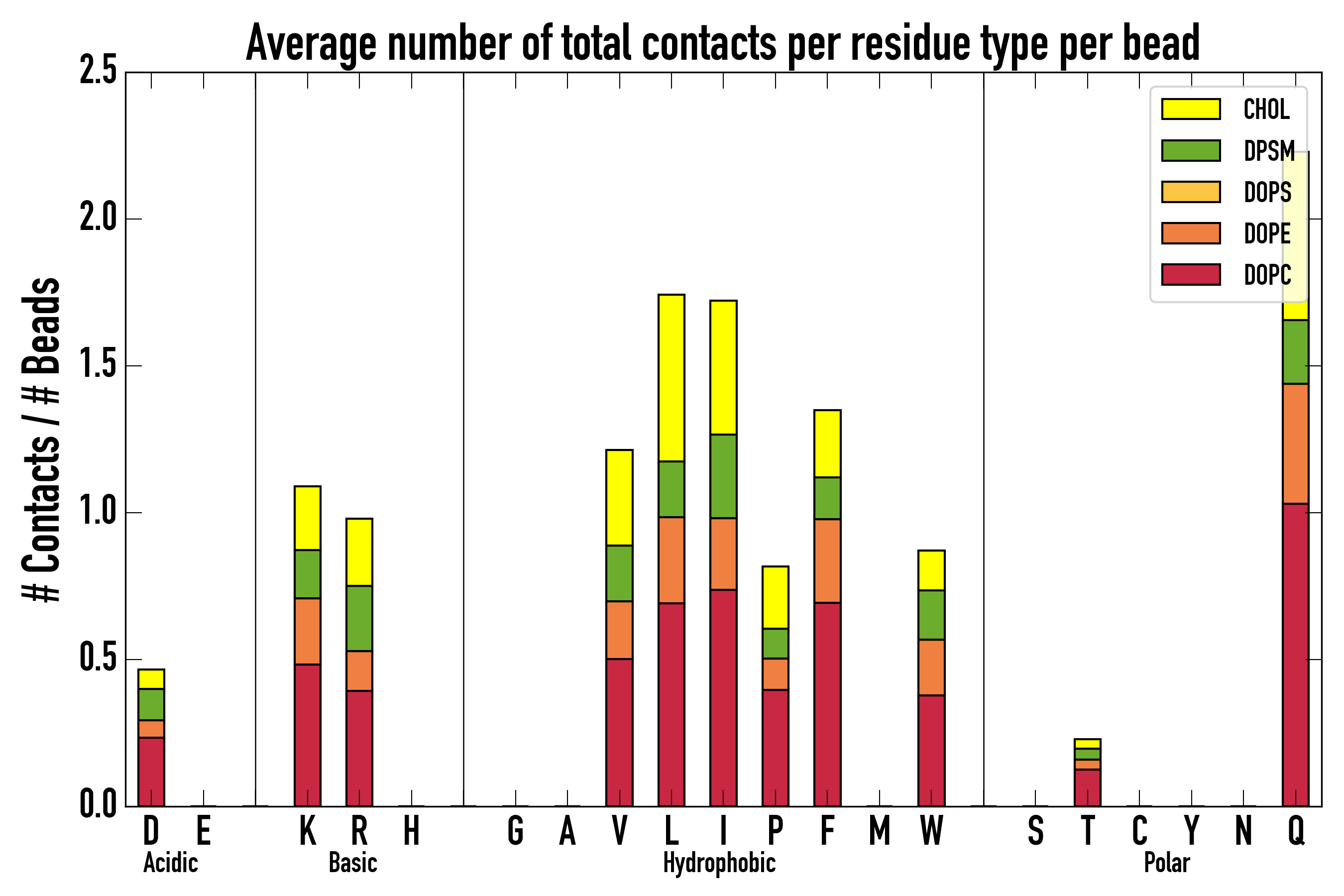 Number of contacts between each residue of the peptide backbone and the different lipid types, averaged over the last microsecond and using a cut-off of 0.6 nm.