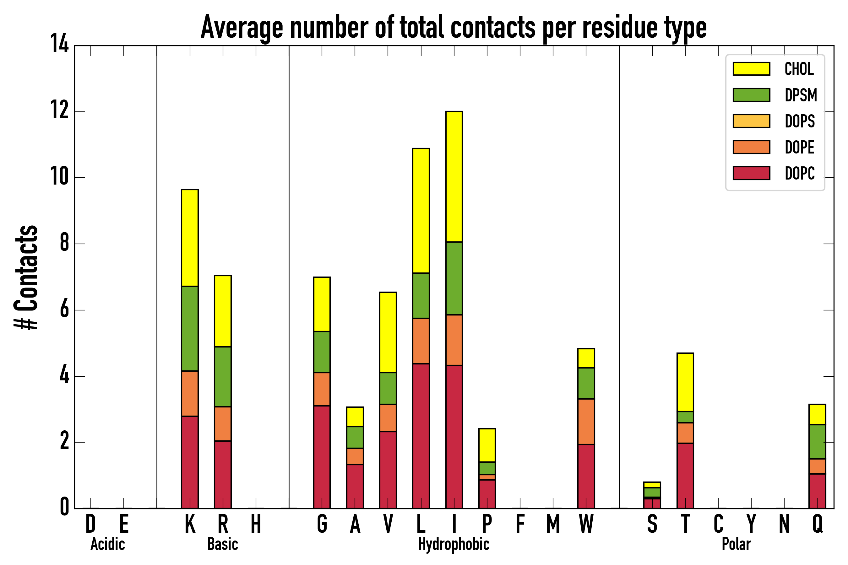 Number of contacts between each residue of the peptide backbone and the different lipid types, averaged over the last microsecond and using a cut-off of 0.6 nm.