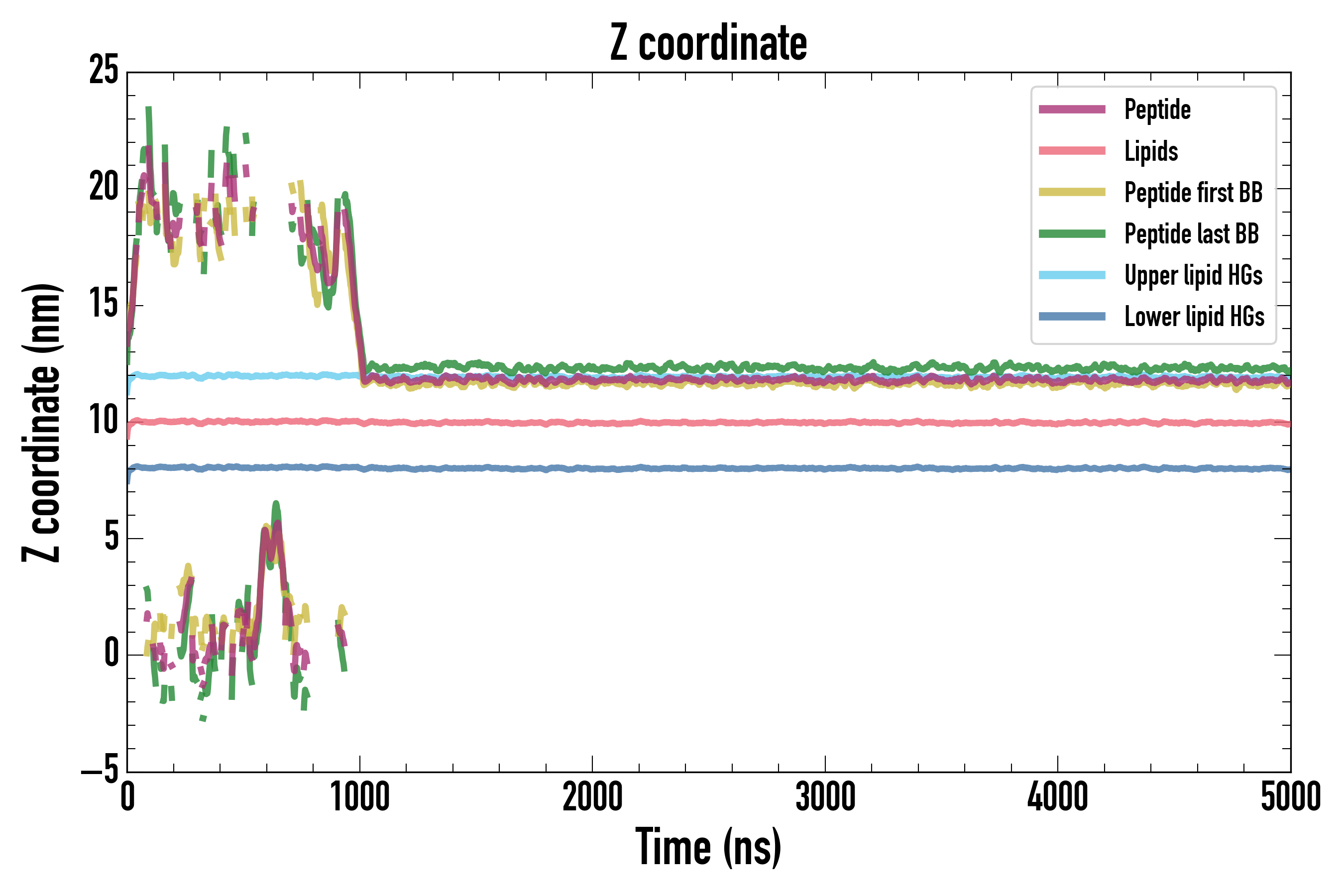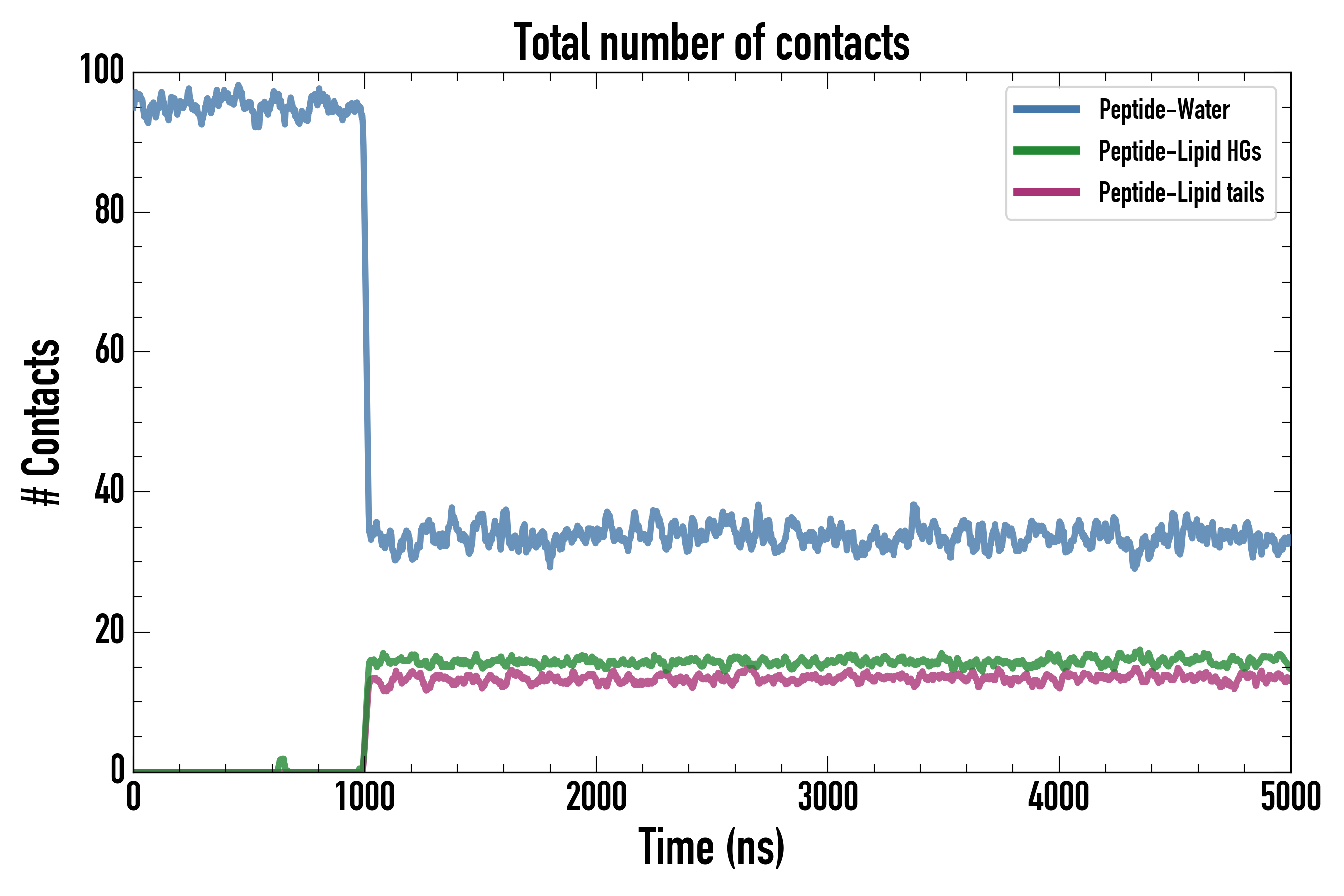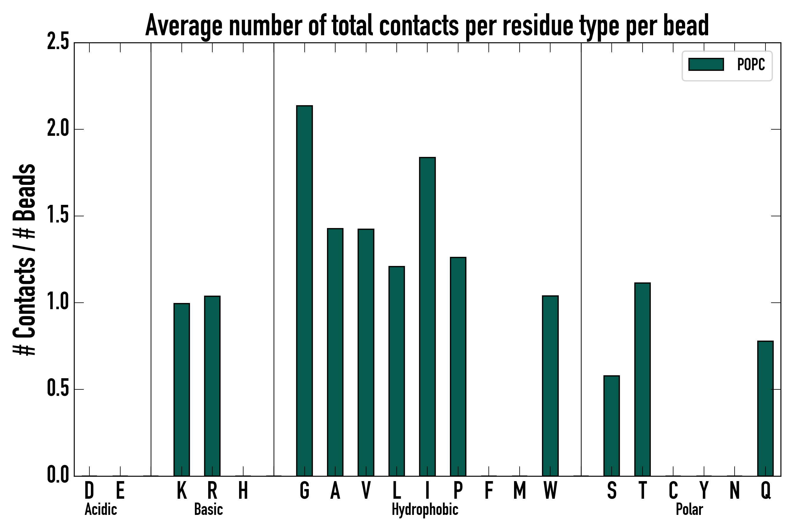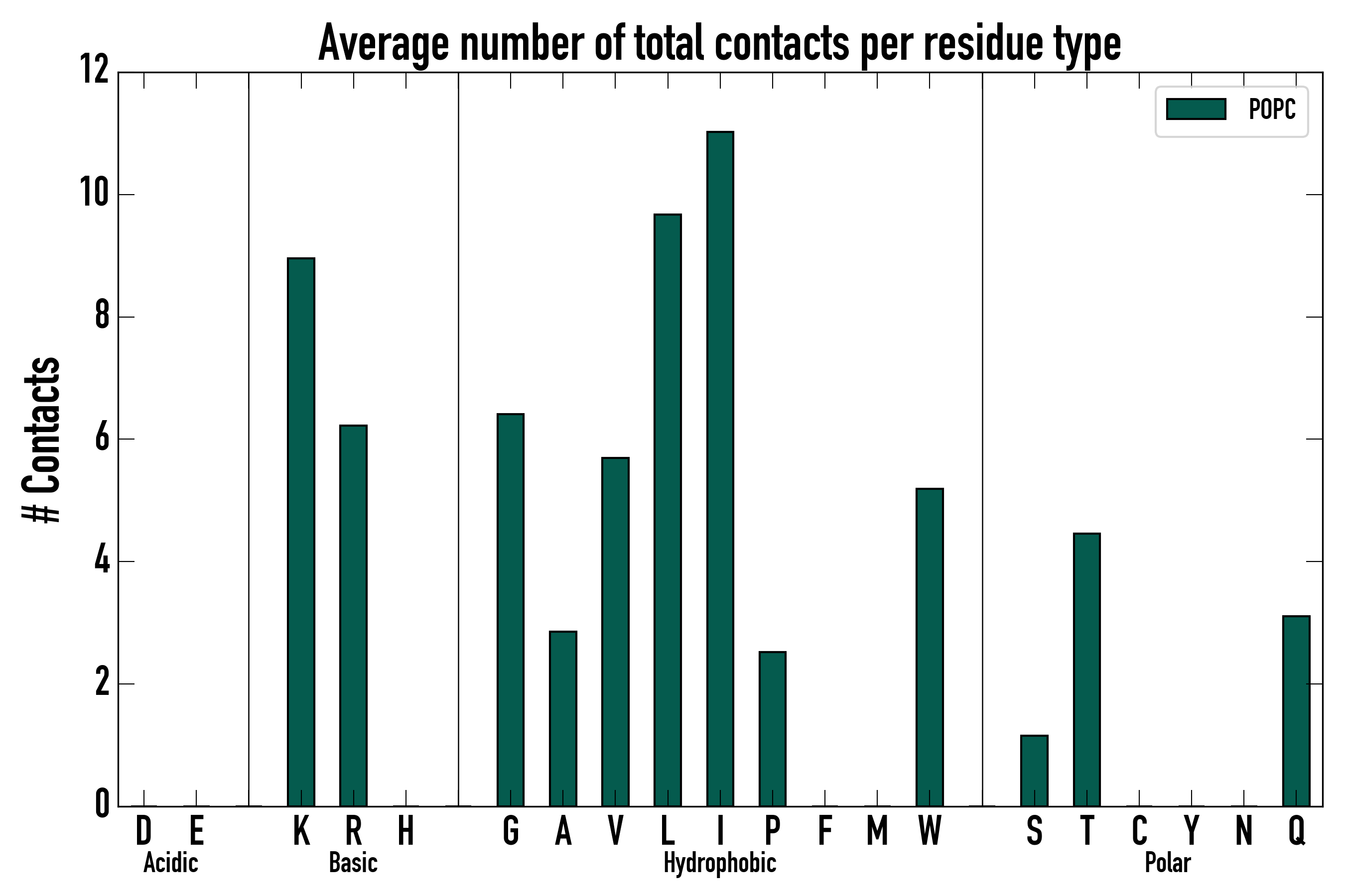Number of contacts between each residue of the peptide backbone and the different lipid types, averaged over the last microsecond and using a cut-off of 0.6 nm.