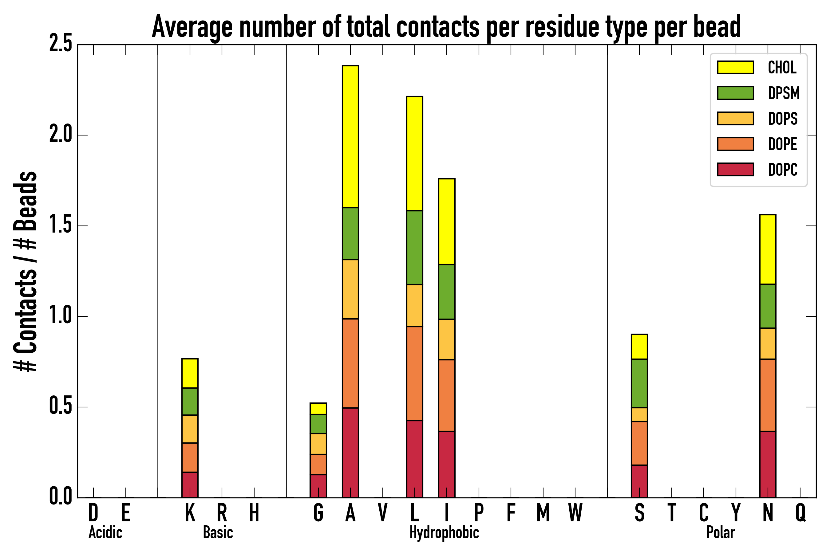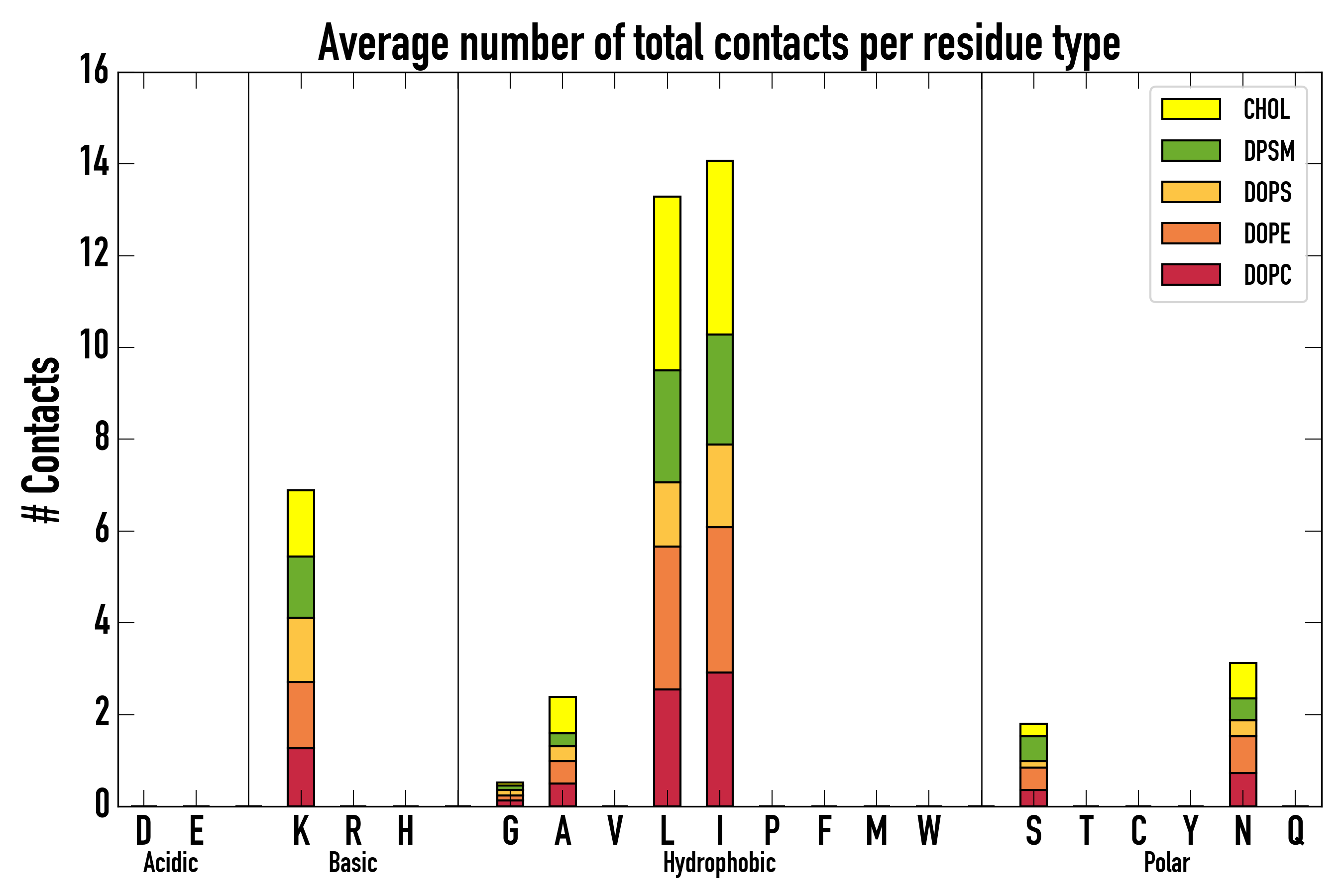 Number of contacts between each residue of the peptide backbone and the different lipid types, averaged over the last microsecond and using a cut-off of 0.6 nm.