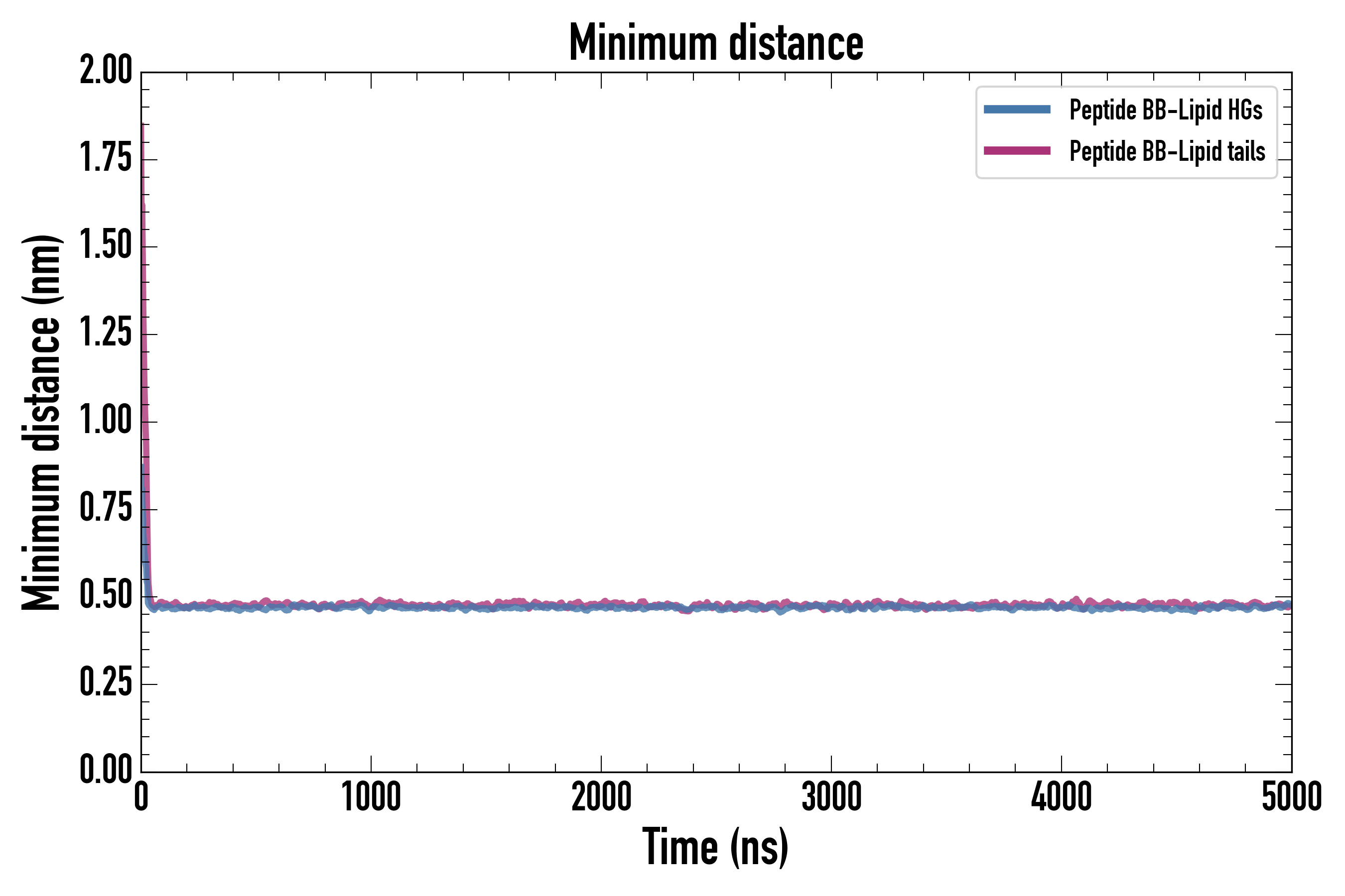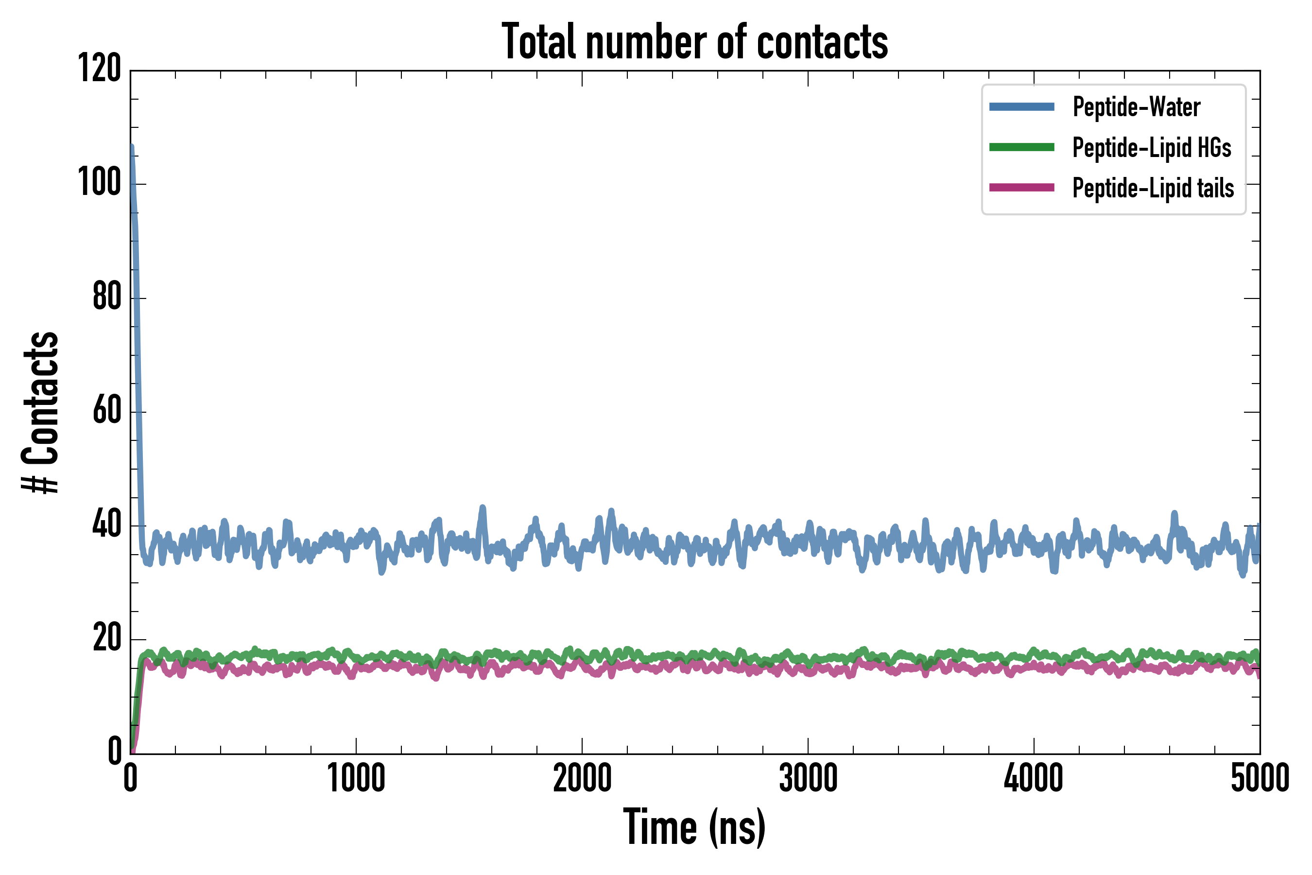 Number of contacts between each residue of the peptide backbone and the different lipid types, averaged over the last microsecond and using a cut-off of 0.6 nm.