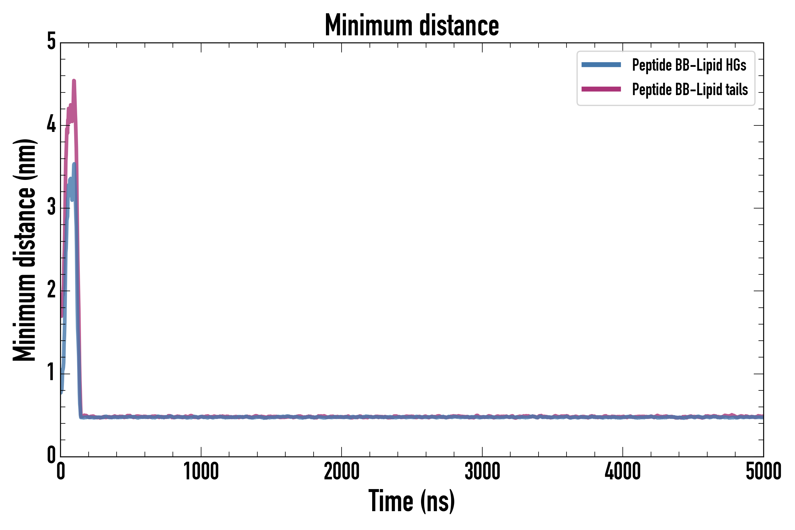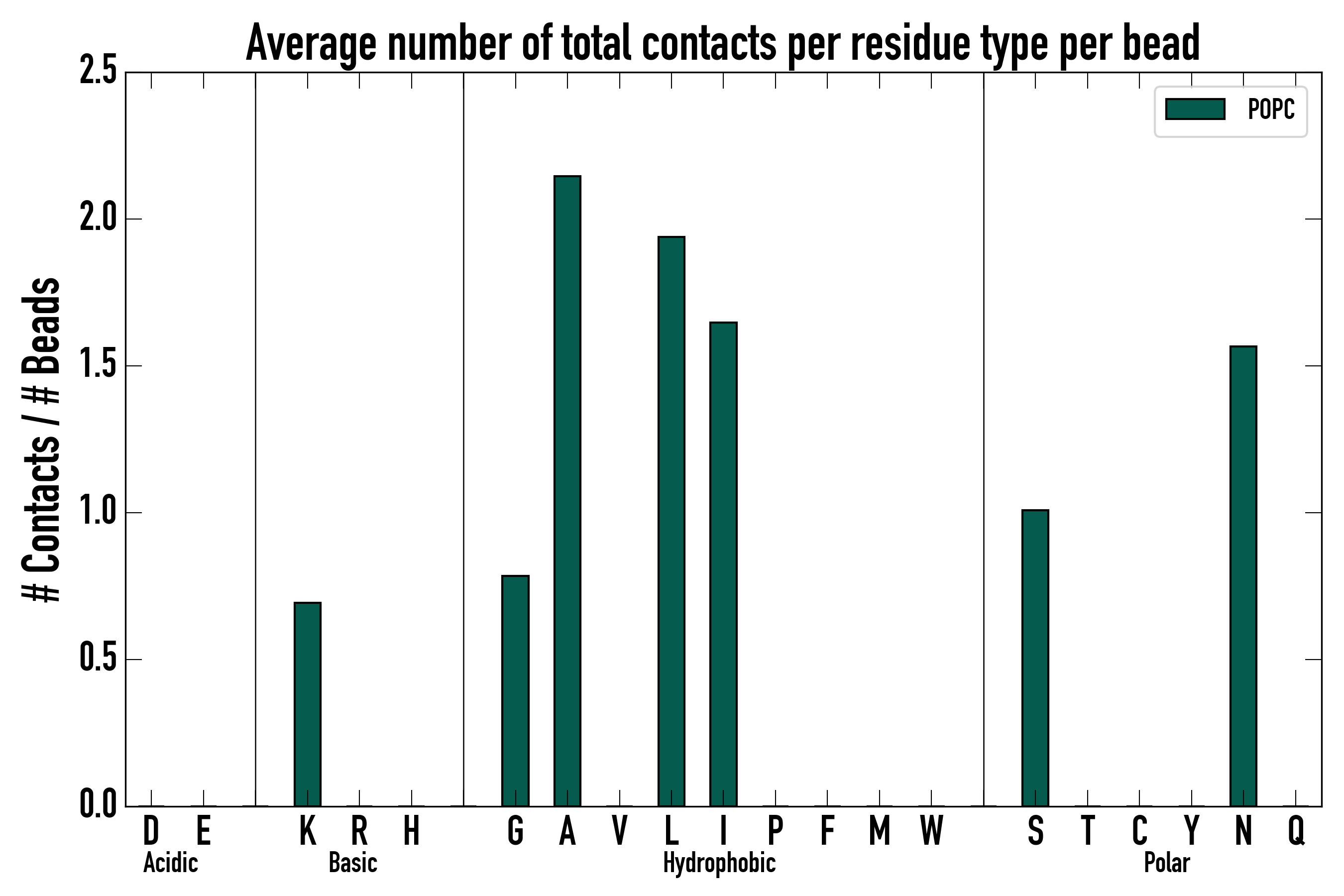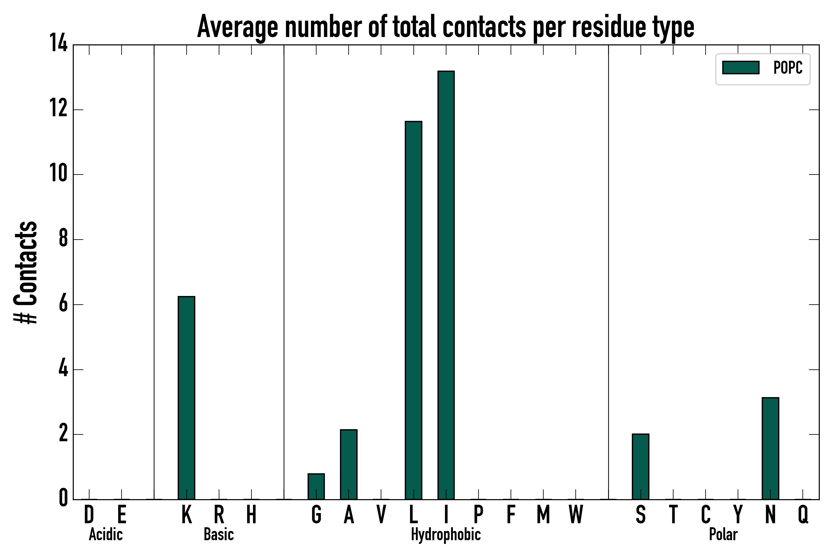 Number of contacts between each residue of the peptide backbone and the different lipid types, averaged over the last microsecond and using a cut-off of 0.6 nm.