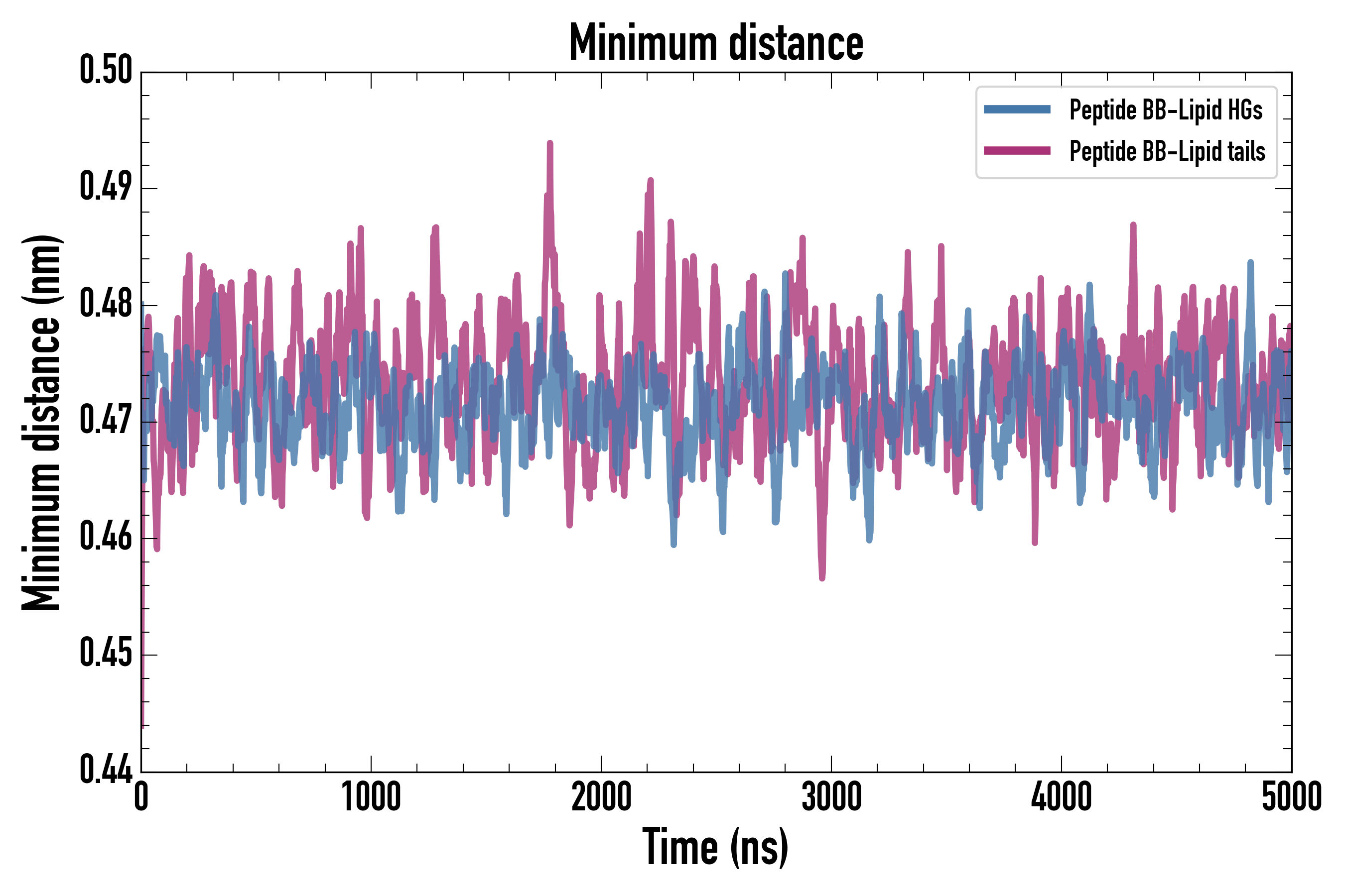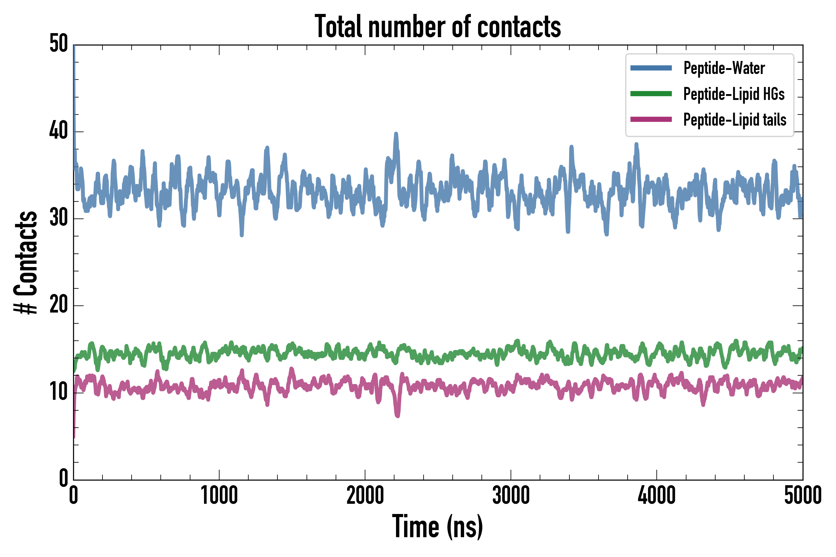 Number of contacts between each residue of the peptide backbone and the different lipid types, averaged over the last microsecond and using a cut-off of 0.6 nm.