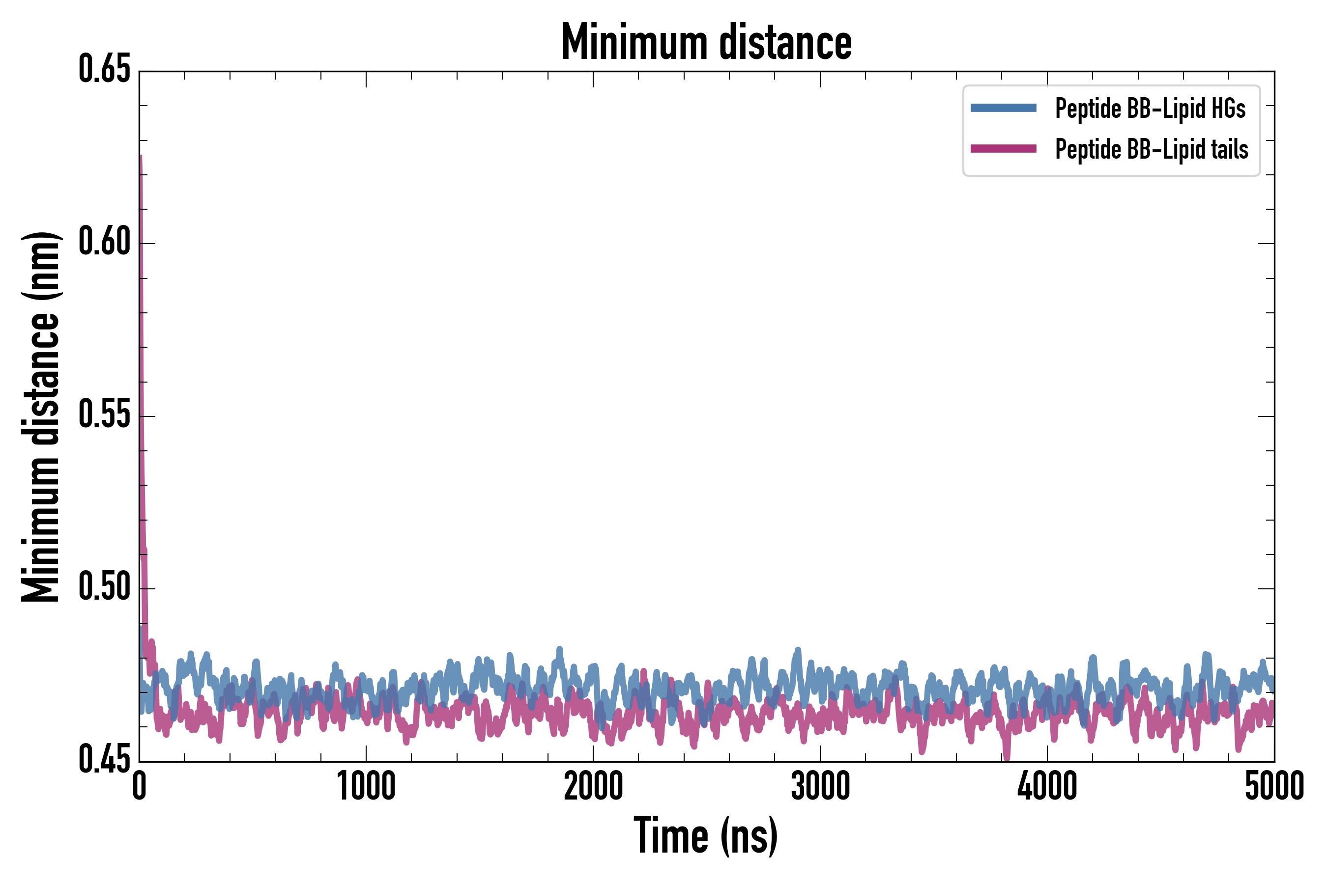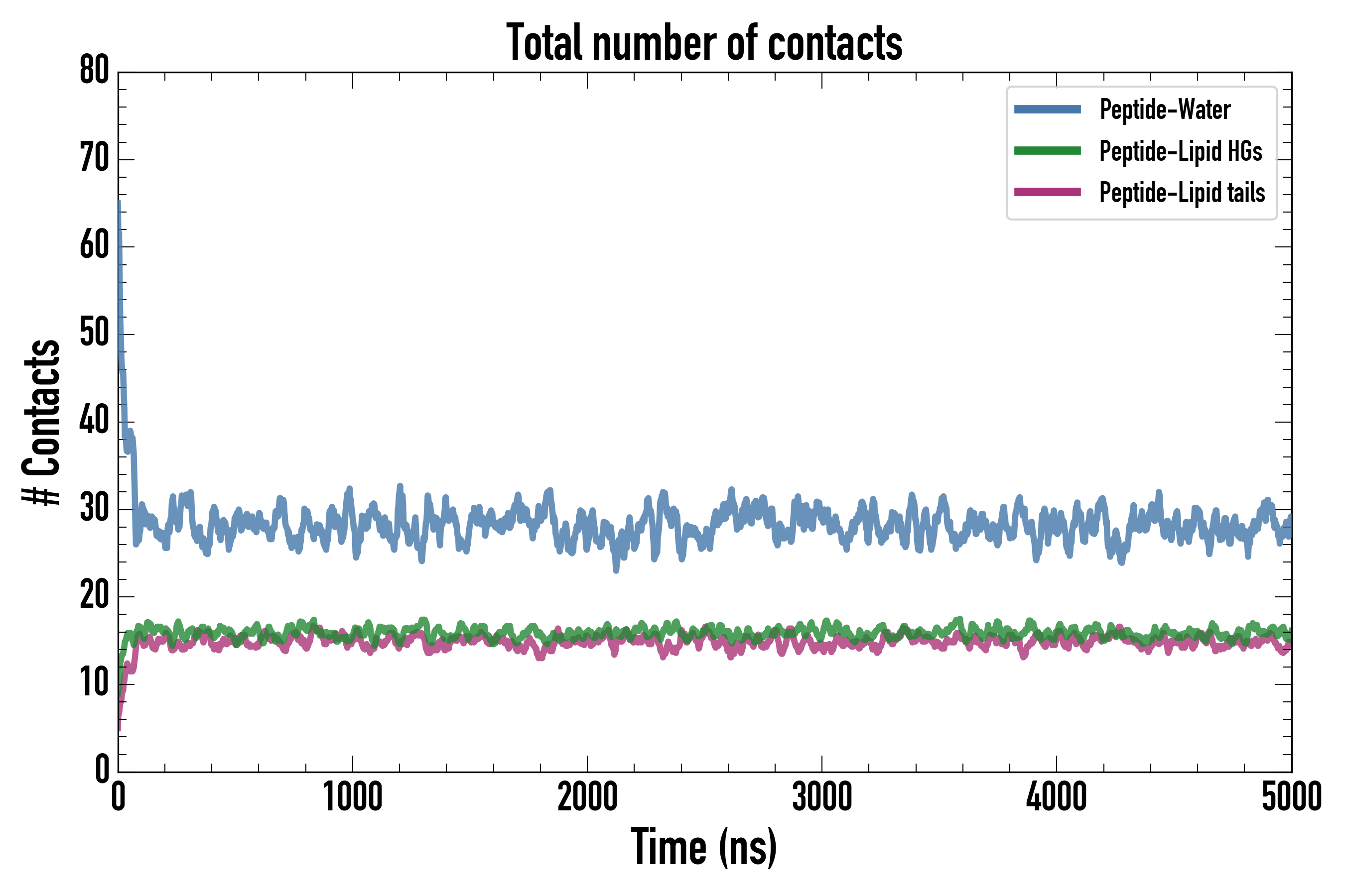 Number of contacts between each residue of the peptide backbone and the different lipid types, averaged over the last microsecond and using a cut-off of 0.6 nm.