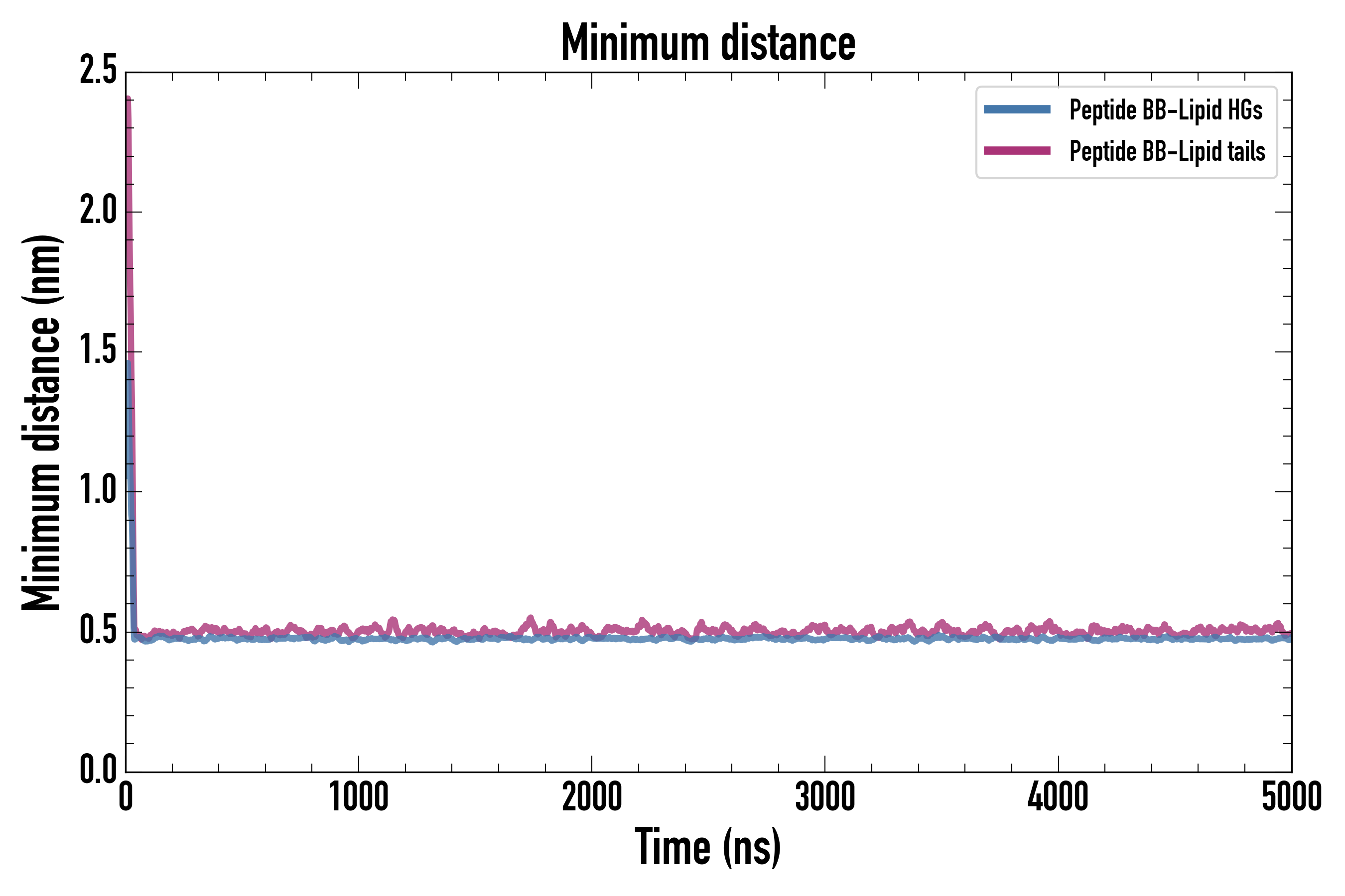 Number of contacts between each residue of the peptide backbone and the different lipid types, averaged over the last microsecond and using a cut-off of 0.6 nm.