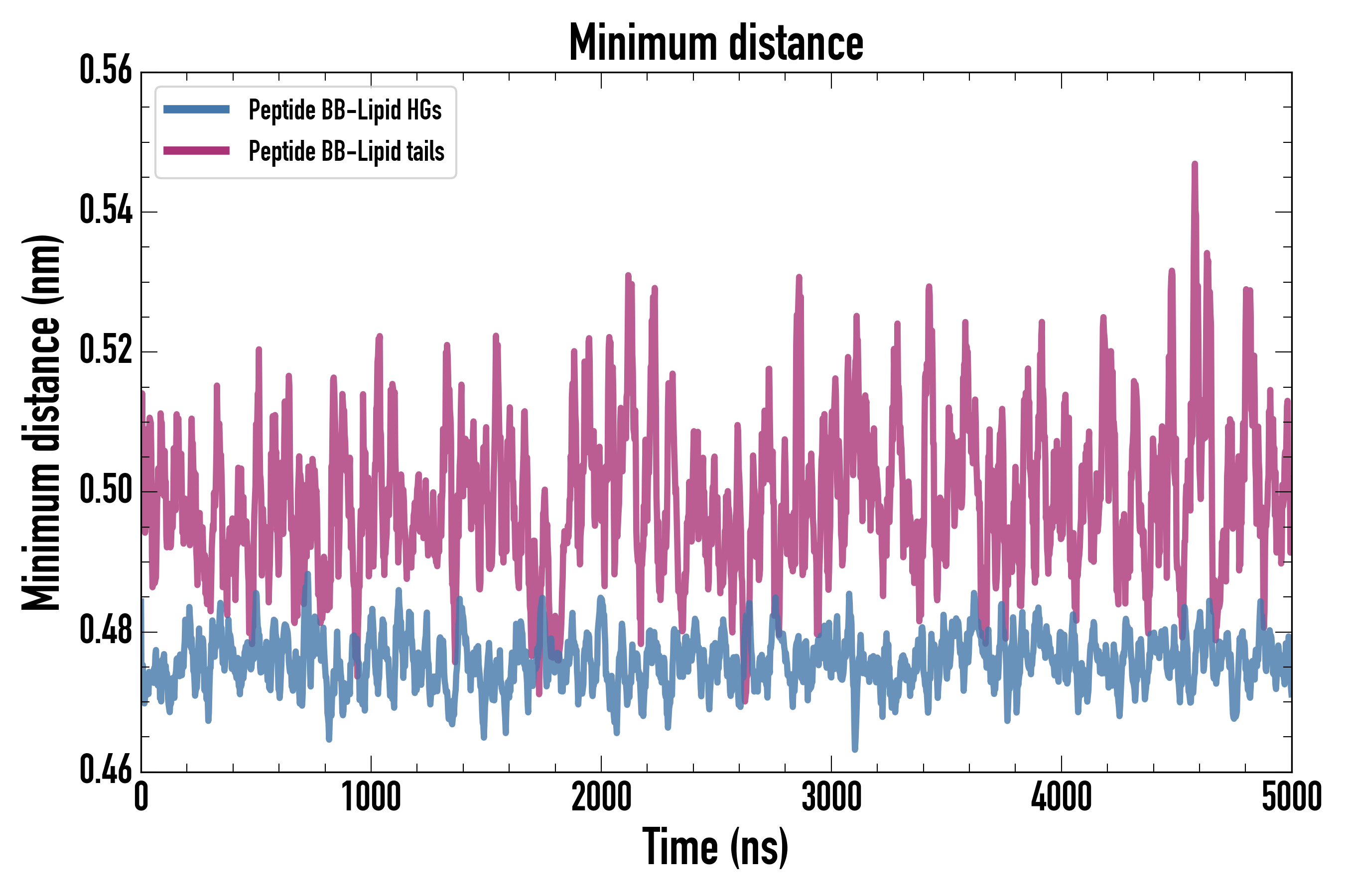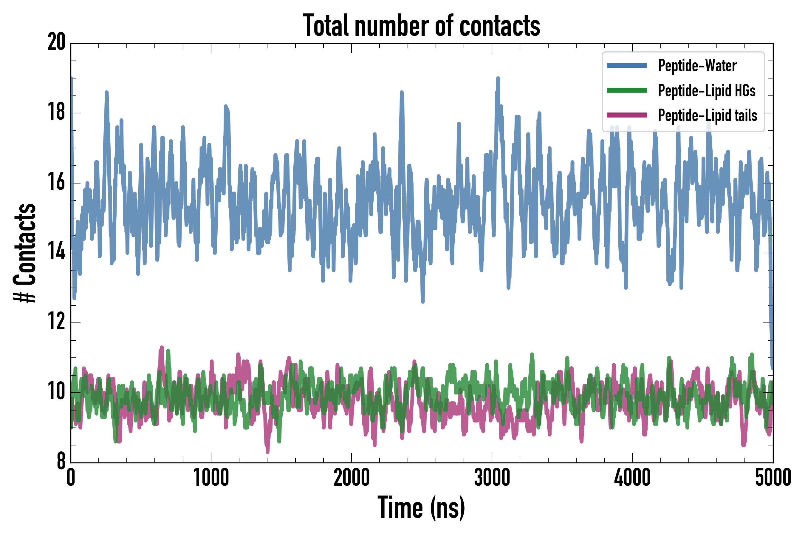 Number of contacts between each residue of the peptide backbone and the different lipid types, averaged over the last microsecond and using a cut-off of 0.6 nm.
