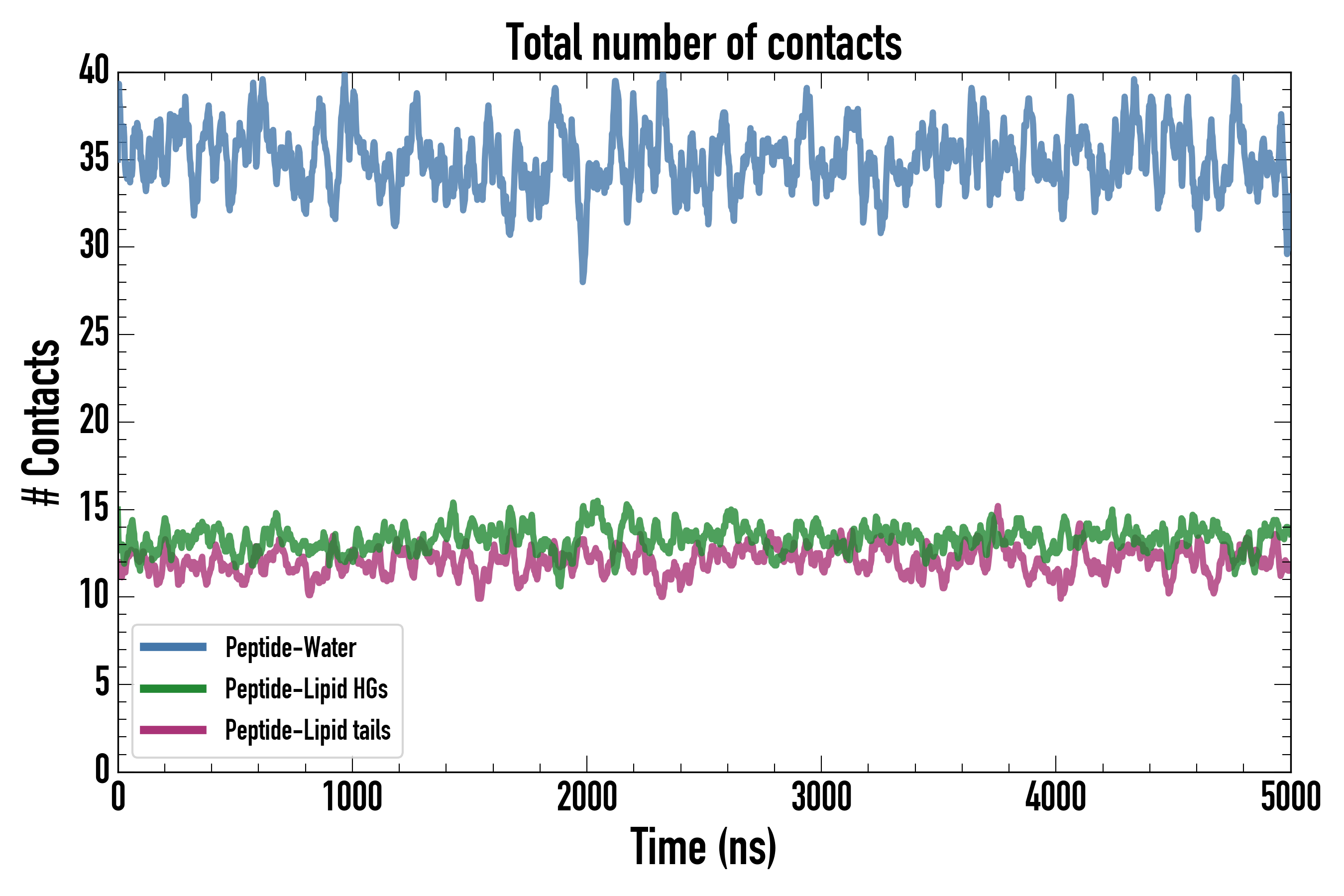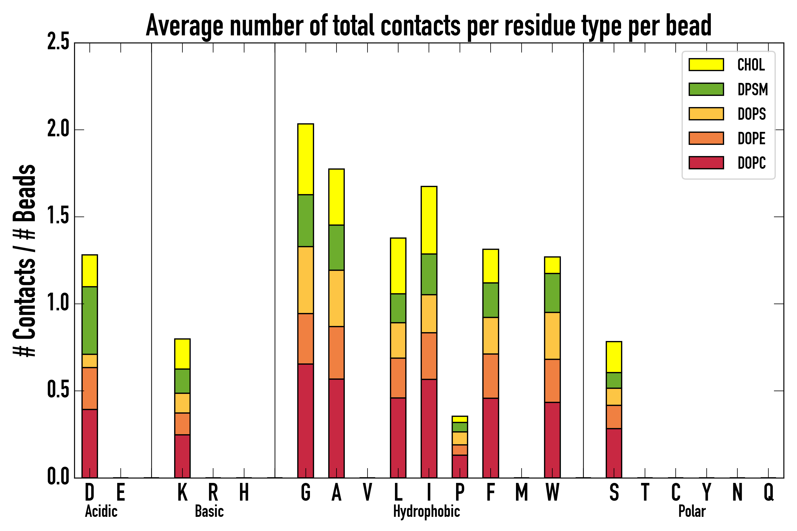 Number of contacts between each residue of the peptide backbone and the different lipid types, averaged over the last microsecond and using a cut-off of 0.6 nm.
