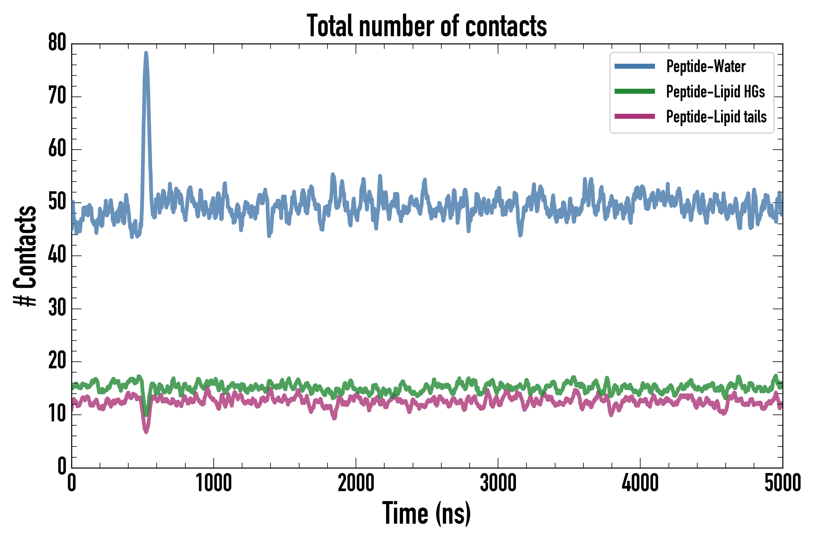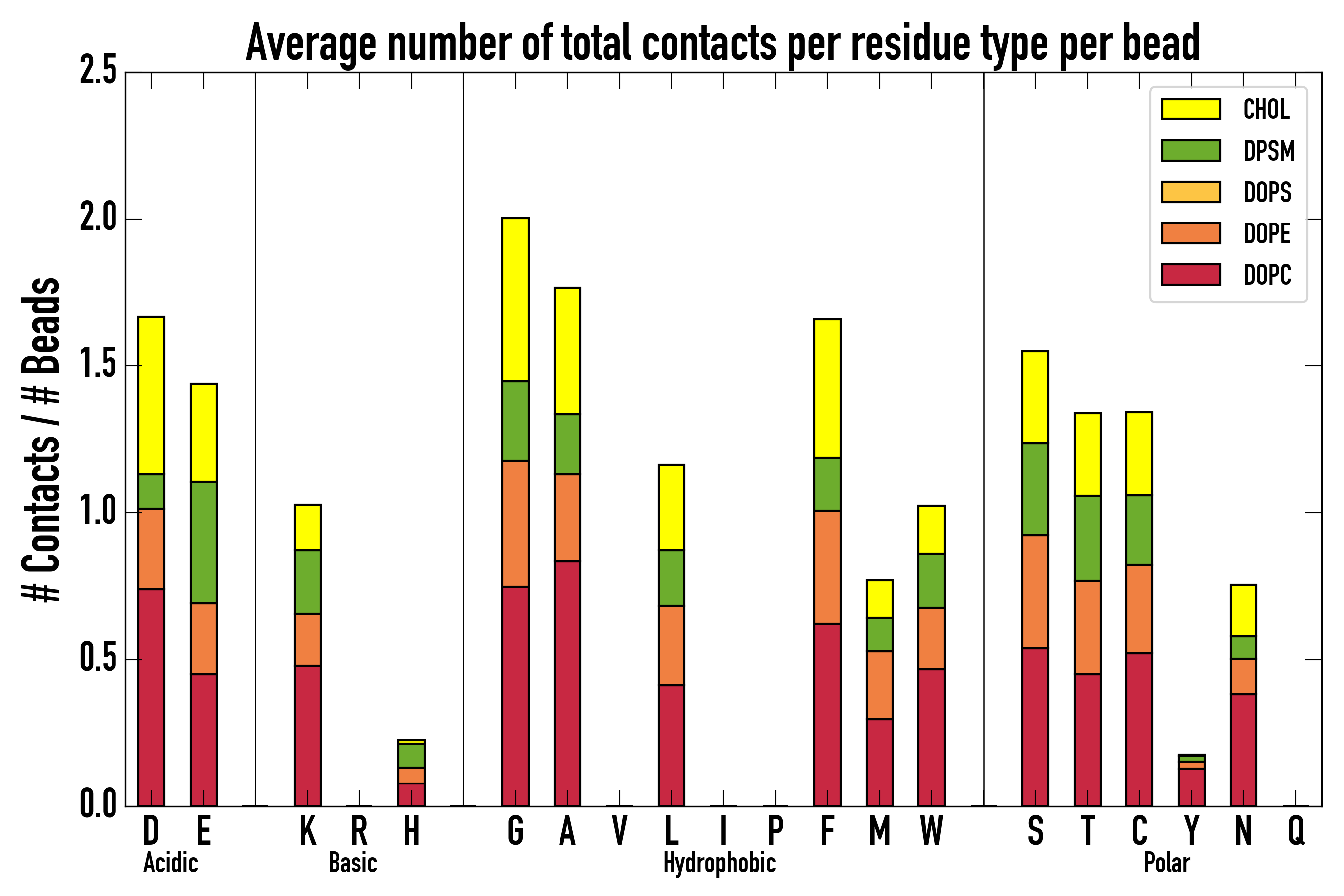 Number of contacts between each residue of the peptide backbone and the different lipid types, averaged over the last microsecond and using a cut-off of 0.6 nm.