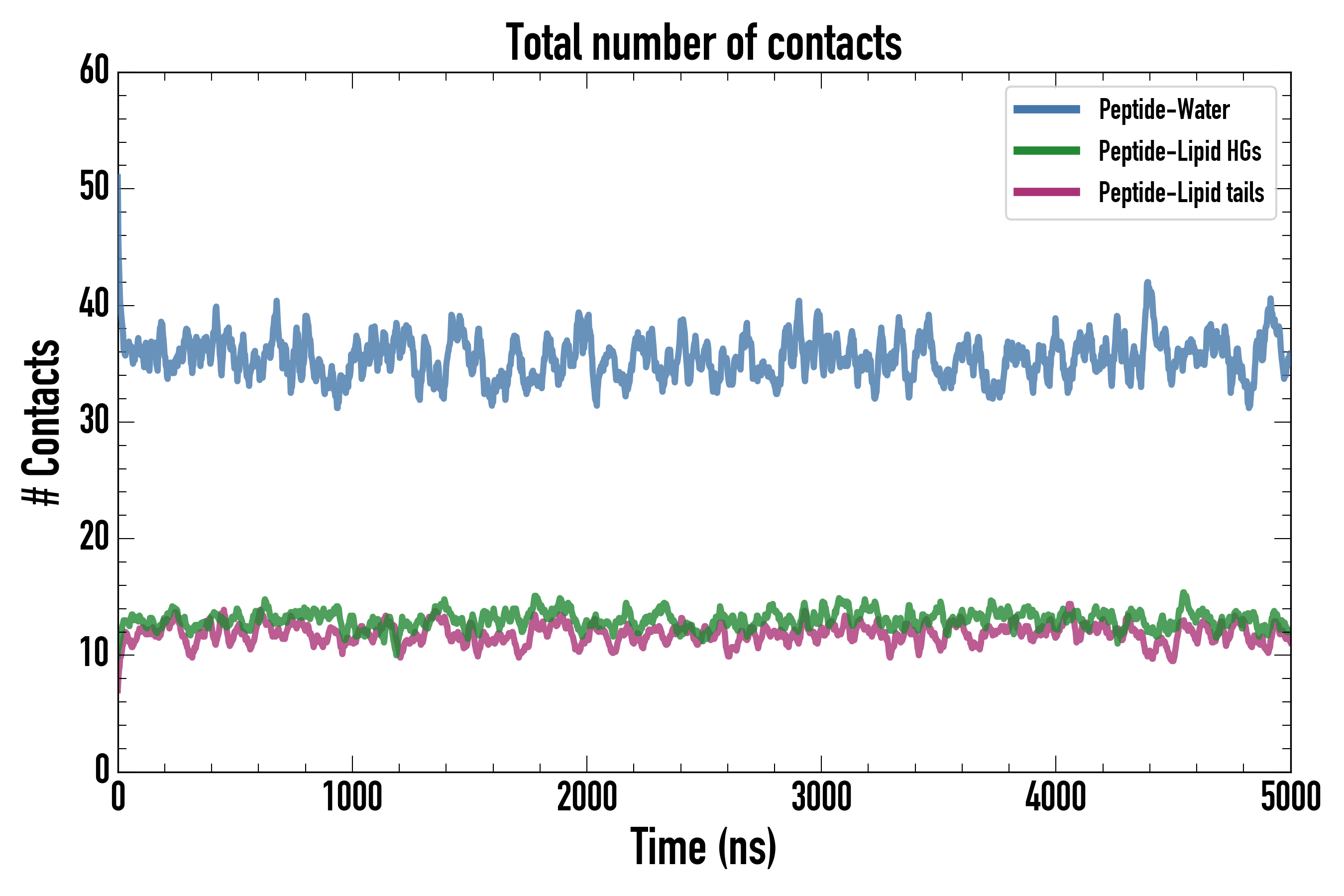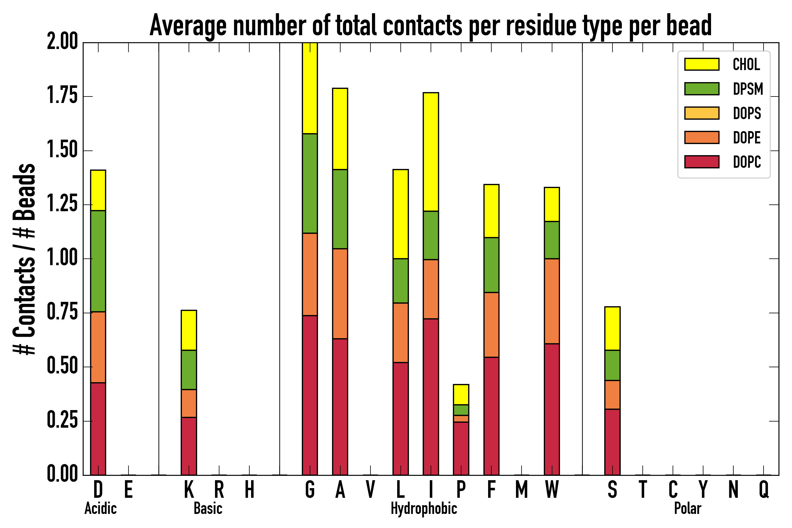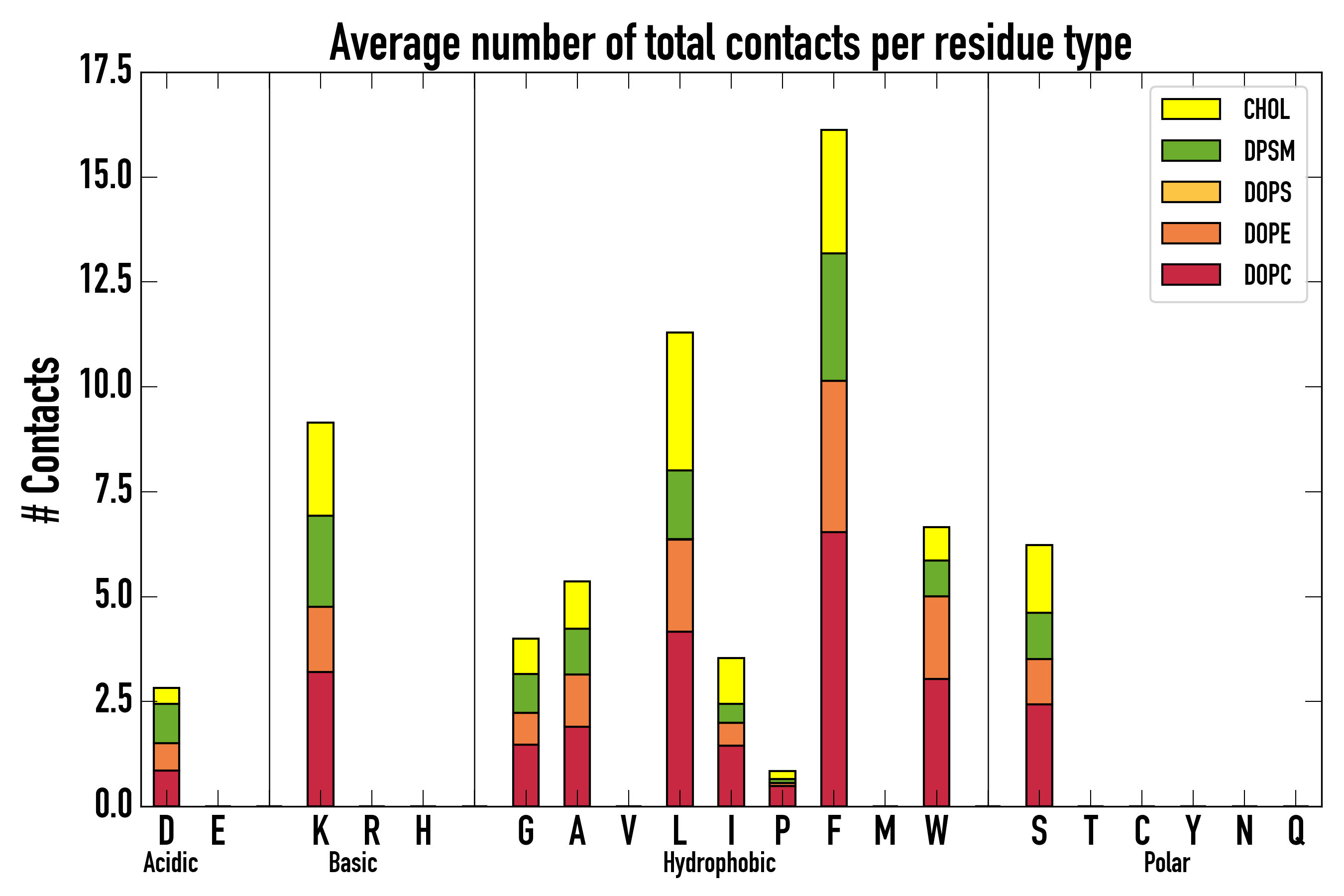 Number of contacts between each residue of the peptide backbone and the different lipid types, averaged over the last microsecond and using a cut-off of 0.6 nm.