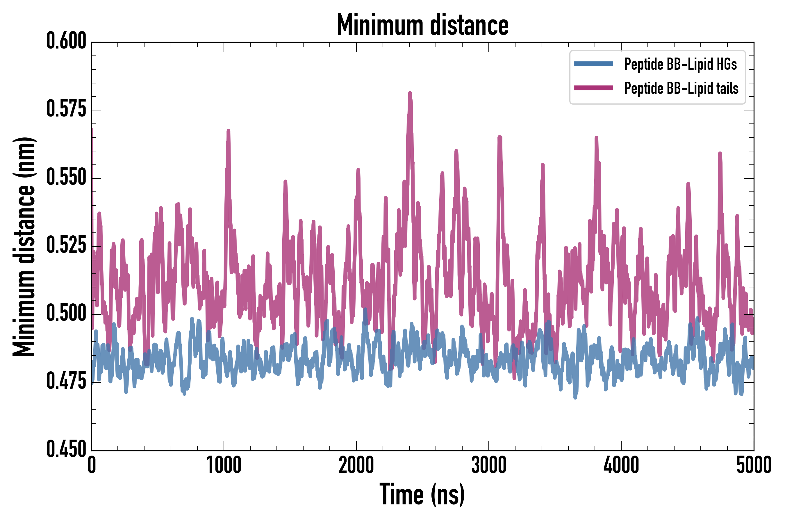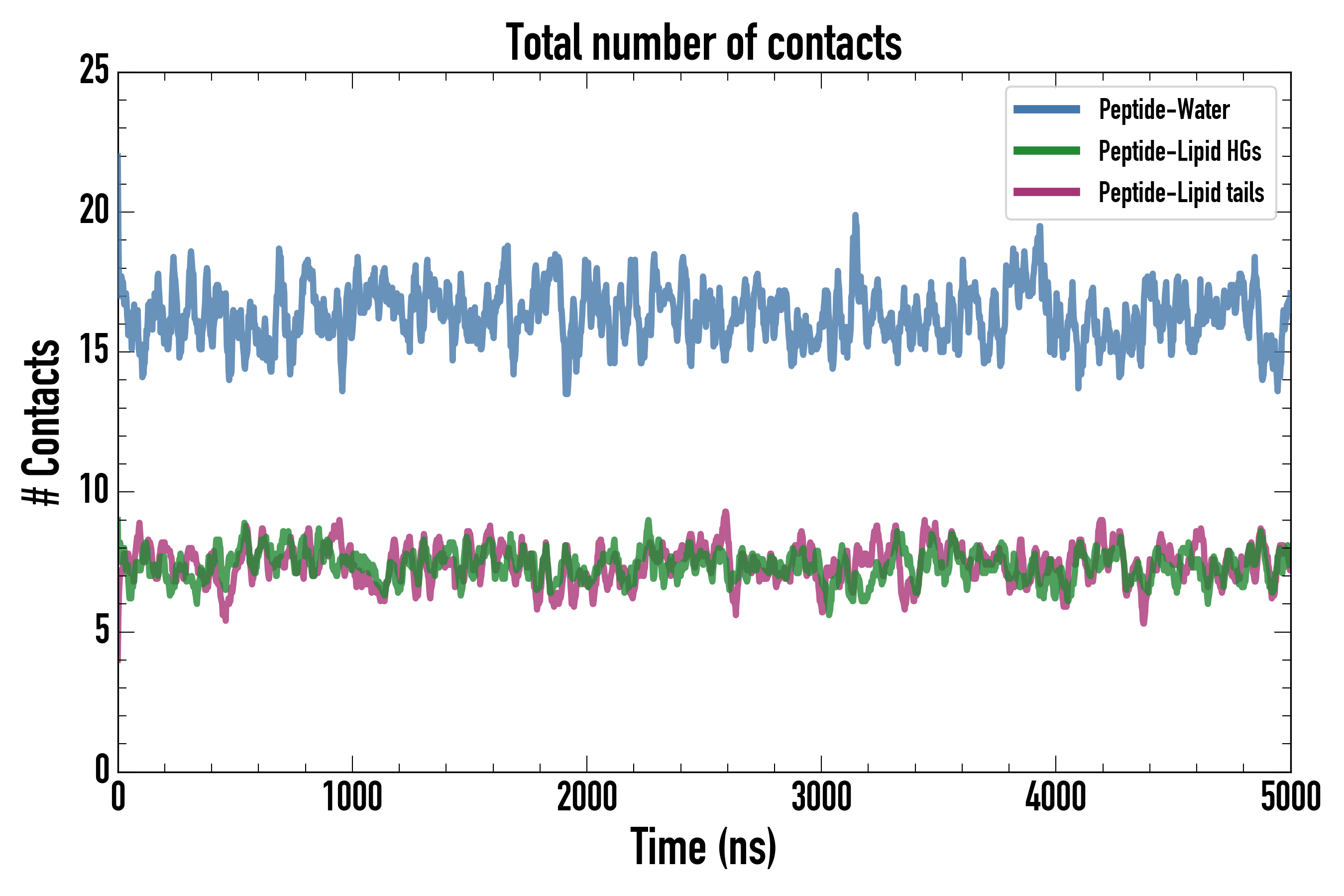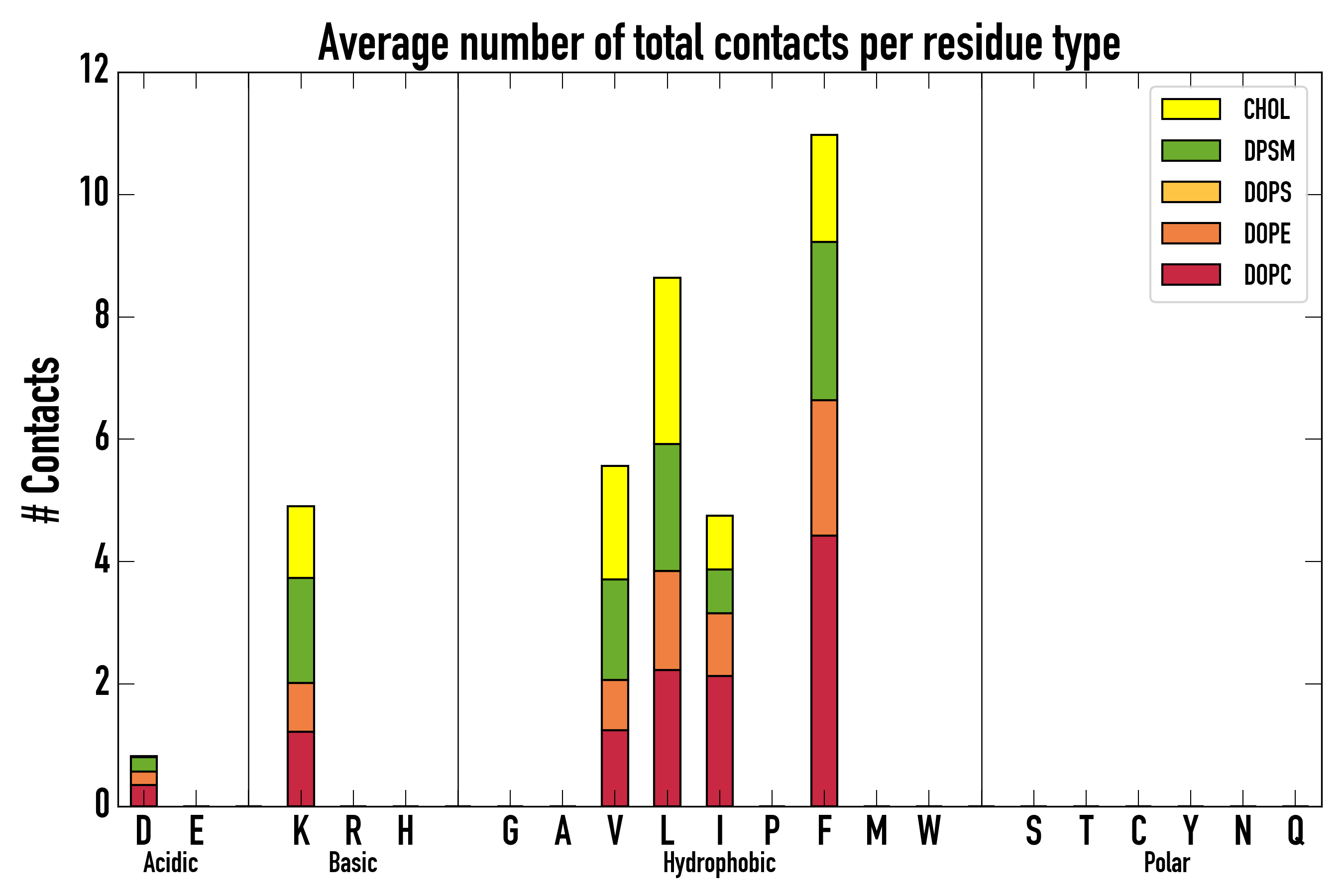 Number of contacts between each residue of the peptide backbone and the different lipid types, averaged over the last microsecond and using a cut-off of 0.6 nm.