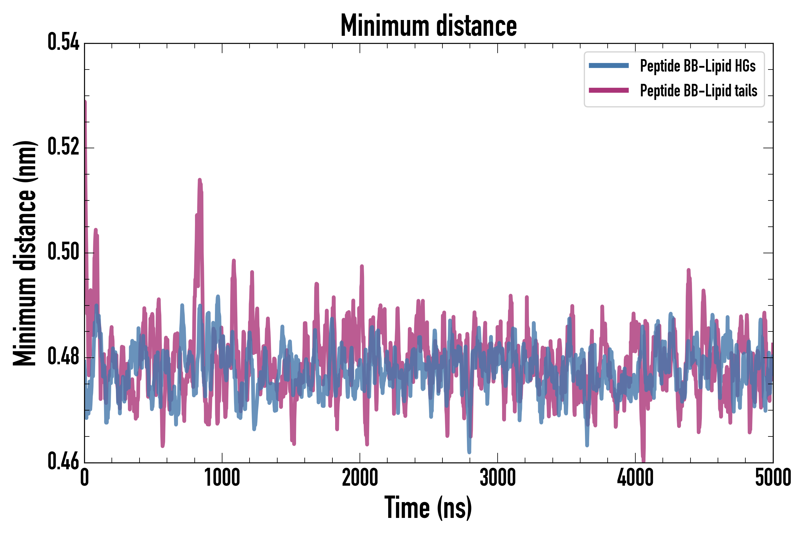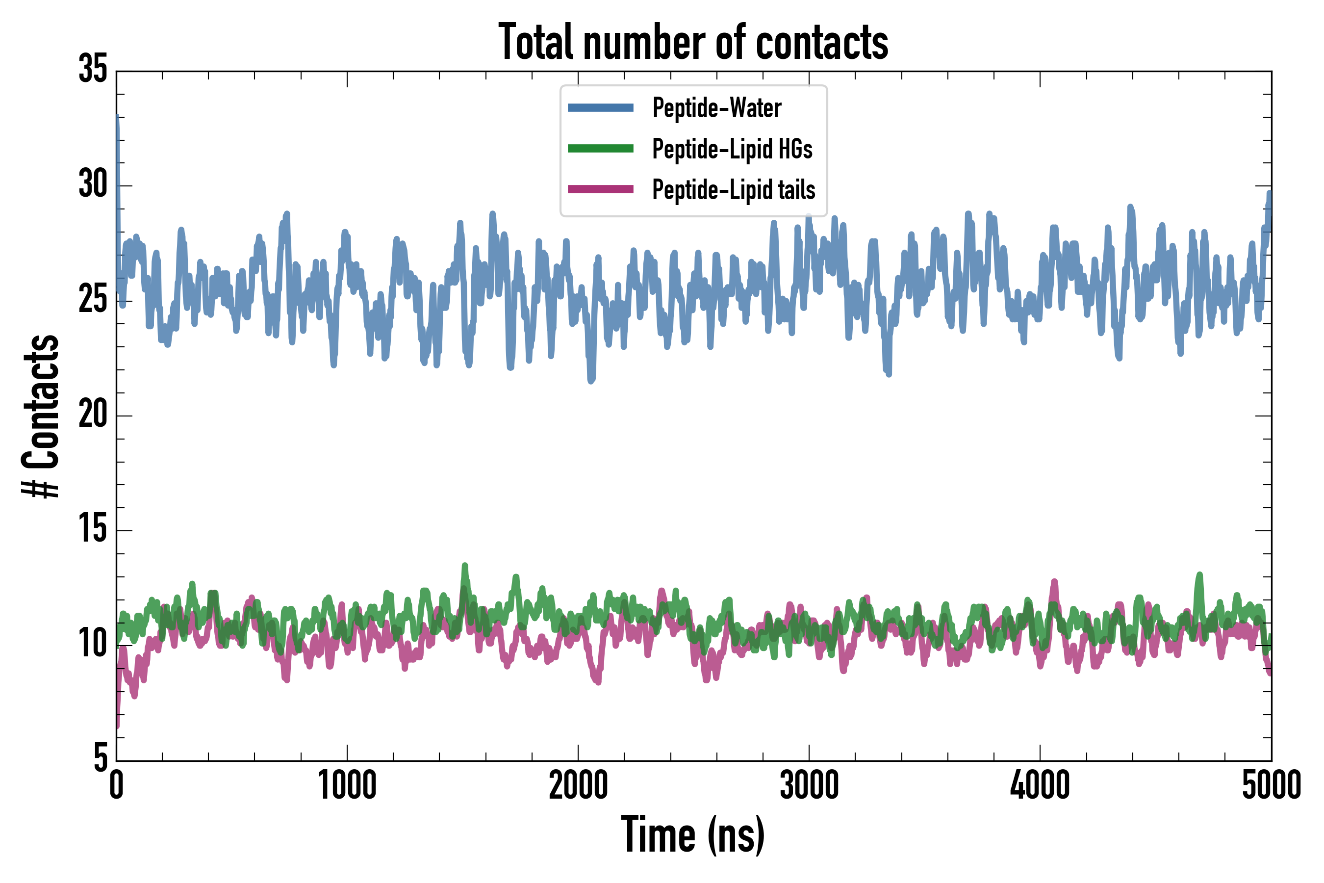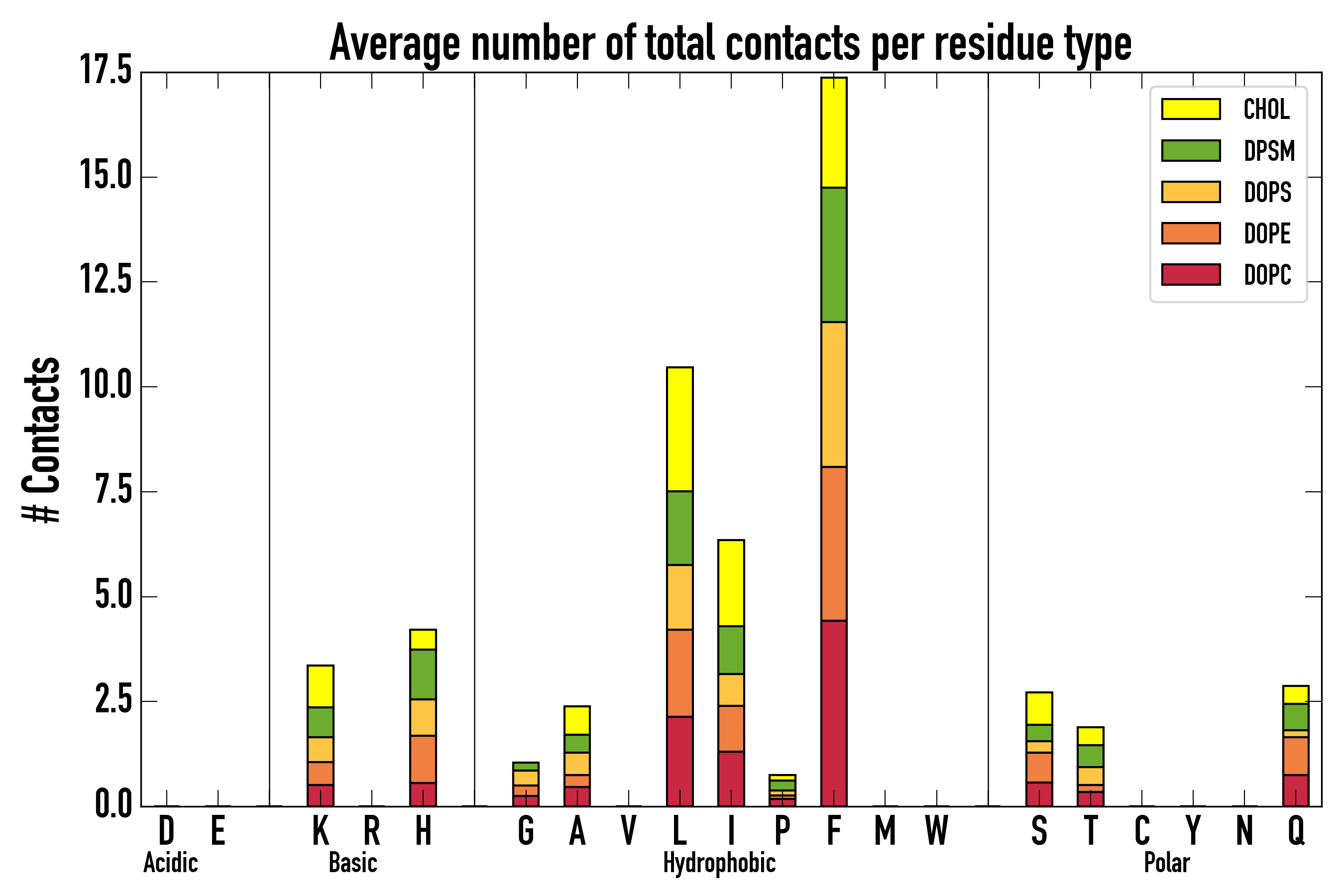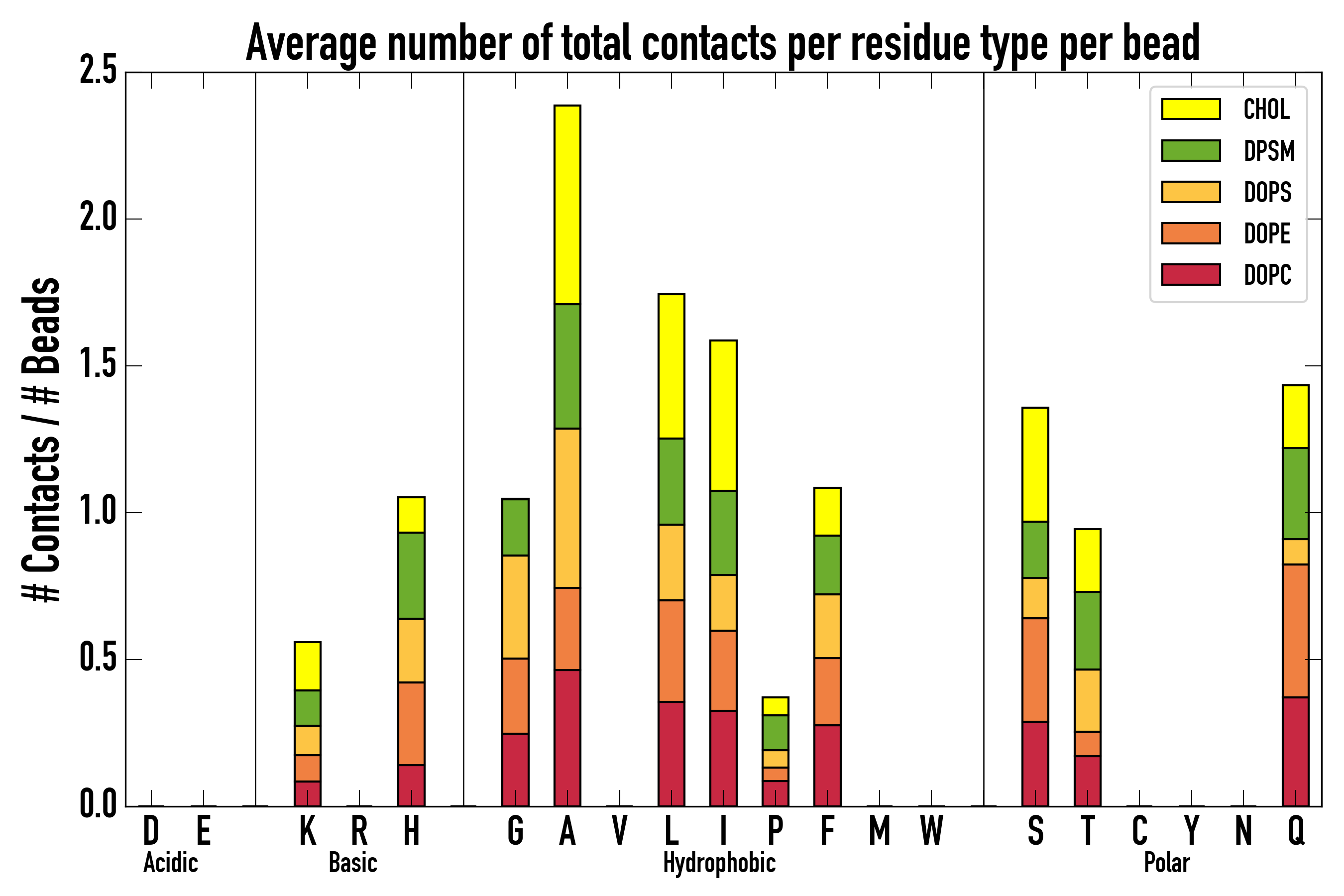 Number of contacts between each residue of the peptide backbone and the different lipid types, averaged over the last microsecond and using a cut-off of 0.6 nm.