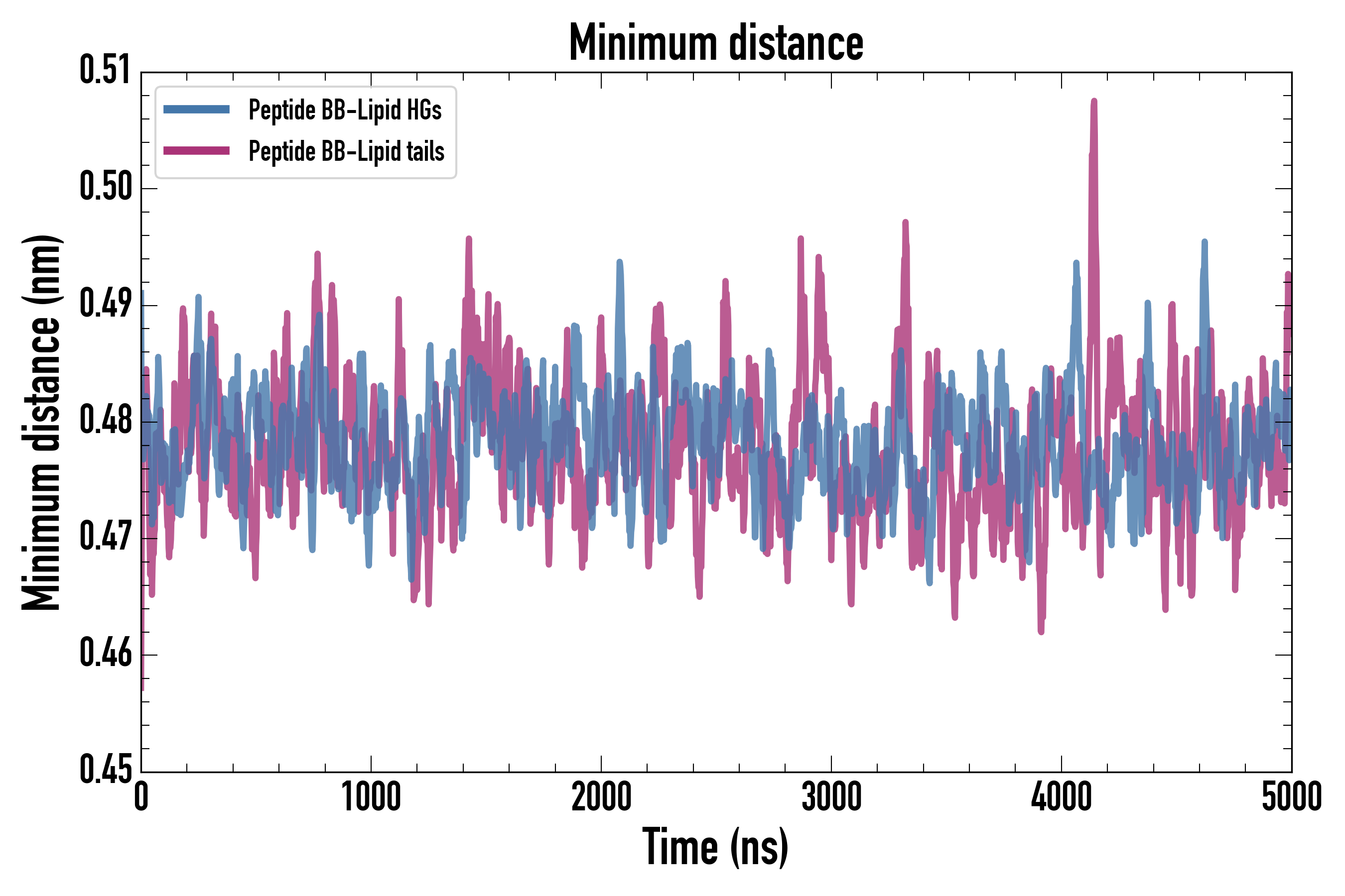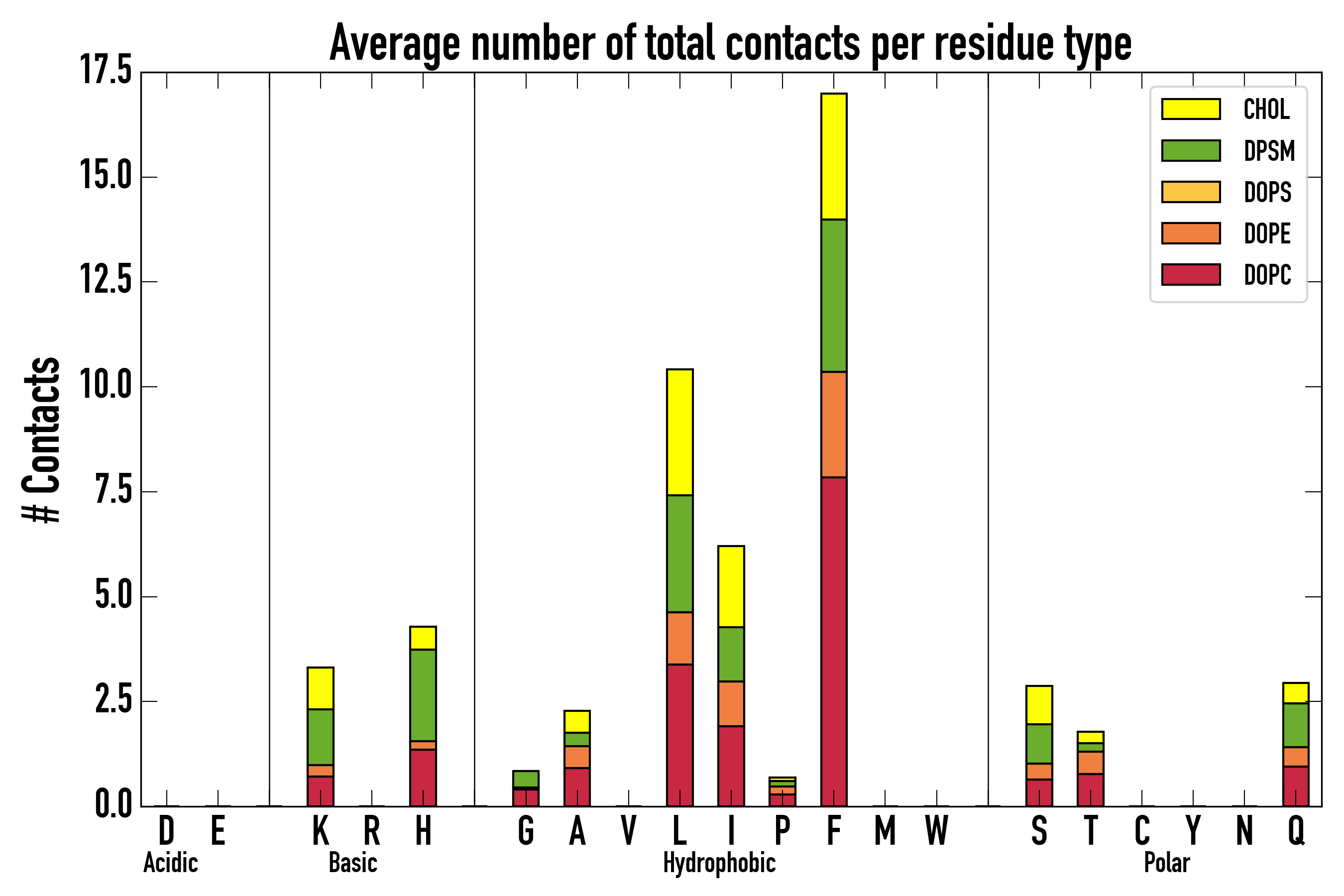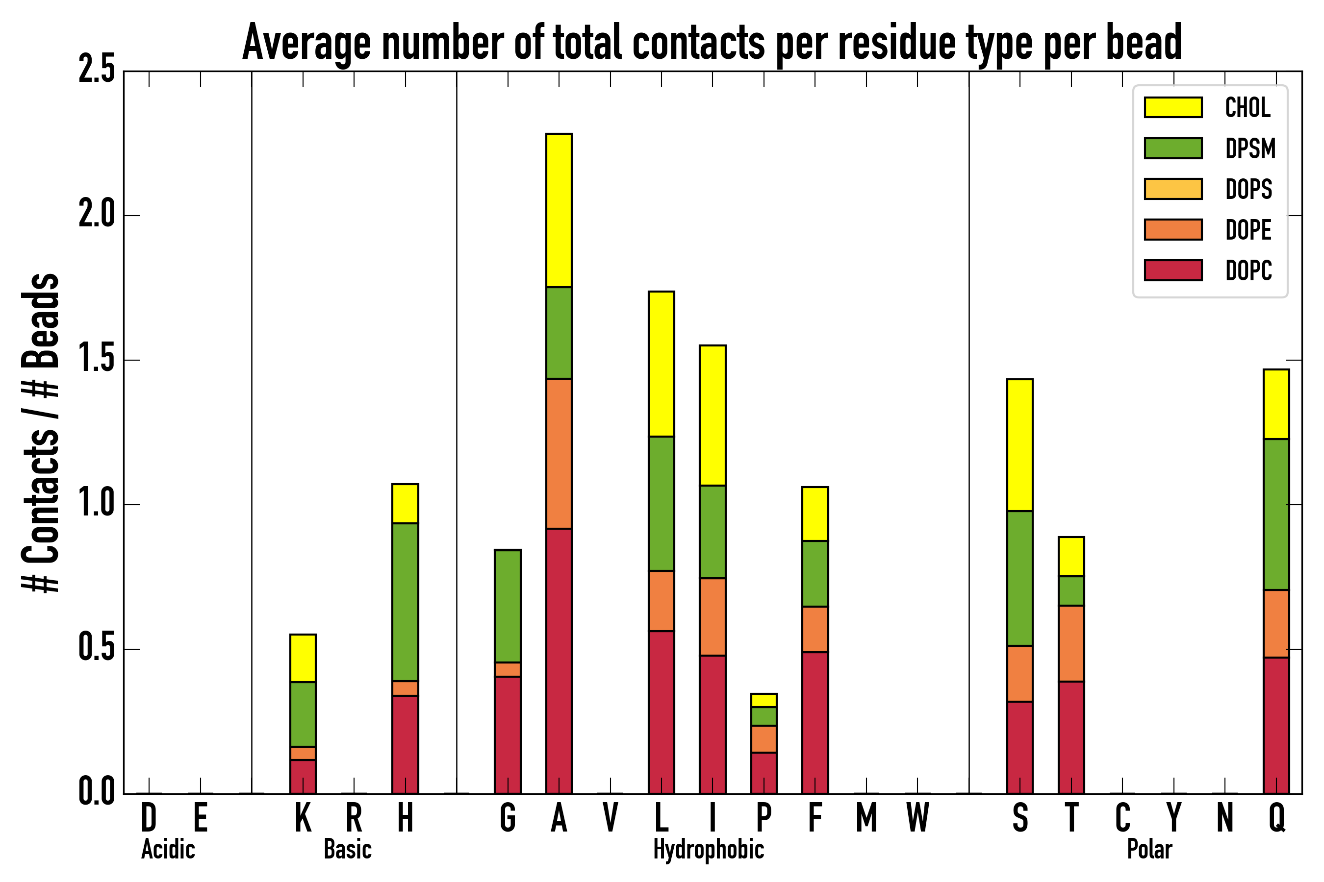 Number of contacts between each residue of the peptide backbone and the different lipid types, averaged over the last microsecond and using a cut-off of 0.6 nm.