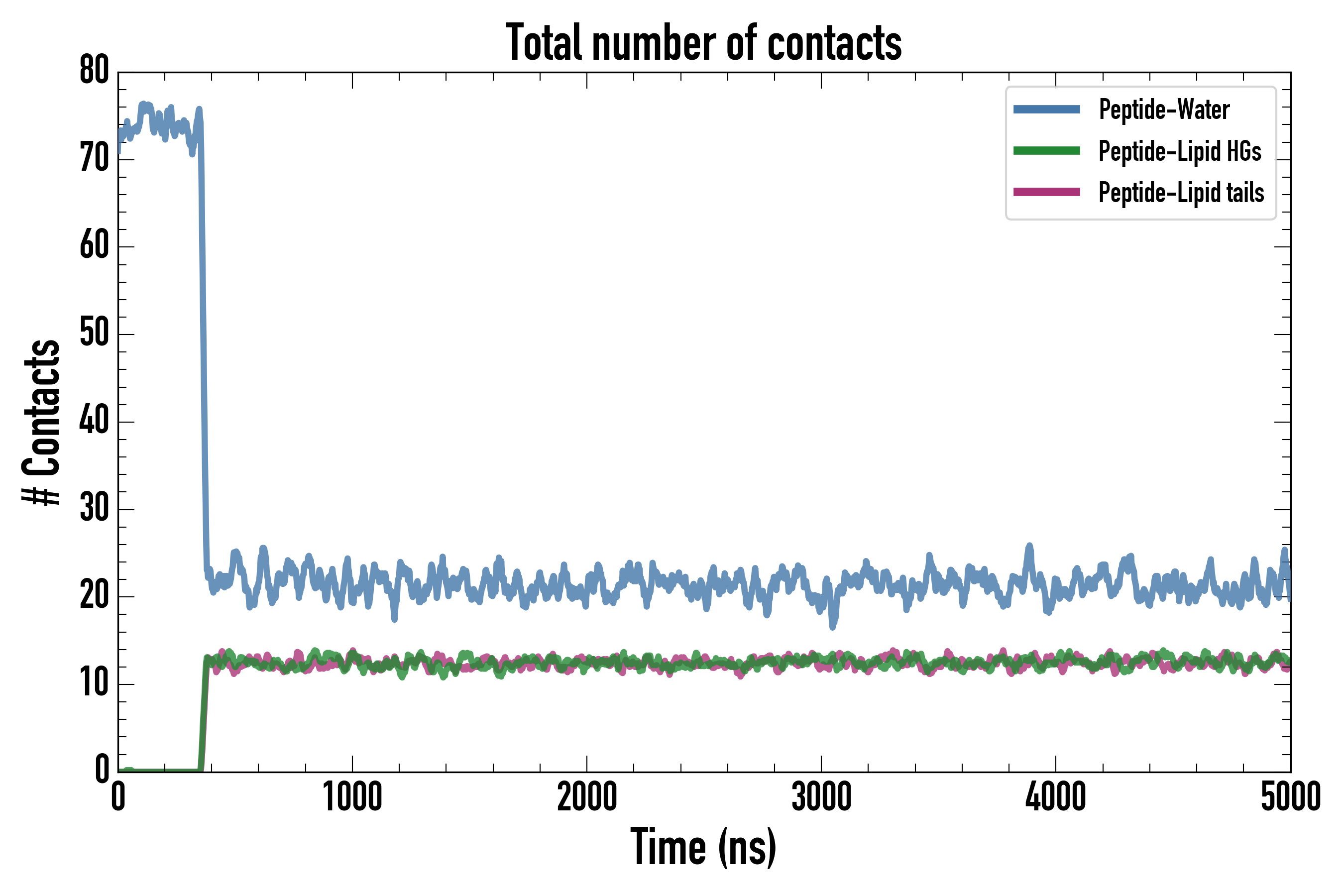 Number of contacts between each residue of the peptide backbone and the different lipid types, averaged over the last microsecond and using a cut-off of 0.6 nm.