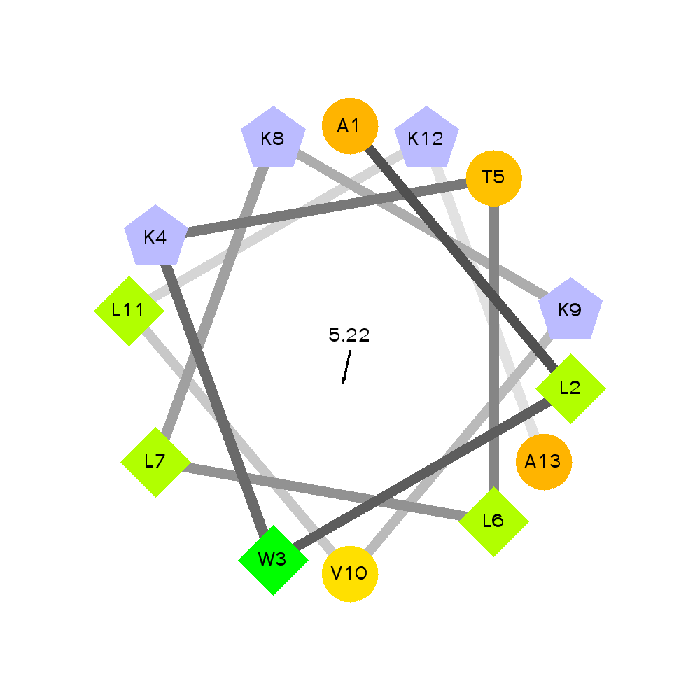By amino acid: Basic: 4 Acidic: 0 Hydrophobic: 8 Polar: 1 Electrostatic Dipolar Moment (e nm): 2.79