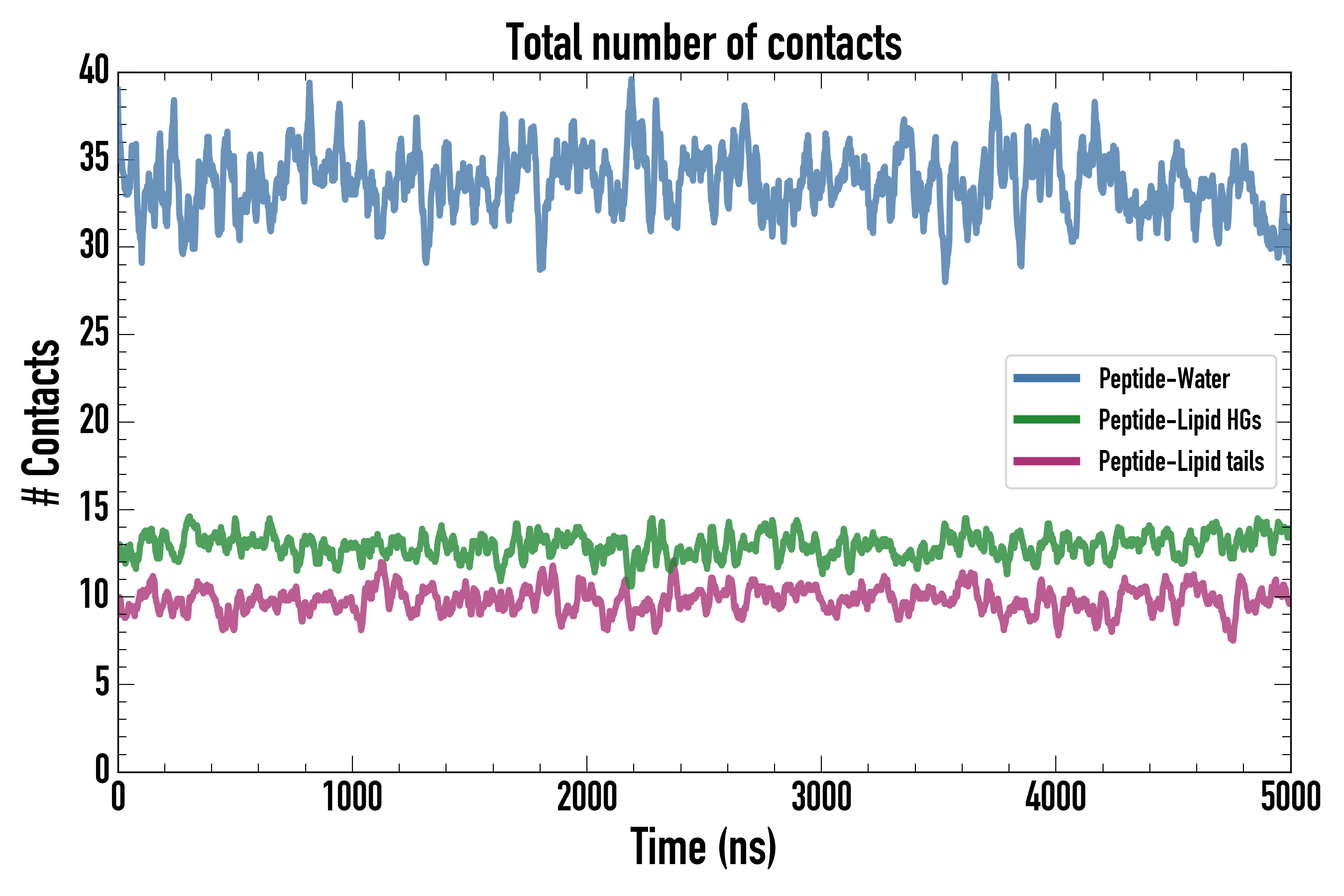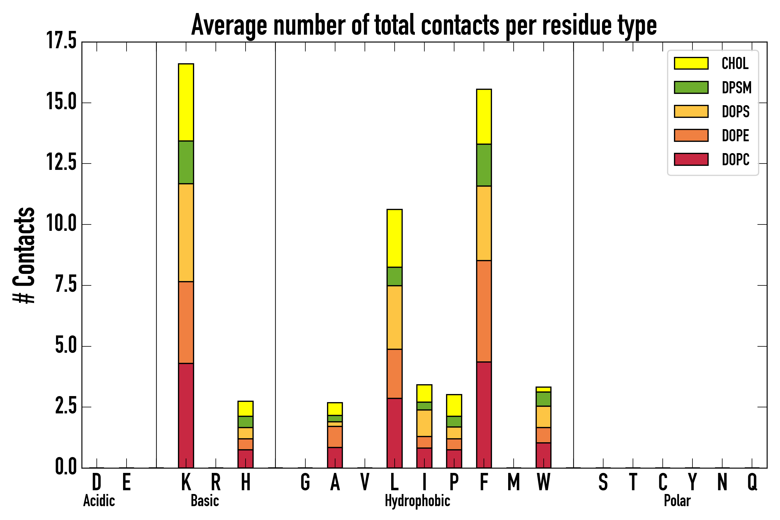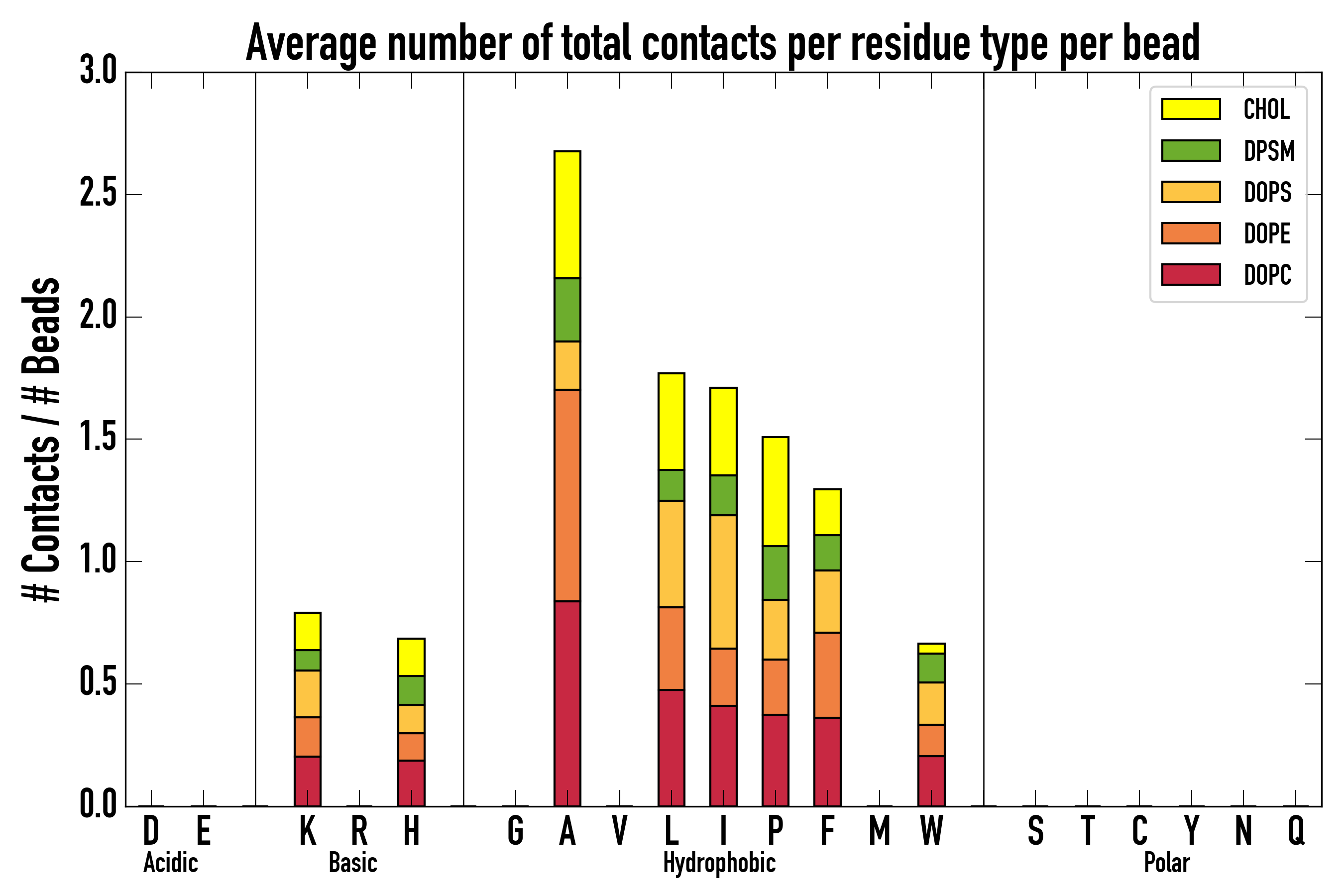 Number of contacts between each residue of the peptide backbone and the different lipid types, averaged over the last microsecond and using a cut-off of 0.6 nm.