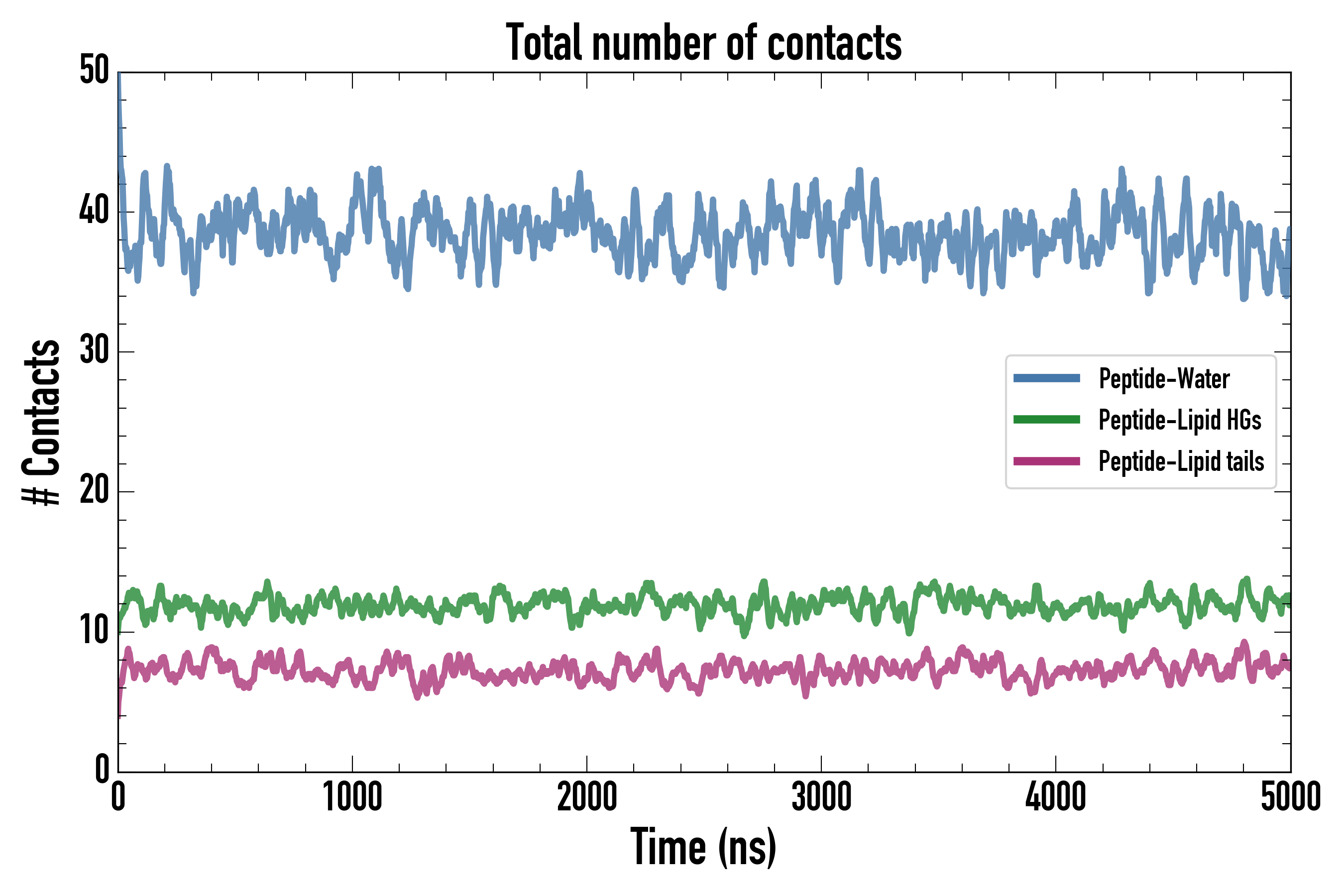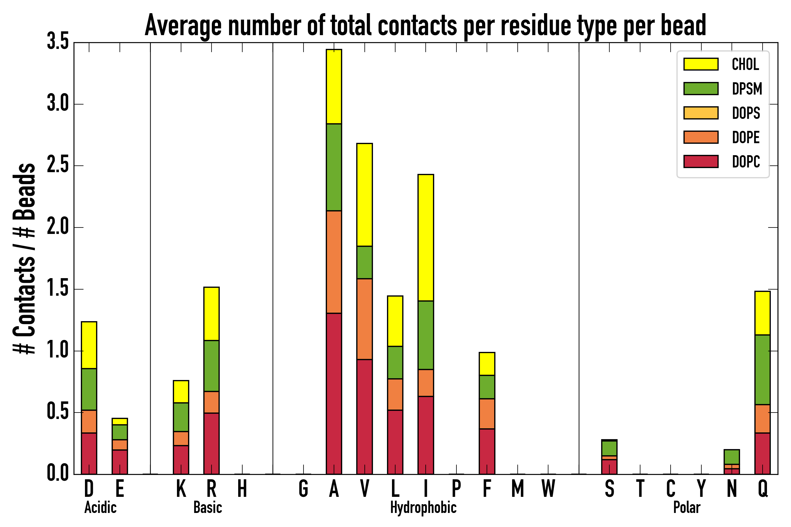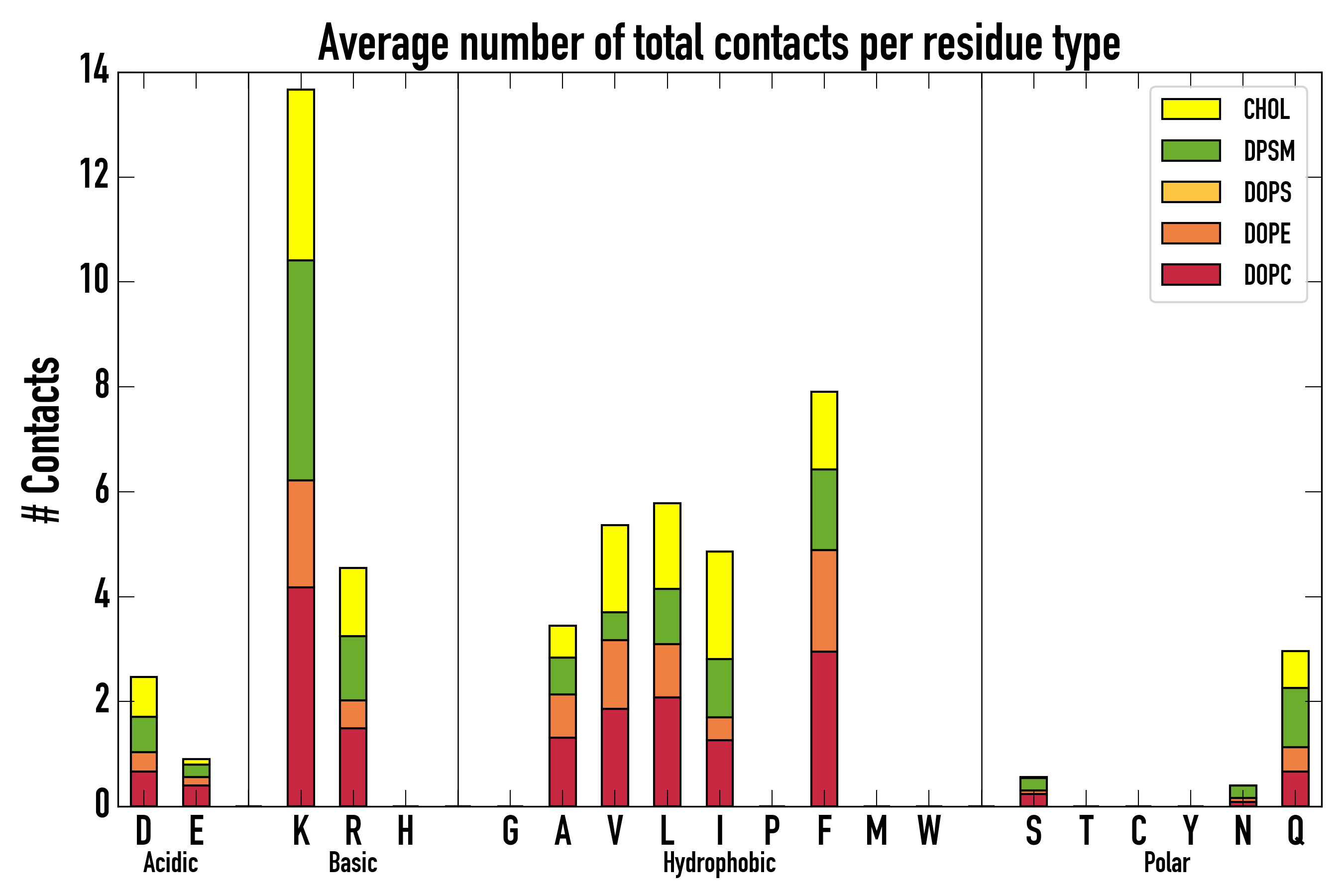 Number of contacts between each residue of the peptide backbone and the different lipid types, averaged over the last microsecond and using a cut-off of 0.6 nm.
