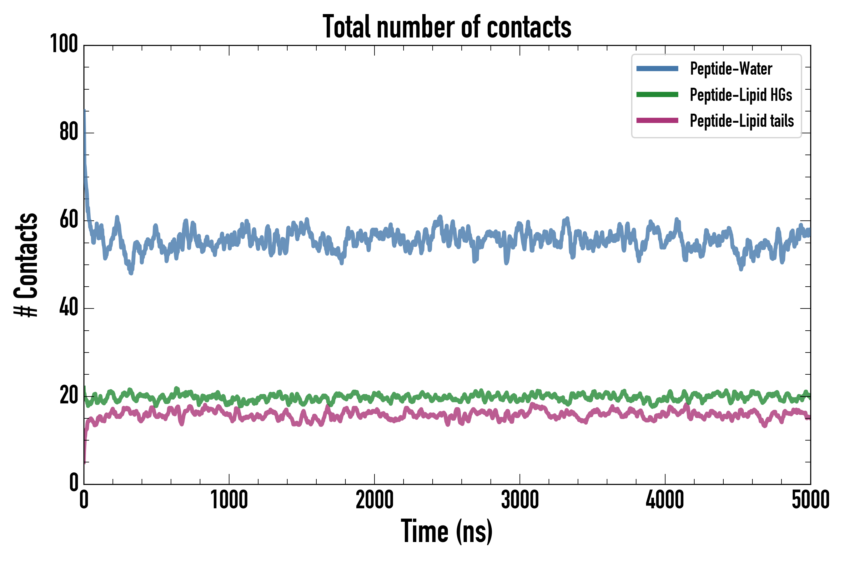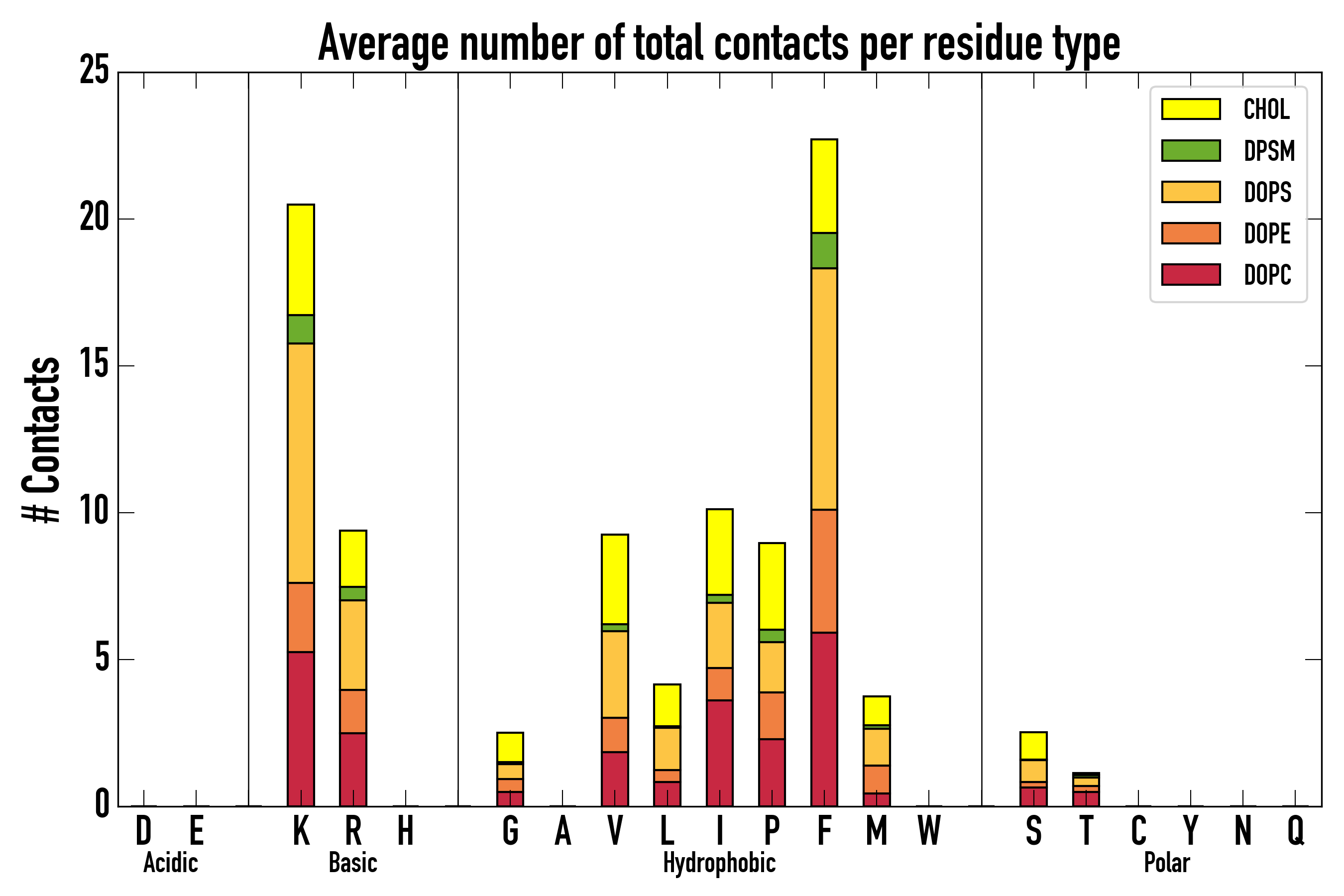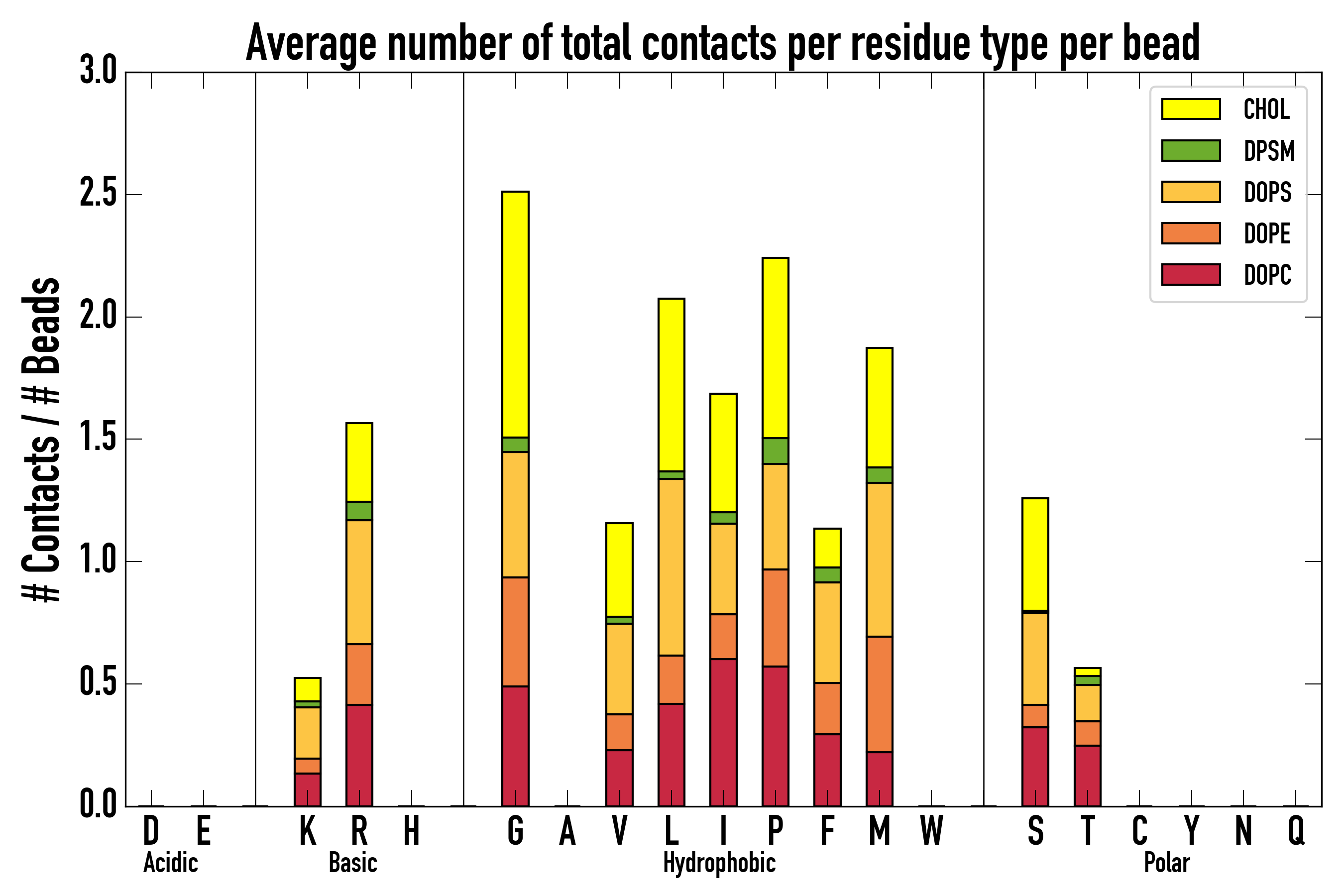 Number of contacts between each residue of the peptide backbone and the different lipid types, averaged over the last microsecond and using a cut-off of 0.6 nm.