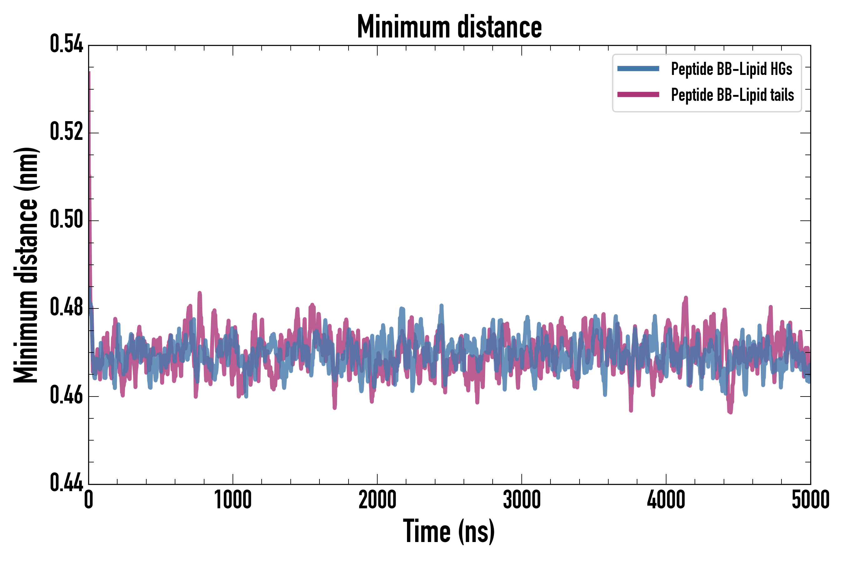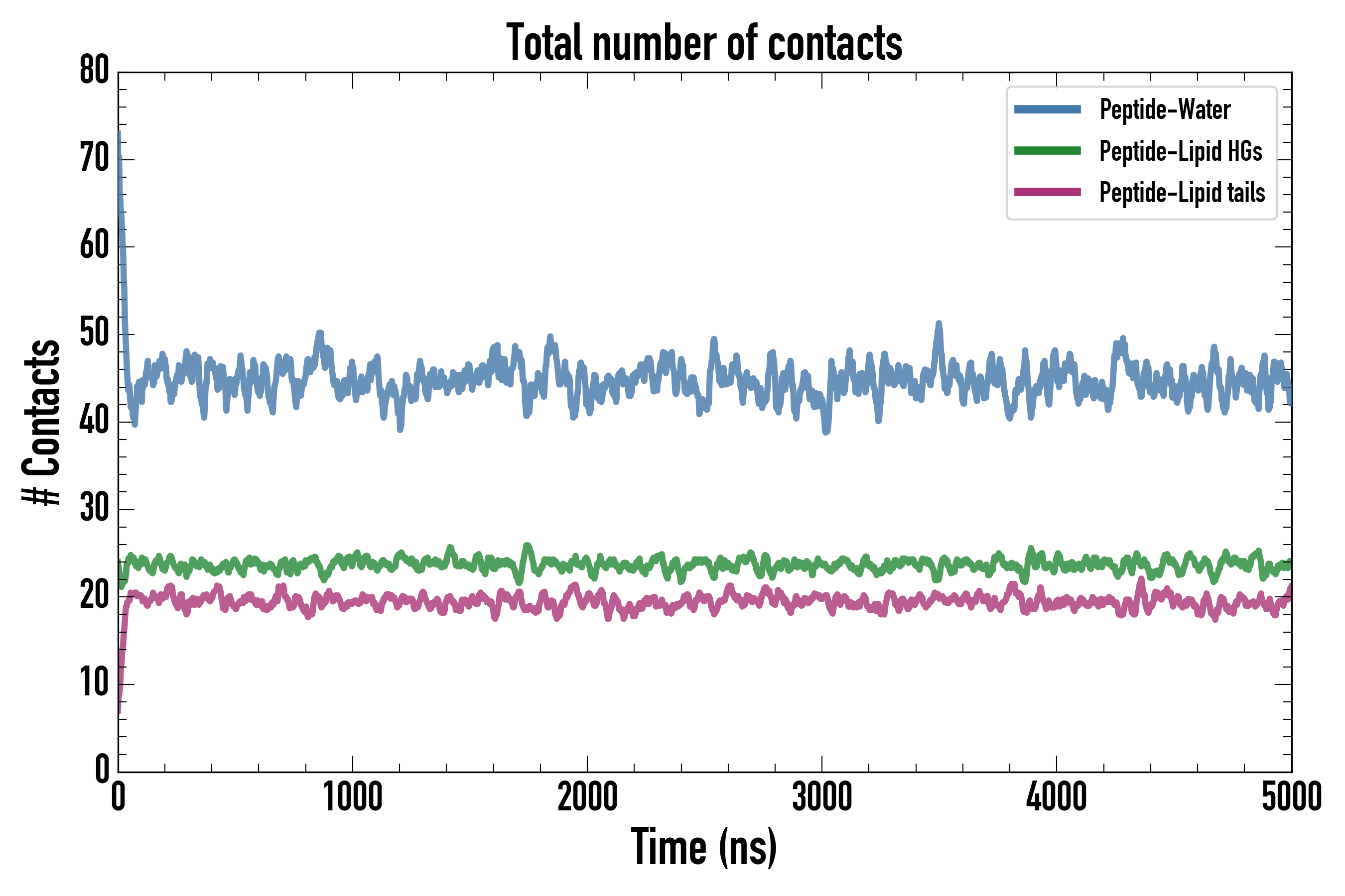 Number of contacts between each residue of the peptide backbone and the different lipid types, averaged over the last microsecond and using a cut-off of 0.6 nm.