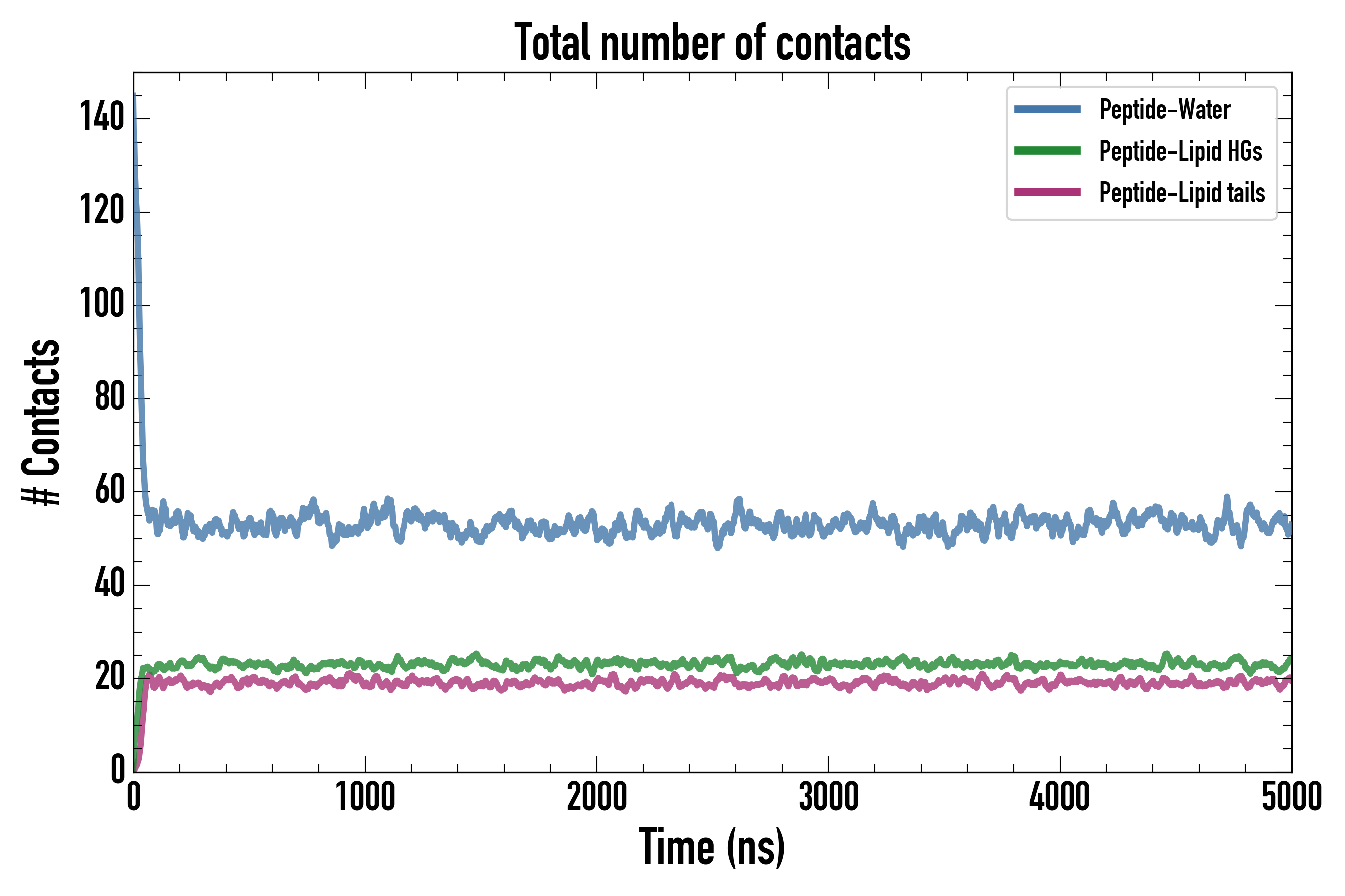 Number of contacts between each residue of the peptide backbone and the different lipid types, averaged over the last microsecond and using a cut-off of 0.6 nm.