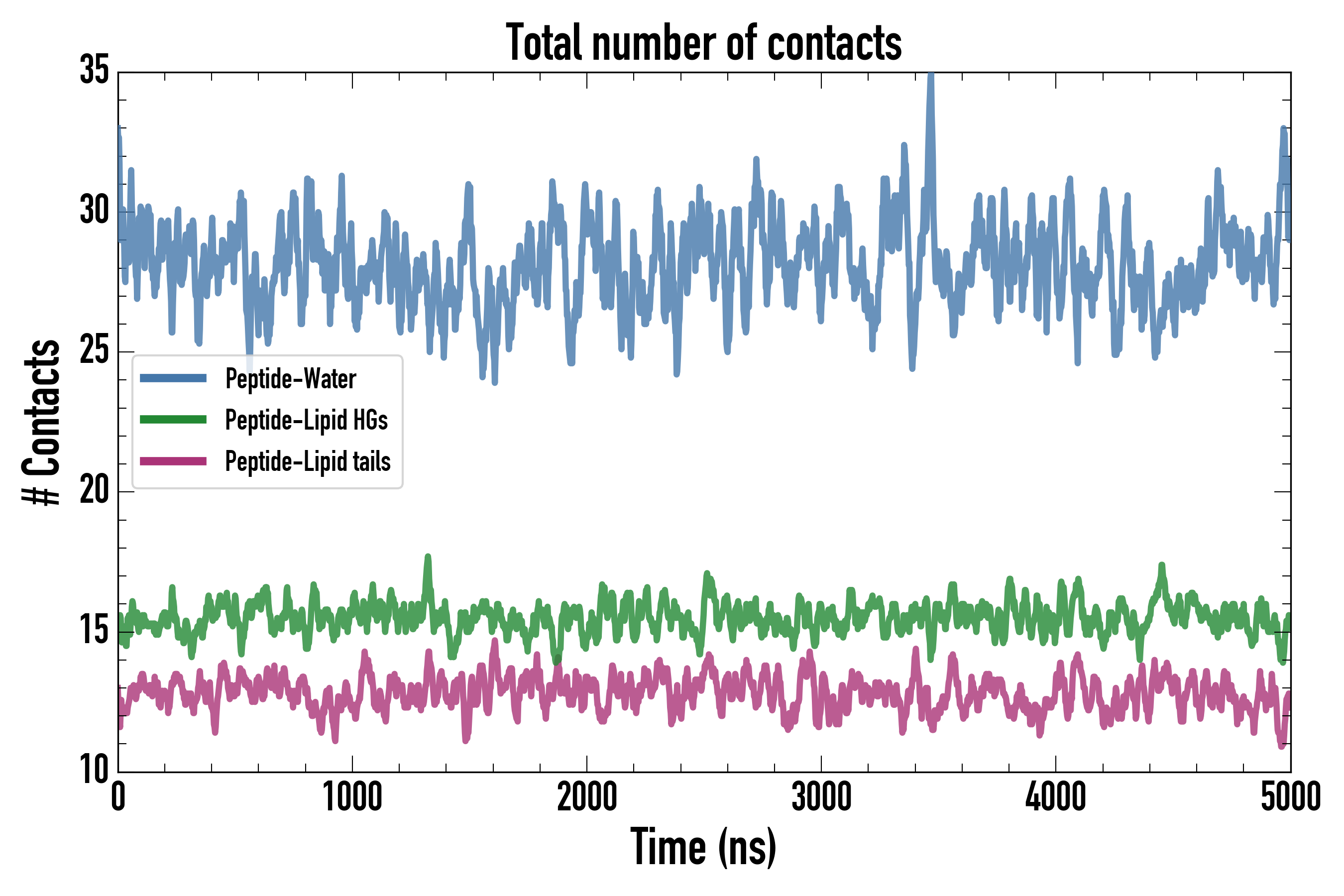 Number of contacts between each residue of the peptide backbone and the different lipid types, averaged over the last microsecond and using a cut-off of 0.6 nm.