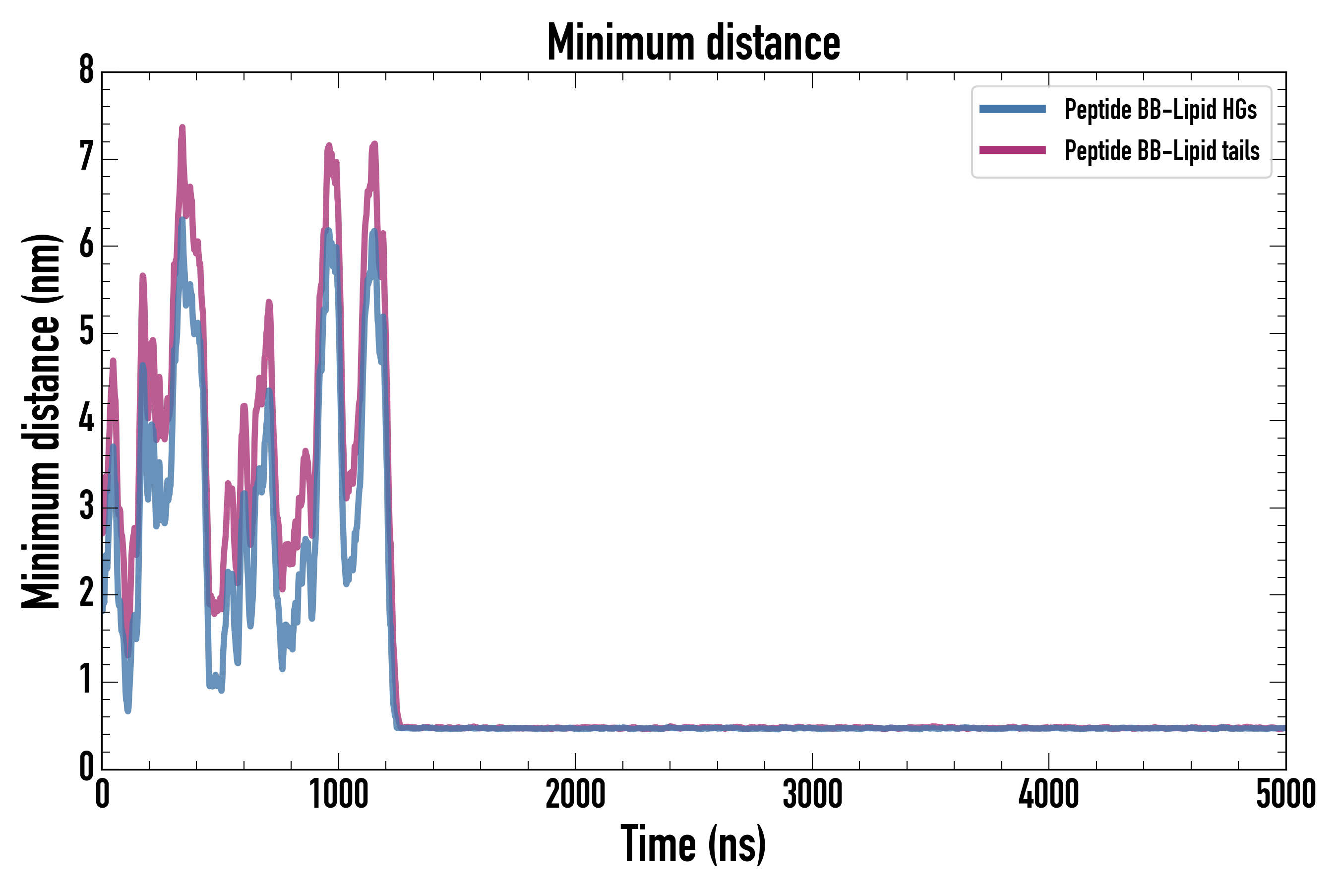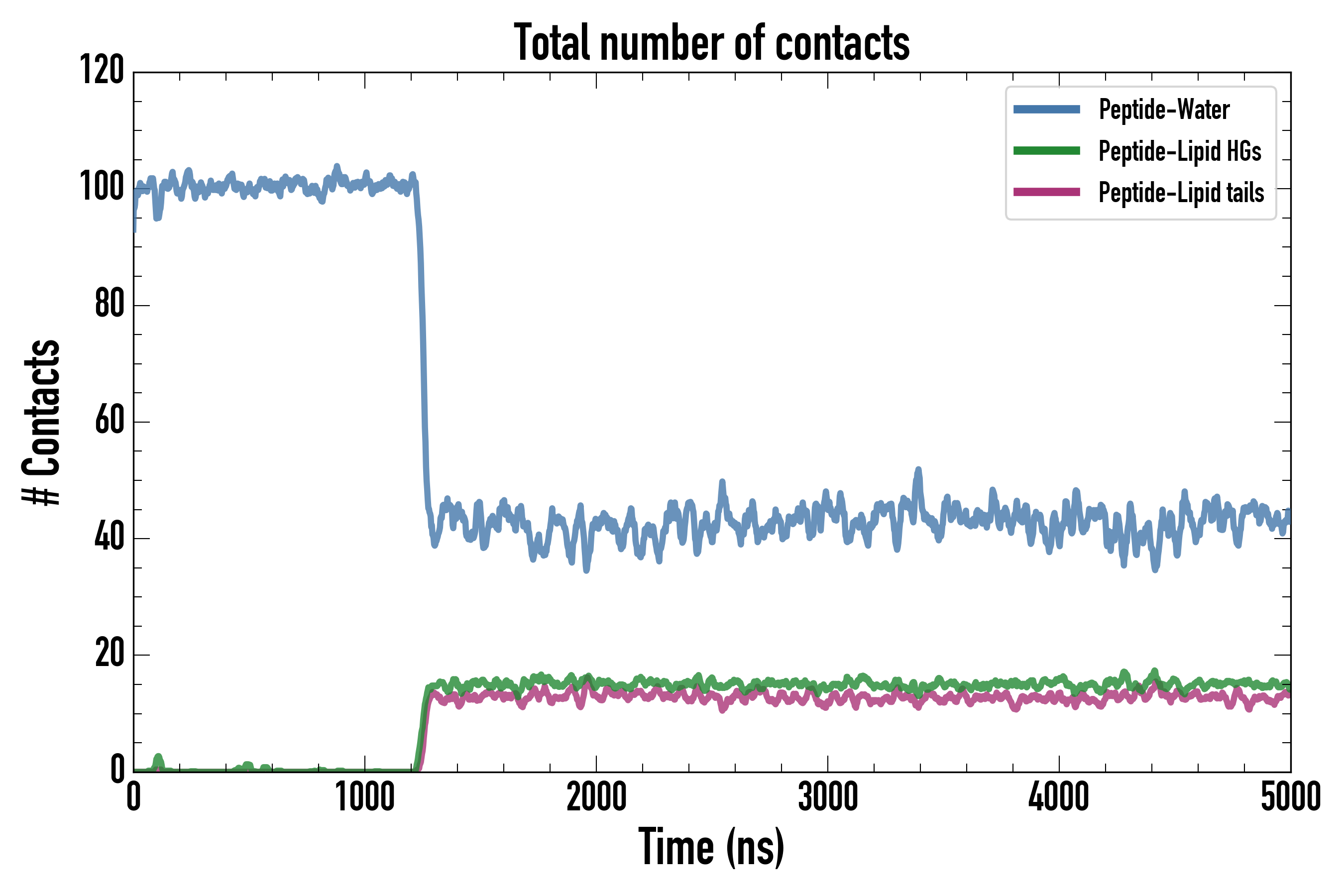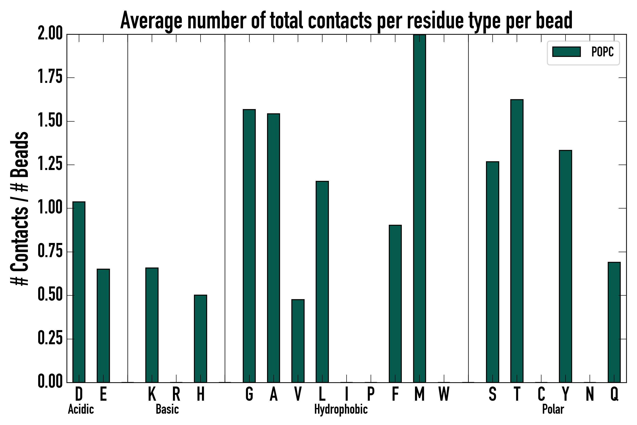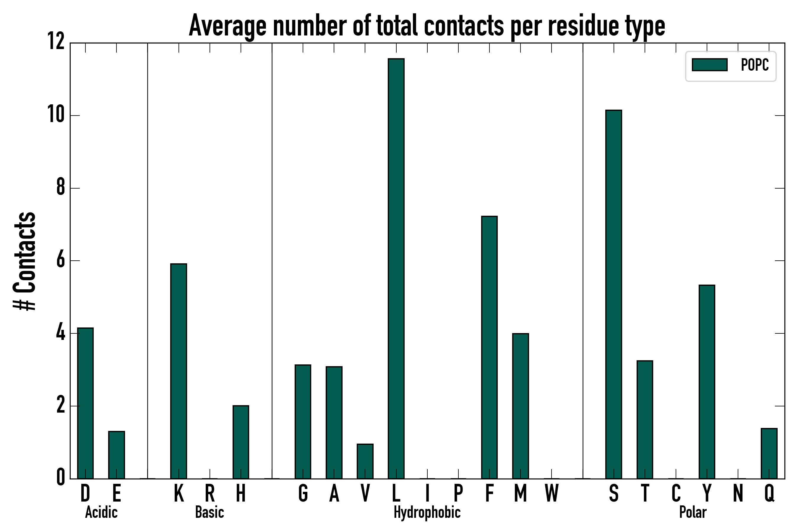 Number of contacts between each residue of the peptide backbone and the different lipid types, averaged over the last microsecond and using a cut-off of 0.6 nm.
