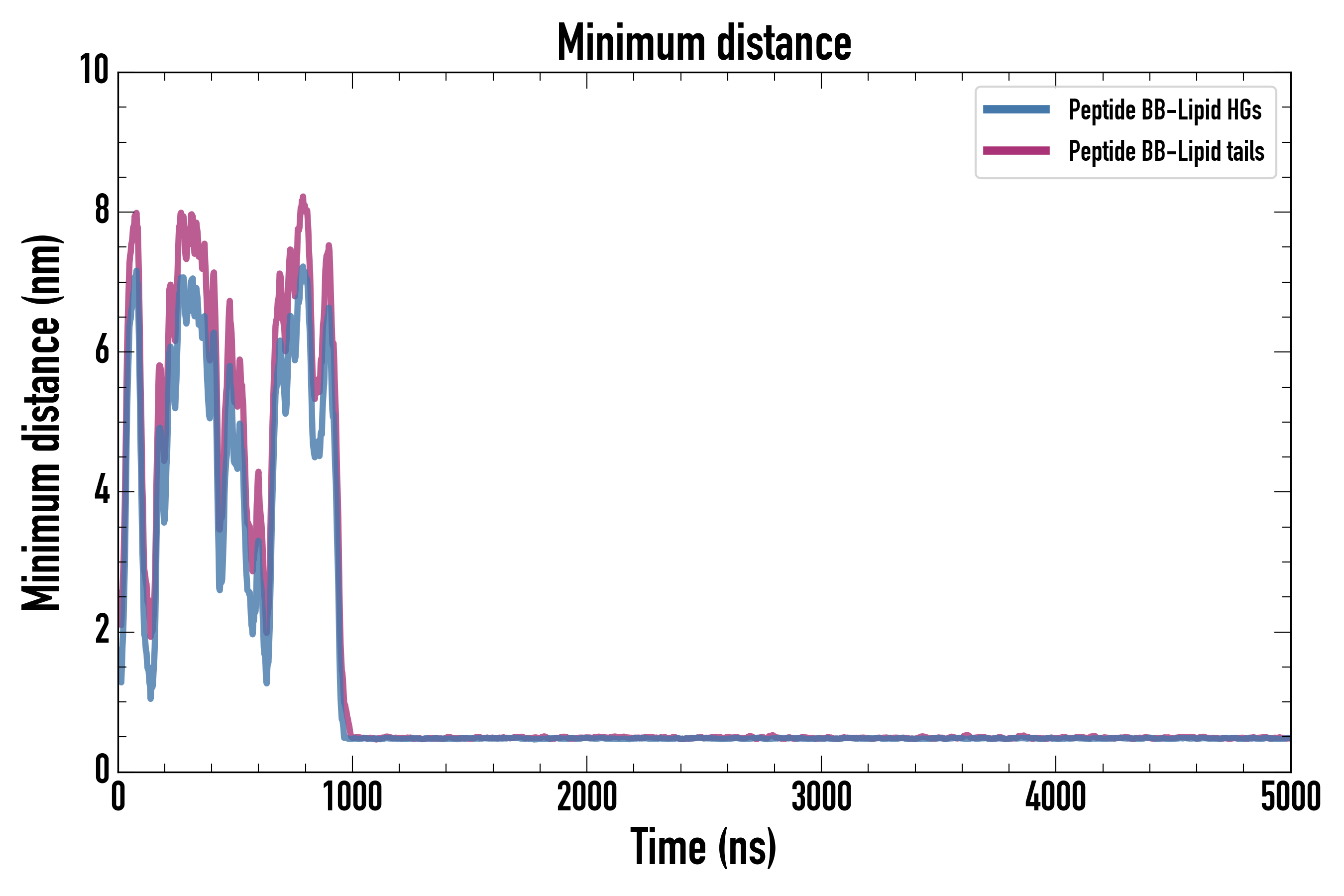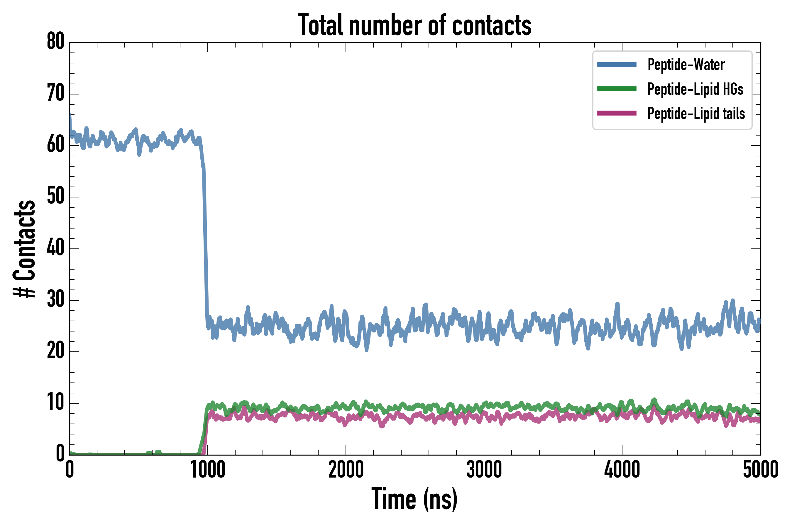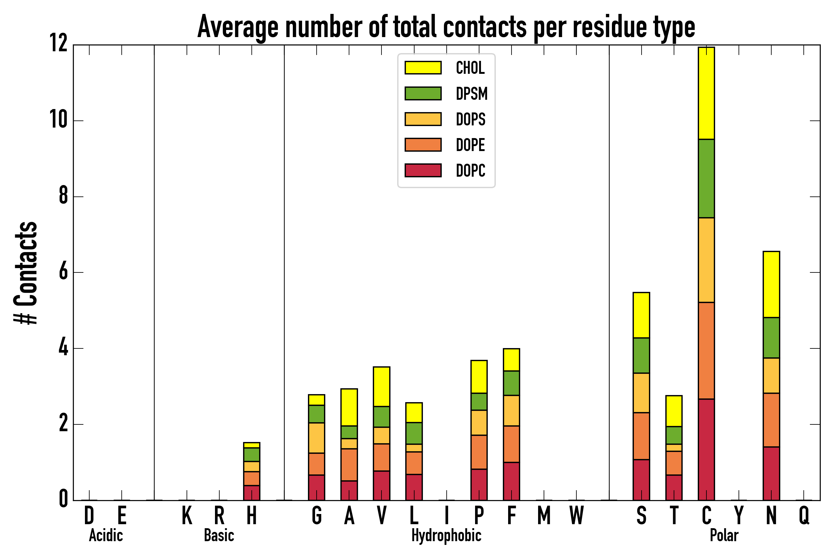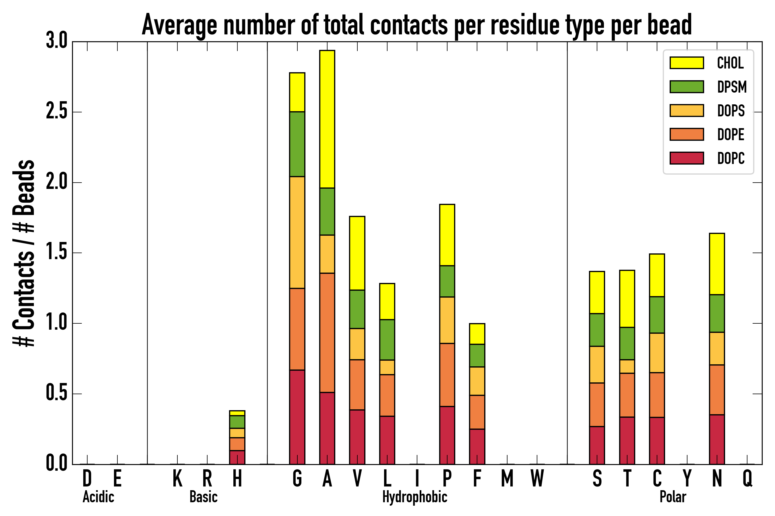 Number of contacts between each residue of the peptide backbone and the different lipid types, averaged over the last microsecond and using a cut-off of 0.6 nm.